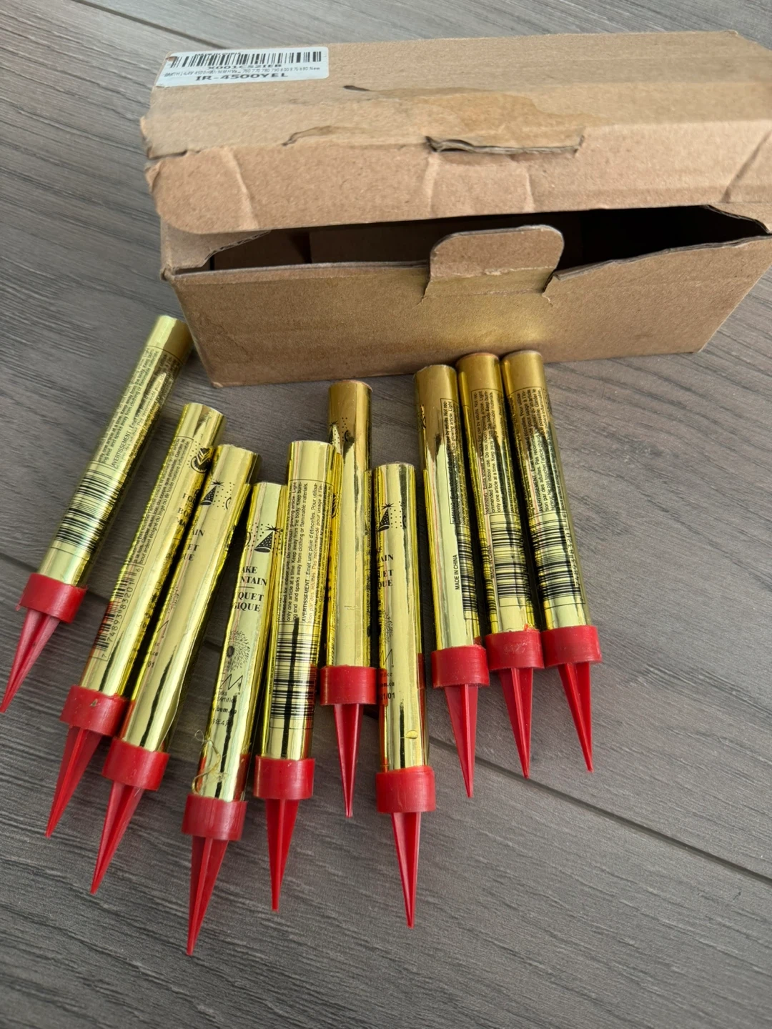 These fountain sparklers emit a rain of sparks! They're designed for outdoor use. Each sparkler has a red base with a spike for easy placement. Includes original box, though it's a bit worn.
