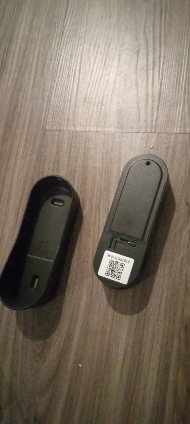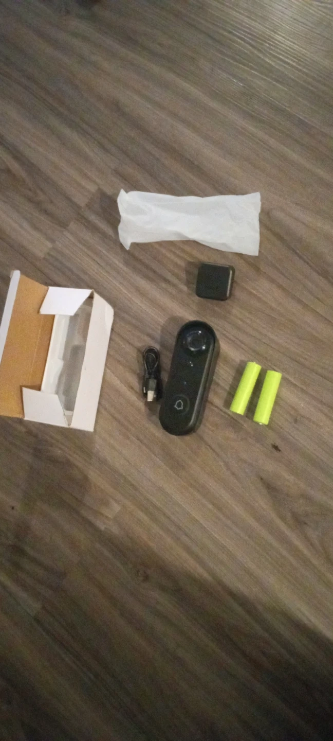 This smart video doorbell includes a camera for enhanced security. It comes with two rechargeable batteries and a charging cable. The device is black.