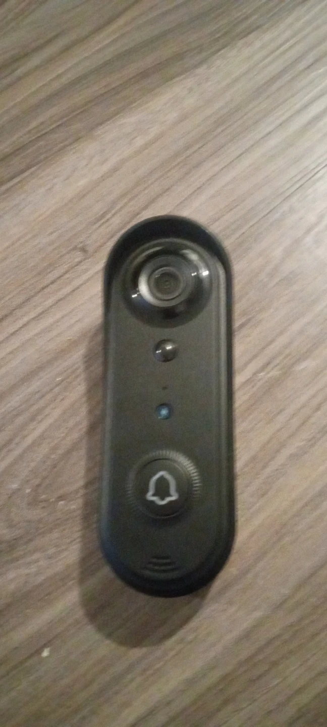 This smart video doorbell includes a camera for enhanced security. It comes with two rechargeable batteries and a charging cable. The device is black.