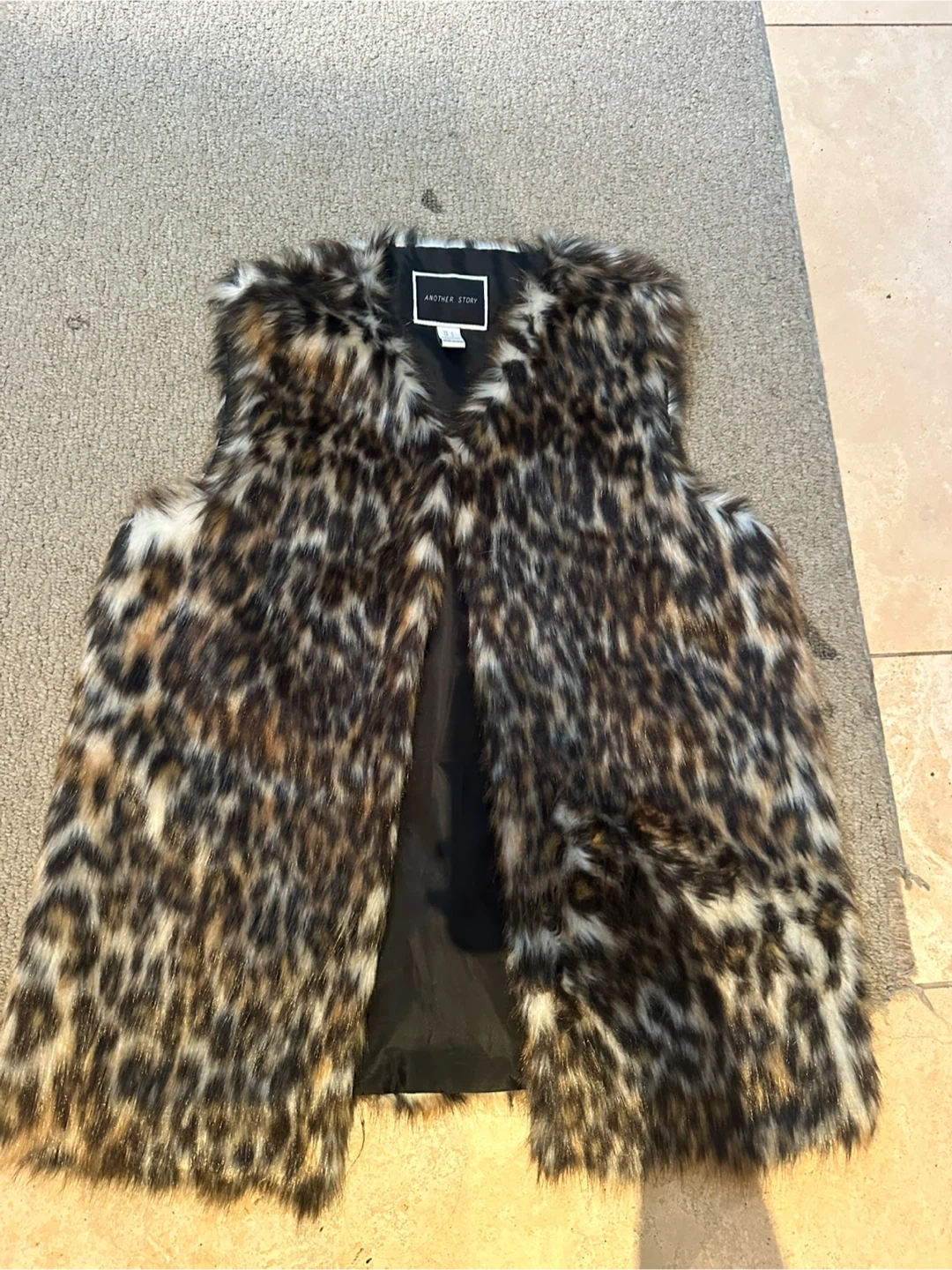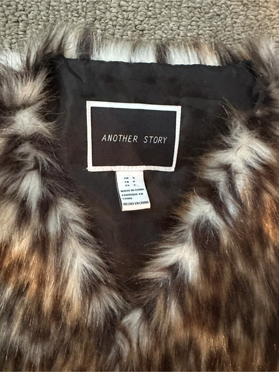 Selling a stylish faux fur vest from Another Story! It's a size small and features a unique animal print pattern. Perfect for adding a touch of flair to any outfit!