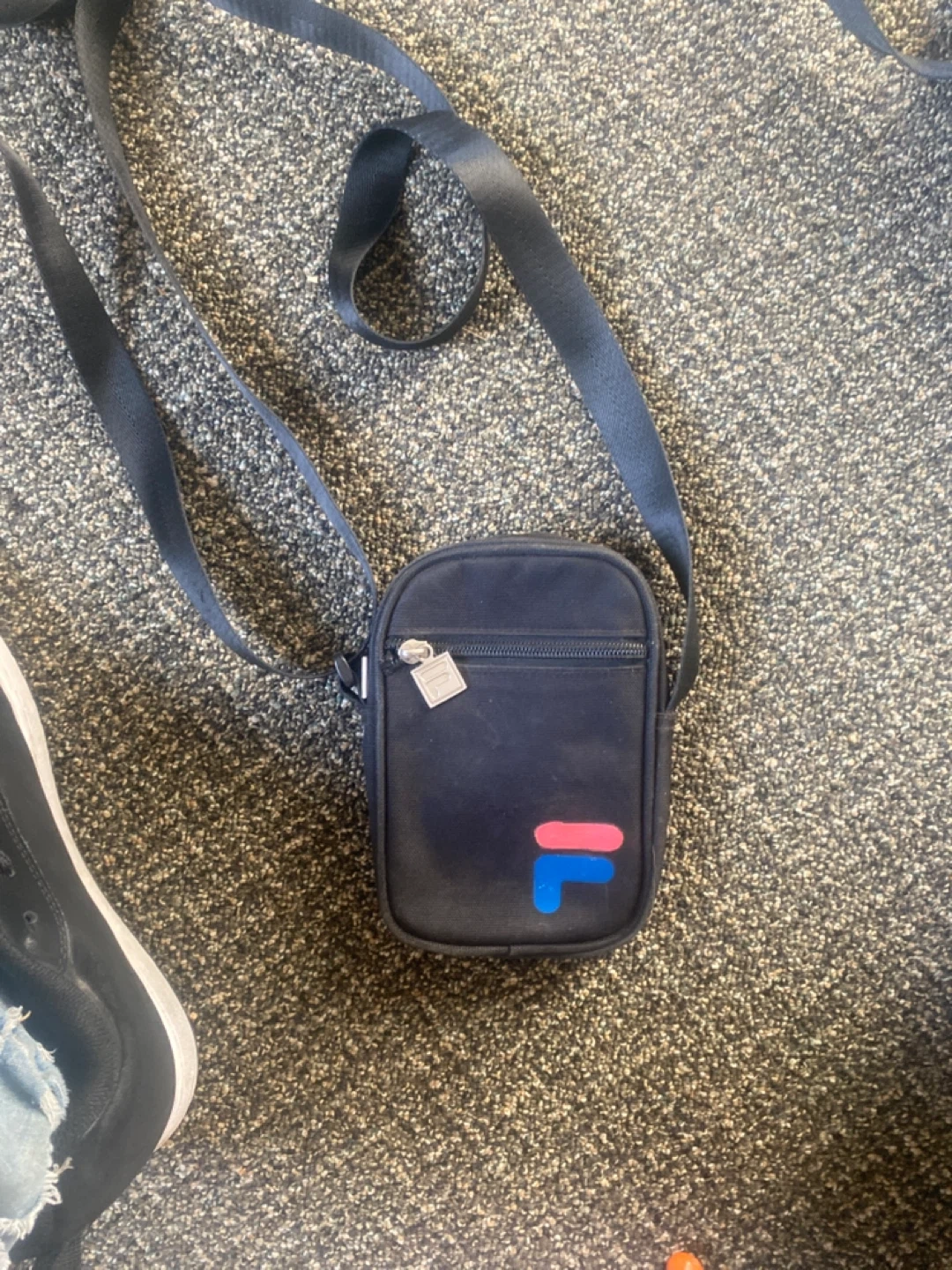 Navy Fila crossbody bag with pink and blue logo detail. It has a zippered main compartment and an adjustable strap. A handy bag for essentials!