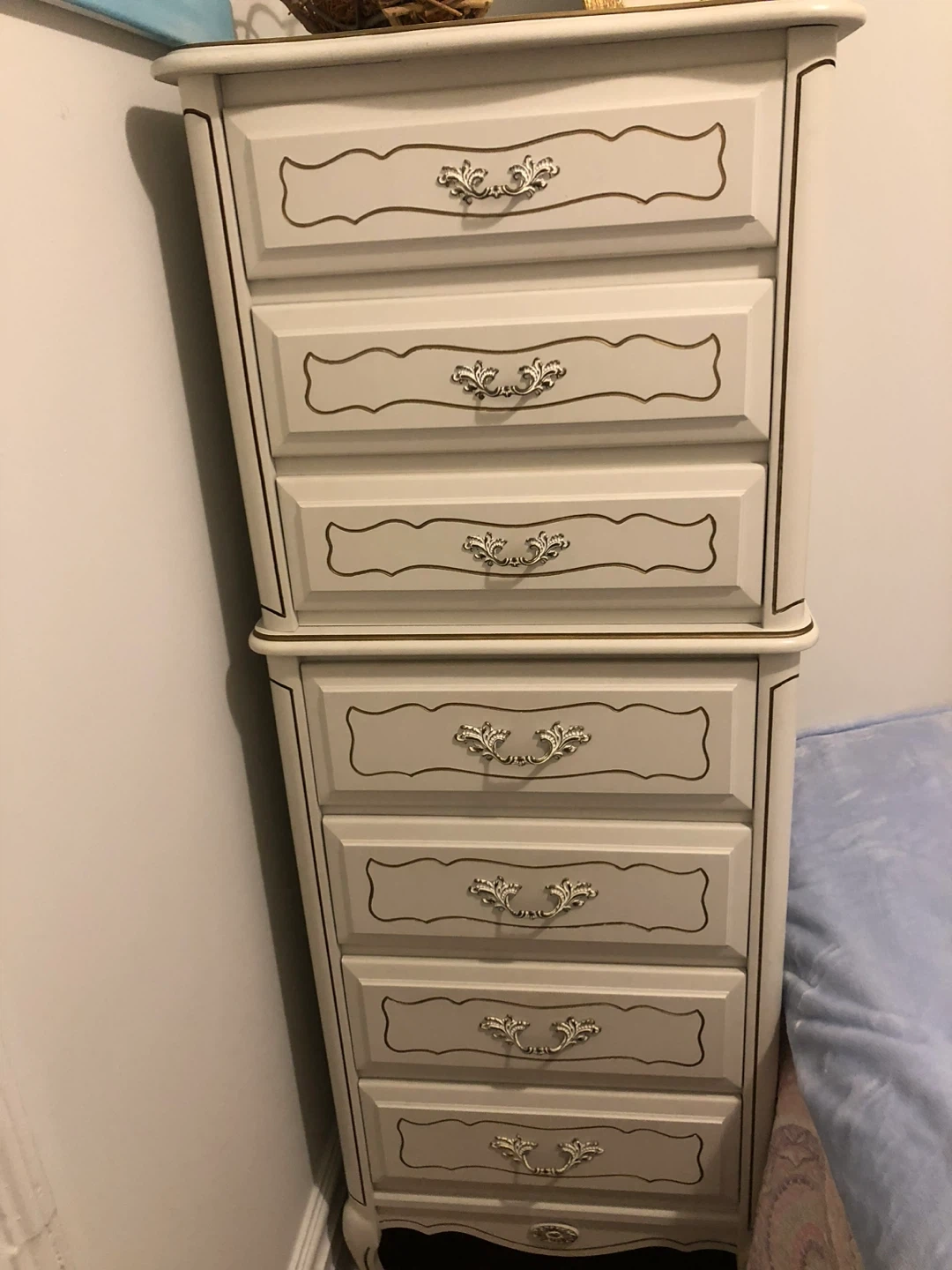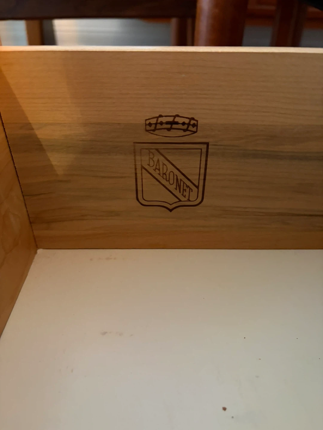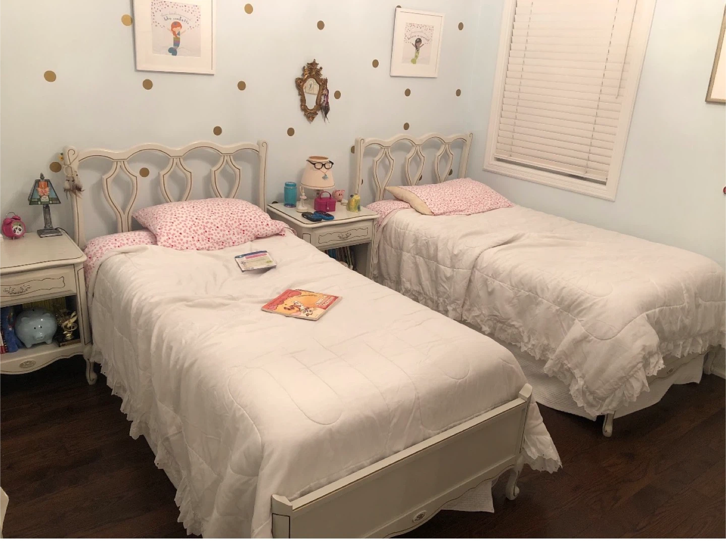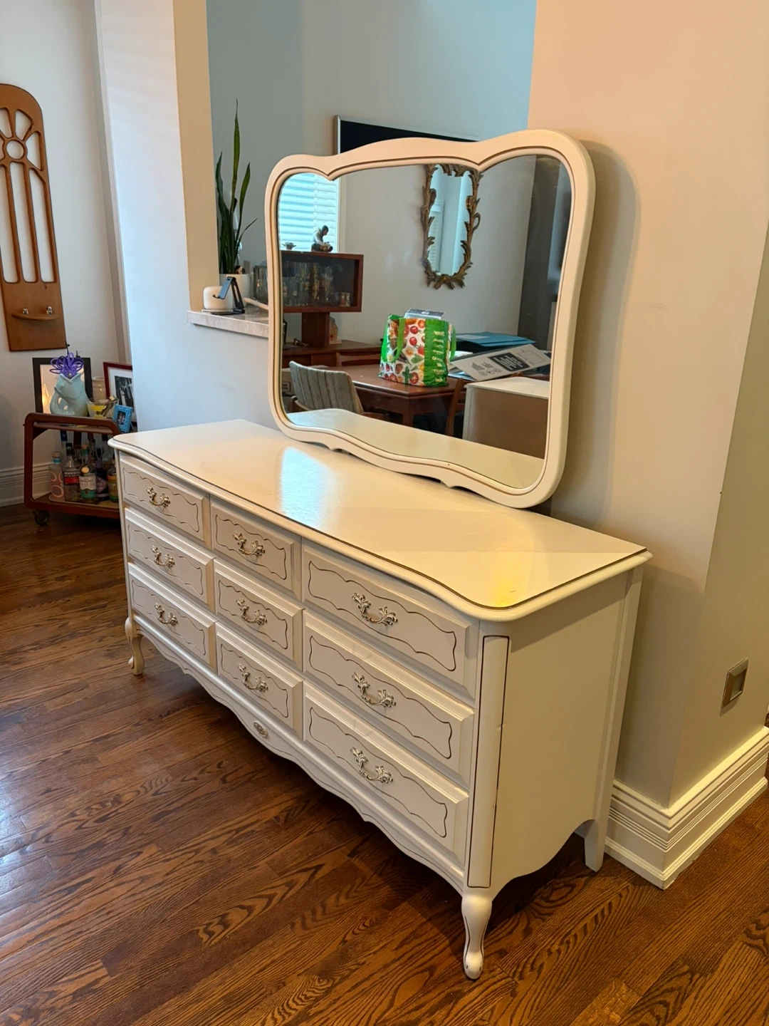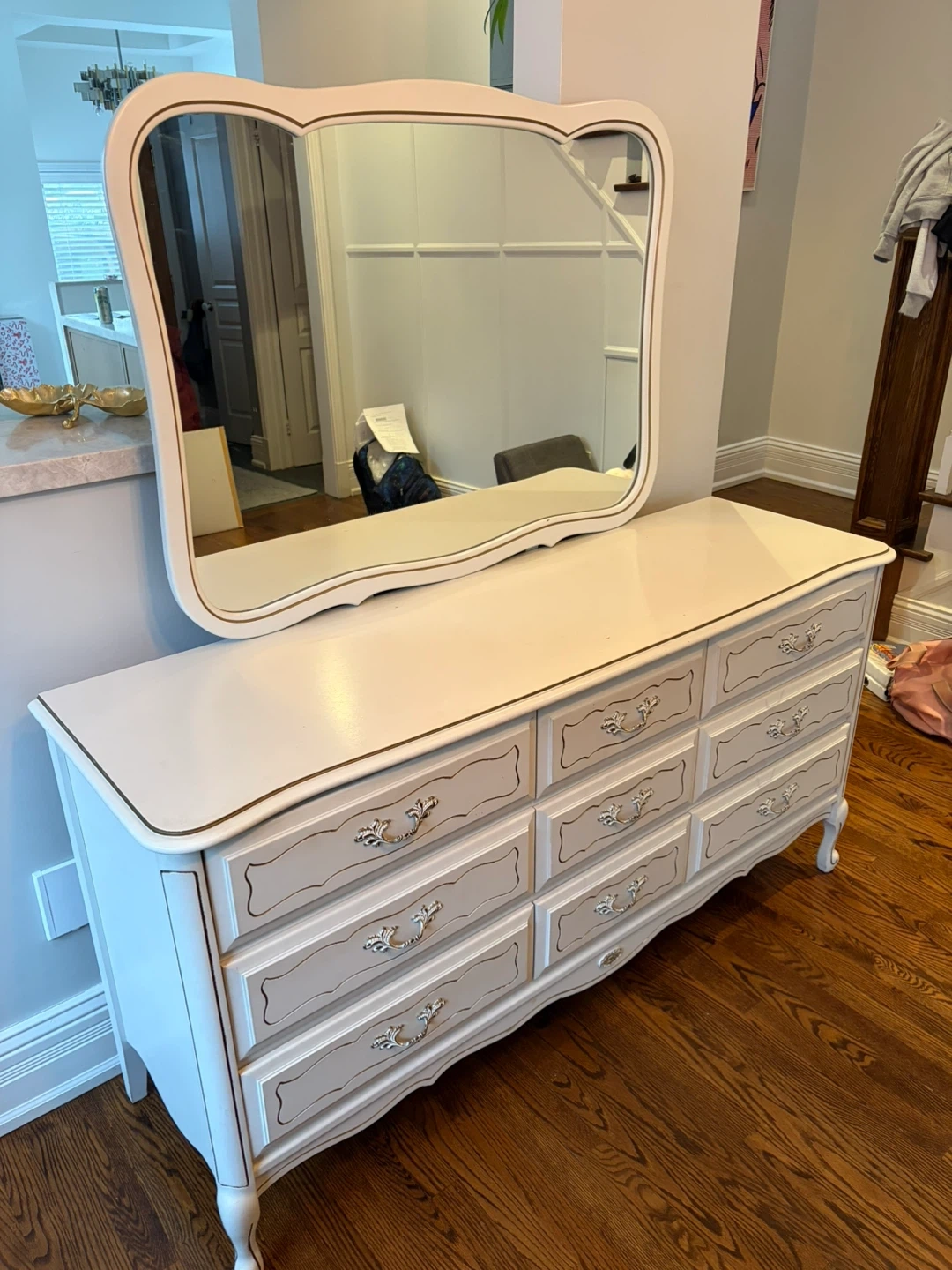 Original vintage Baronet complete bedroom set in the French Provincial style. Includes 2 twin beds (with rails), 2 nightstands, 1 dresser with large decorative mirror, 1 smaller dresser with matching hutch, and 1 lingerie chest. This 8-piece furniture set offers ample storage with multiple drawers. Definite signs of wear and tear as it is almost 40 years old but this Canadian brand is known for its solid maple wood, high-end construction. Can easily sand top and repaint. Great for two sisters sharing a bedroom.