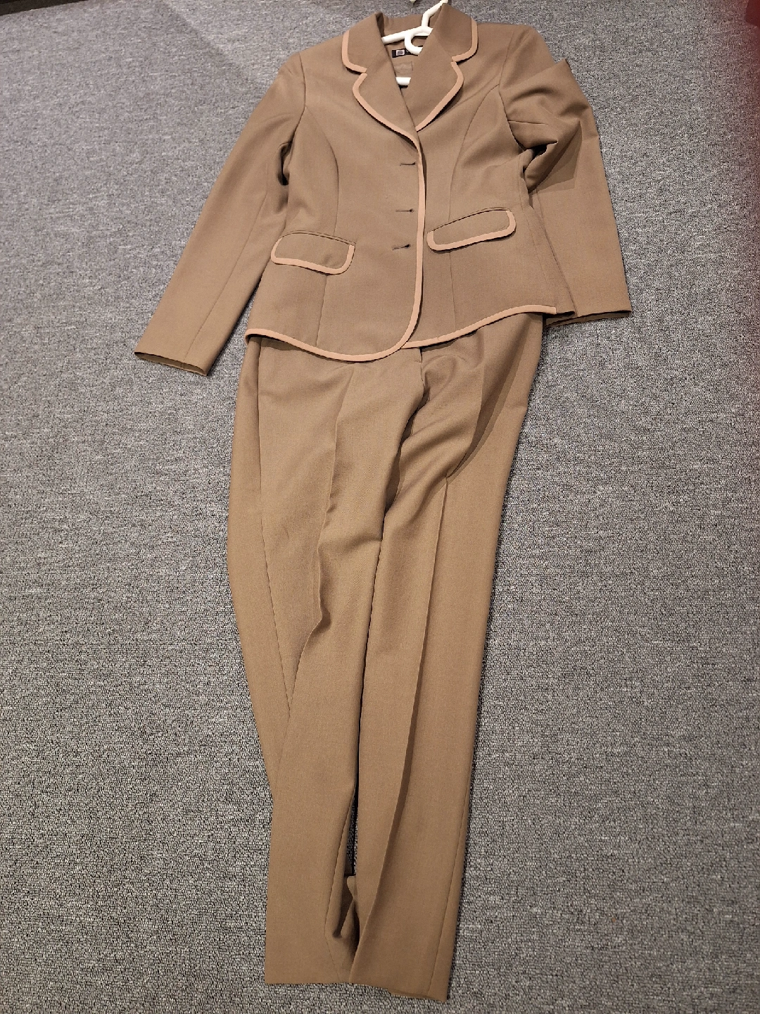 Selling a women's suit set in a lovely tan colour! The set includes a blazer and matching pants. It's in great condition and ready for a new home