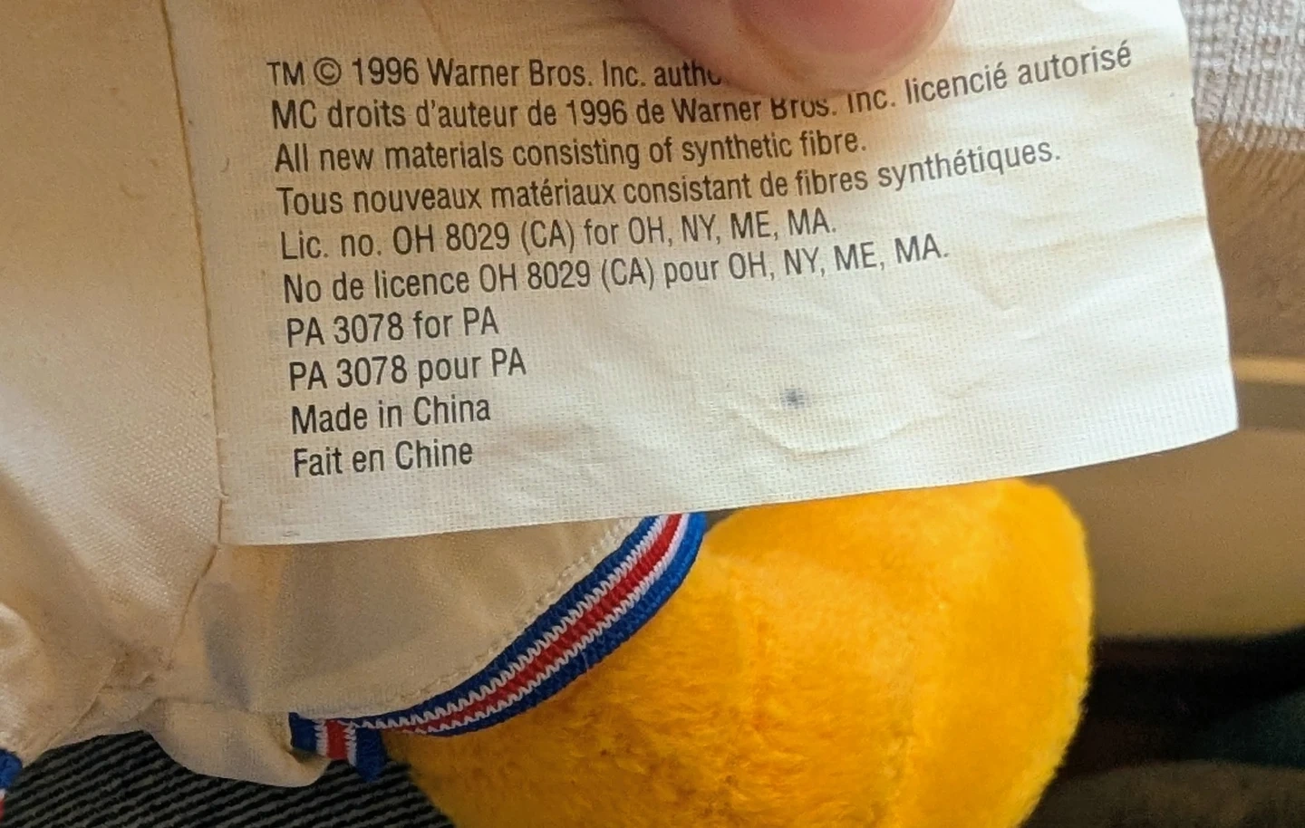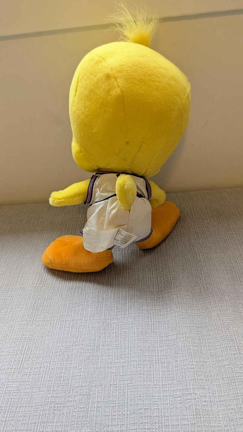 This is a Warner Bros. Tweety Bird plush toy from 1996. It's made with new polyester fibres and synthetic fibre fill. The plush measures approximately 12 inches tall.
