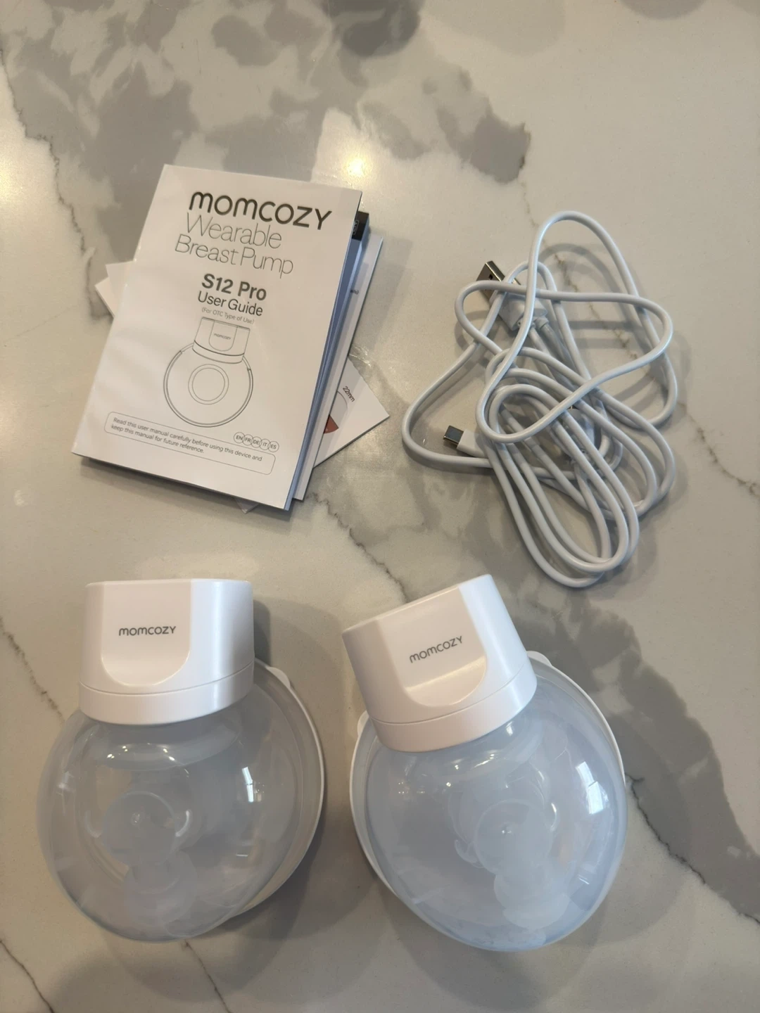 Momcozy S12 Pro wearable breast pump with USB charging cable and user guide. Includes two pump units. White color.