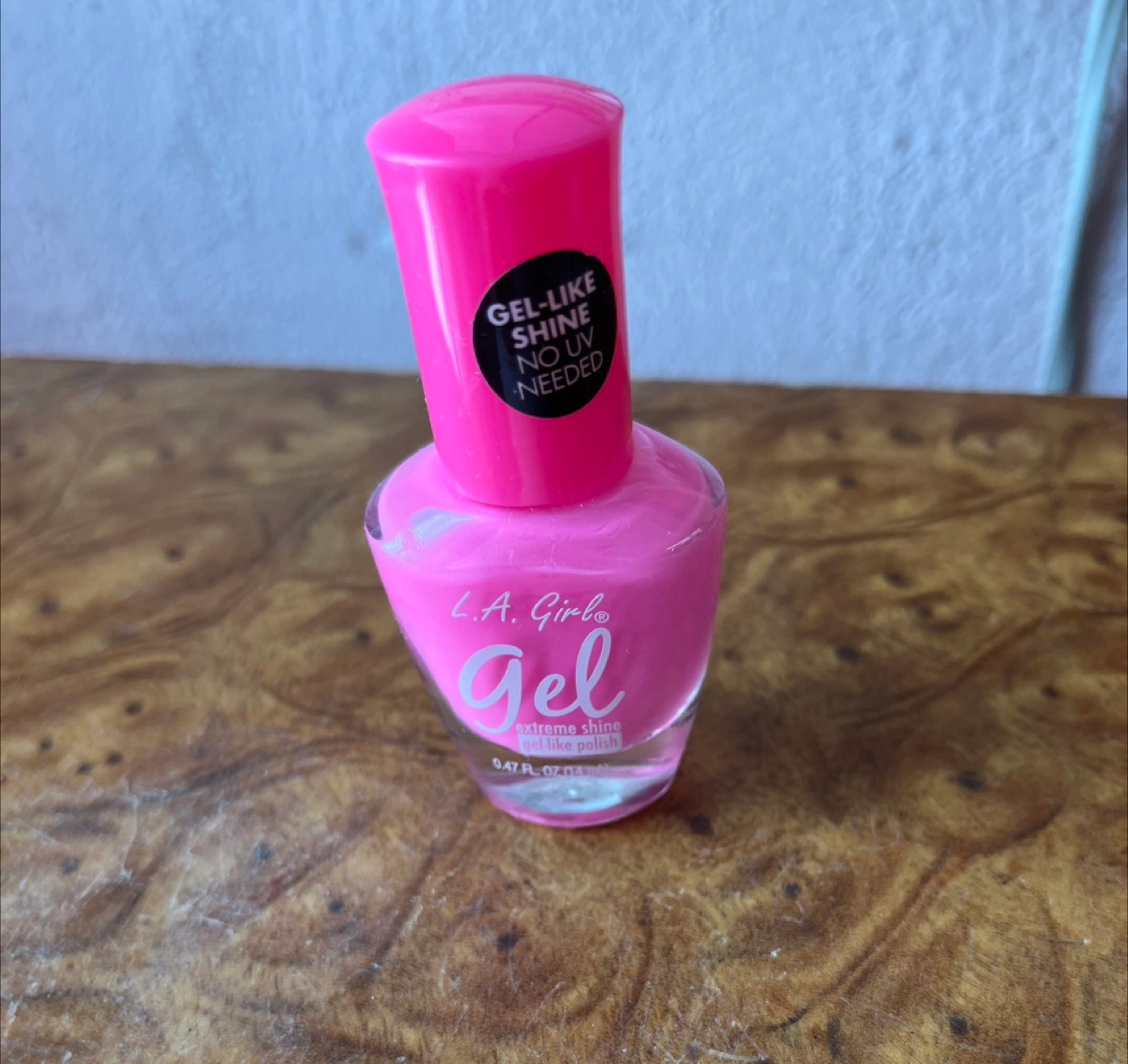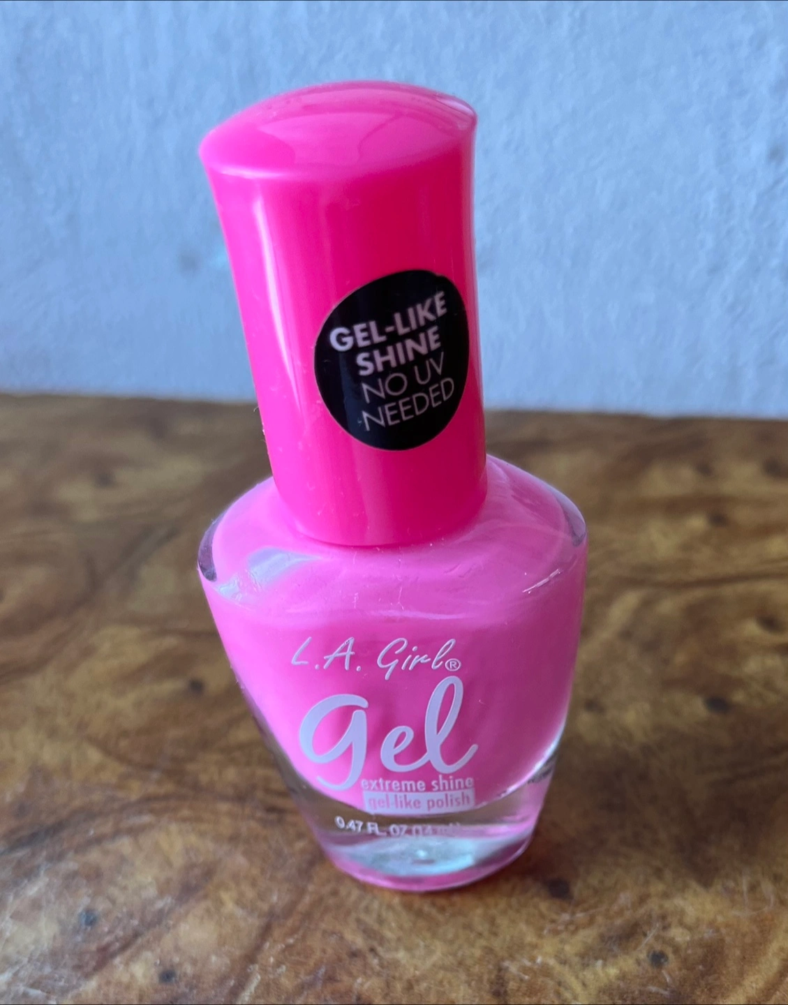 L.A. Girl Gel nail polish in a bright pink shade. It's an extreme shine gel-like polish with no UV needed. This bottle contains 0.47 FL. OZ. (14 ml) of polish.