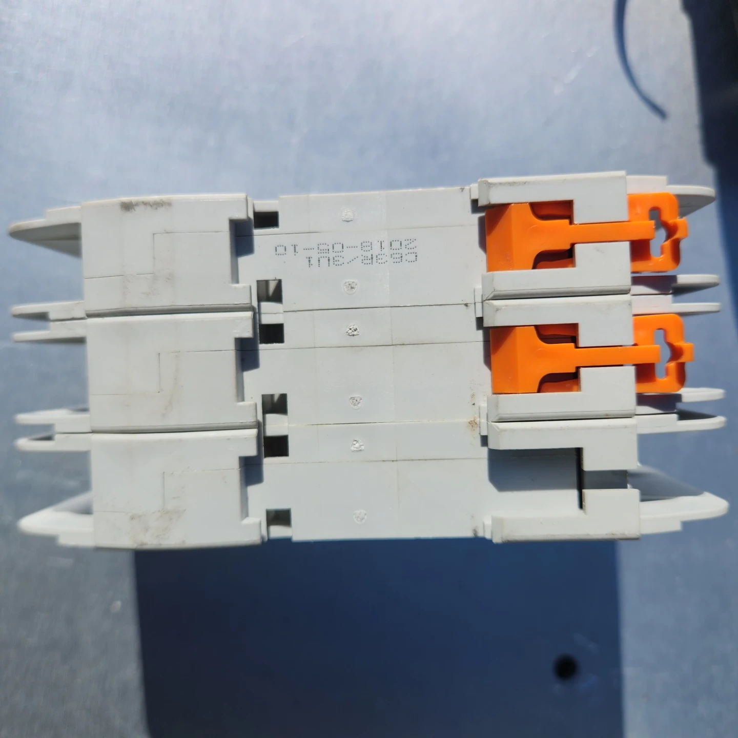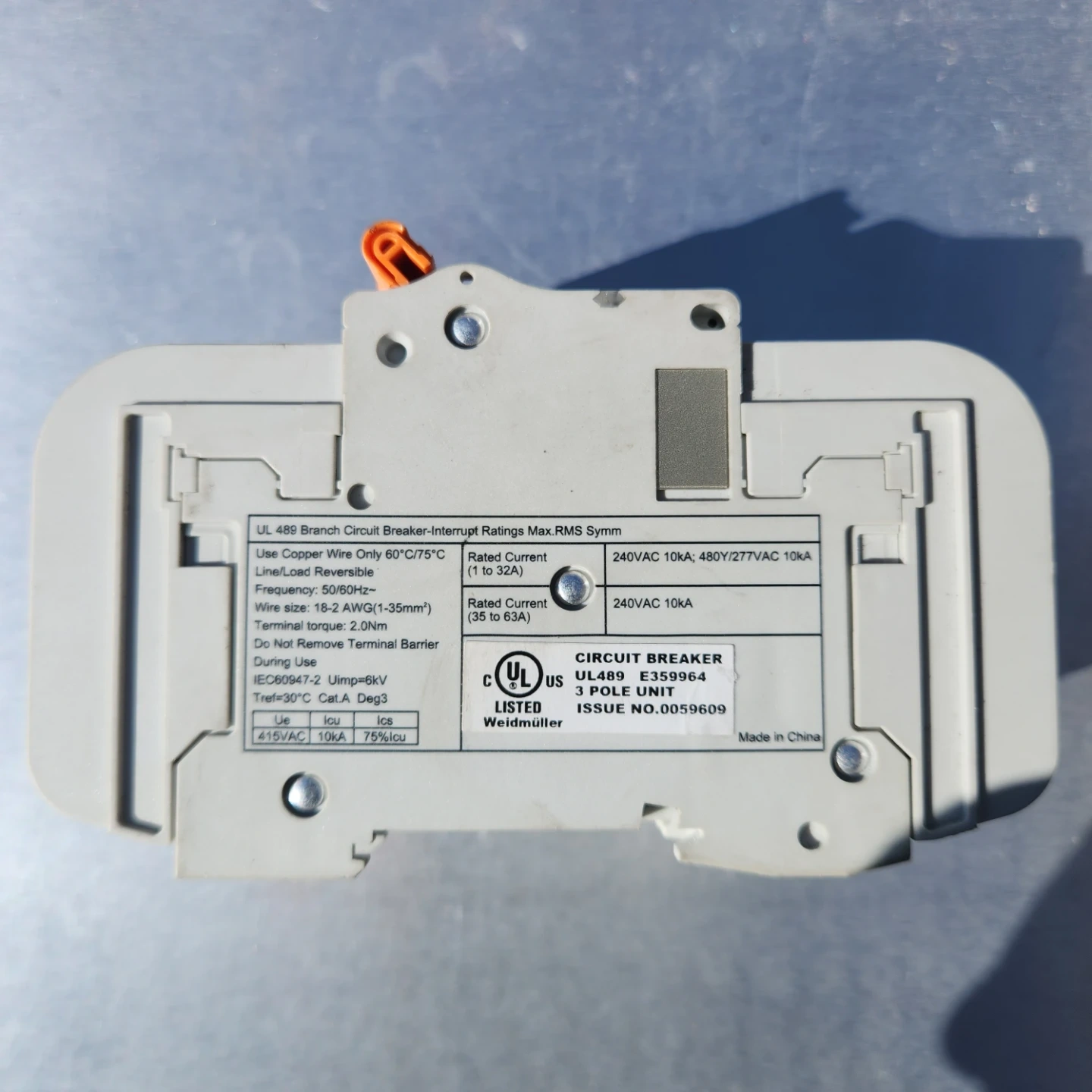 This is a Weidmüller 3-pole circuit breaker, model BR3C63UC C63. It has a rated current of 63A and an interrupt rating of 10kA. Manufactured in 2018. Uses copper wire only, 18-2 AWG