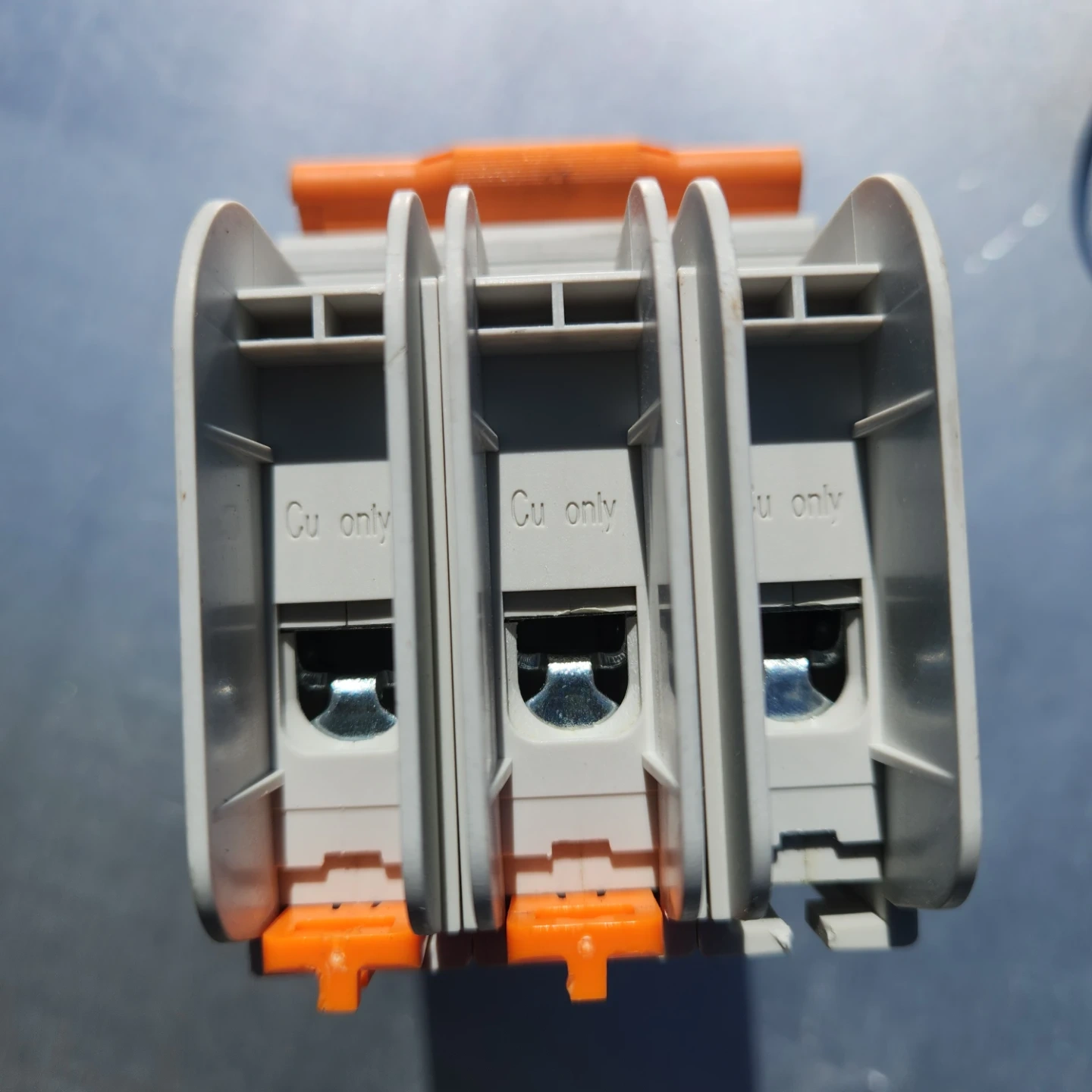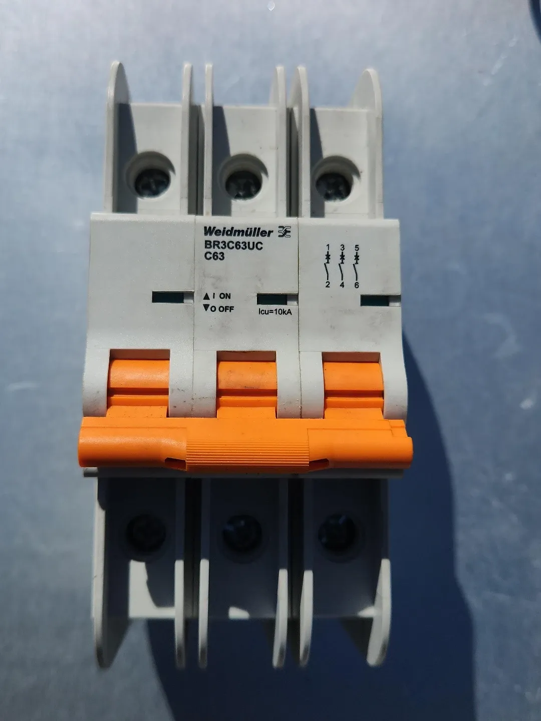 This is a Weidmüller 3-pole circuit breaker, model BR3C63UC C63. It has a rated current of 63A and an interrupt rating of 10kA. Manufactured in 2018. Uses copper wire only, 18-2 AWG