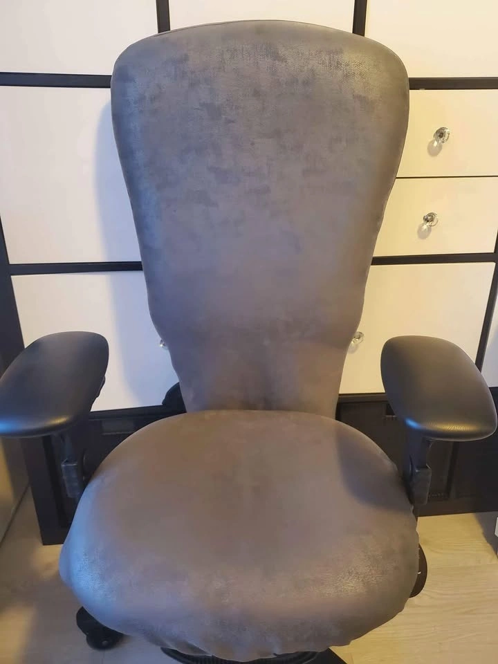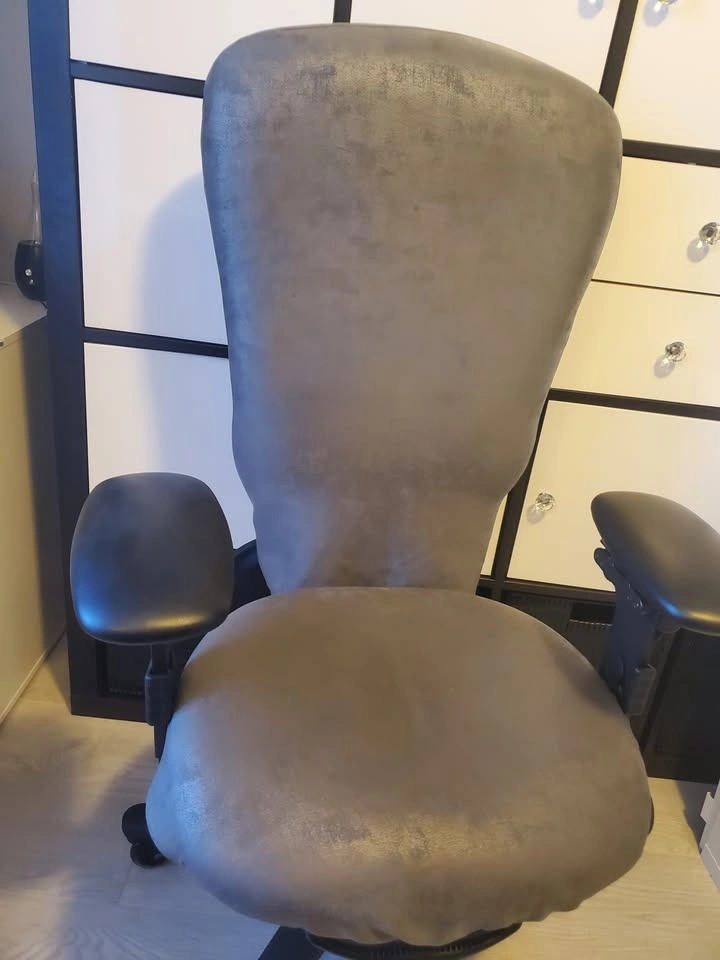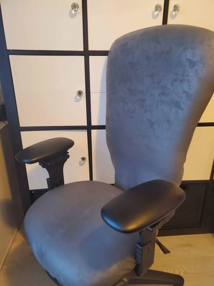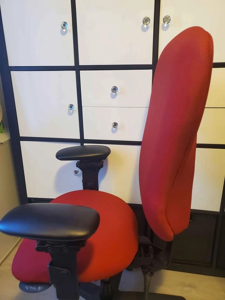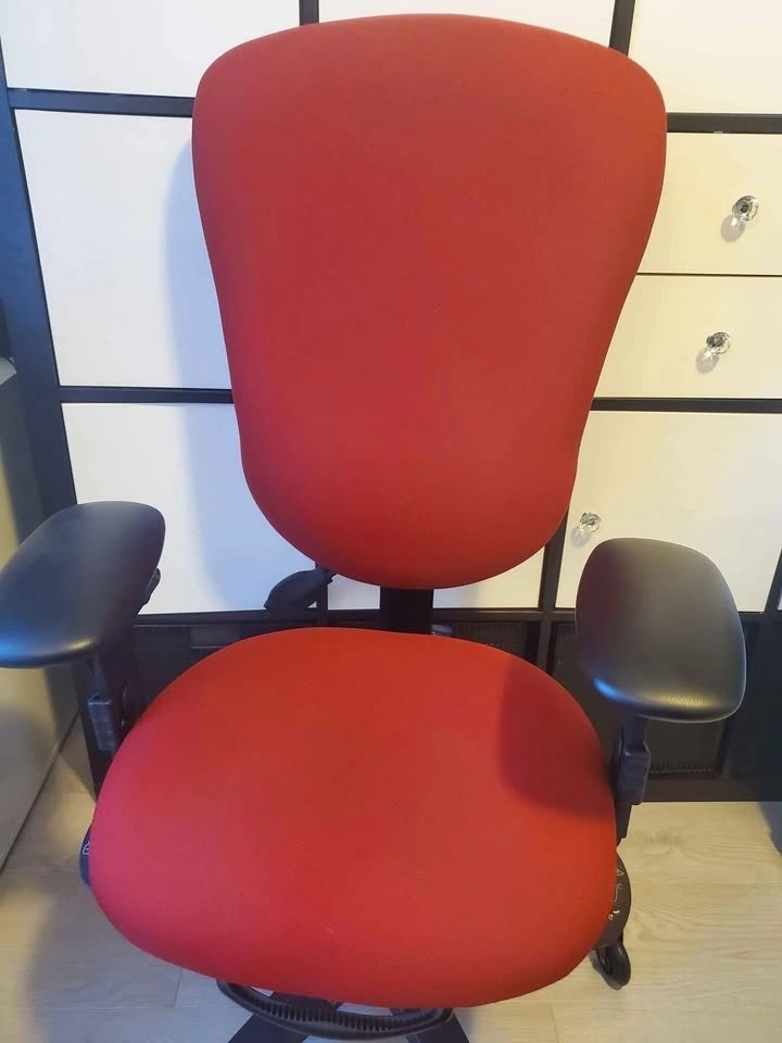 Ergocentric Chair. Great chair with ergonomic options such as adjustable arm (width), pneumatic lift, small seat, lumbar pump, etc. Ideal for individuals with back or lumbar pain or people who are looking to get a proper sitting posture while working at their desk. The original color is red, but the handmade cover is grey.