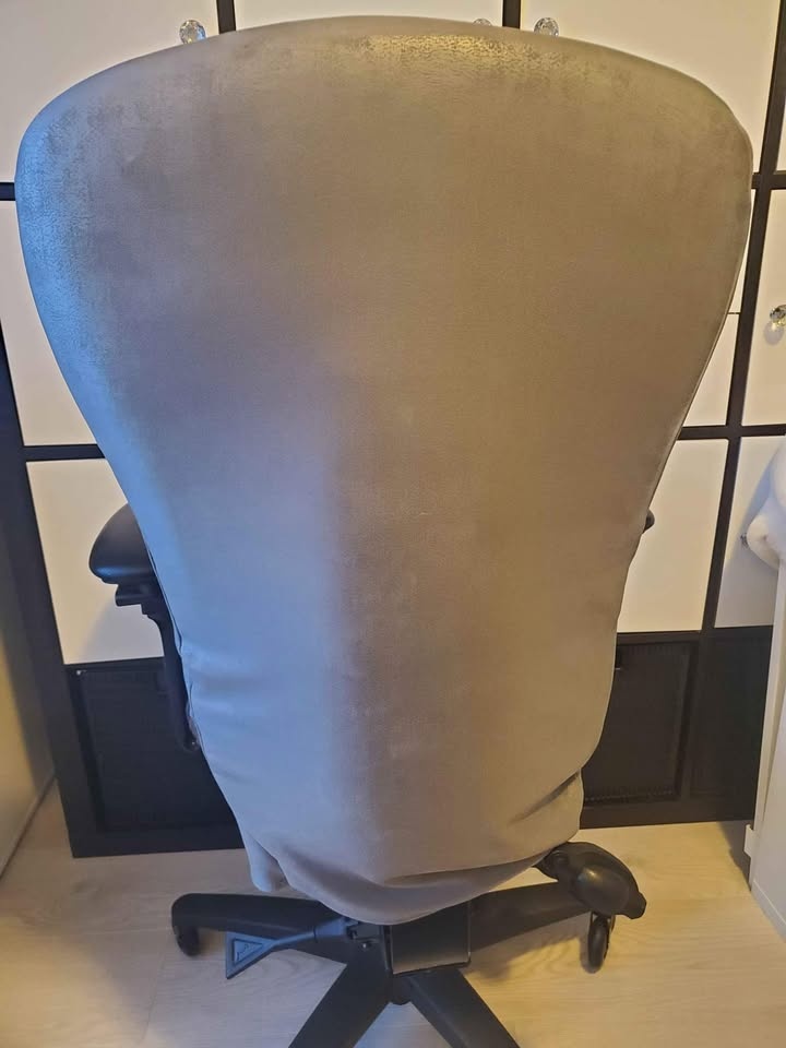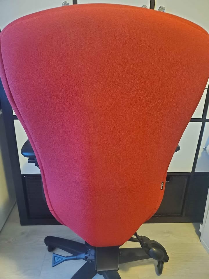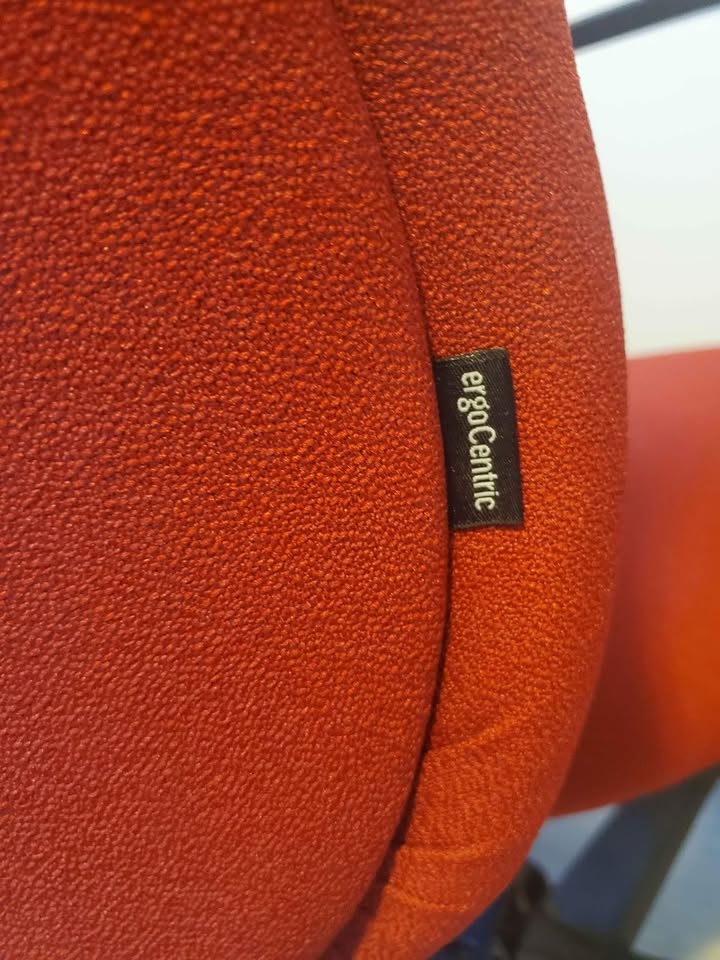 Ergocentric Chair. Great chair with ergonomic options such as adjustable arm (width), pneumatic lift, small seat, lumbar pump, etc. Ideal for individuals with back or lumbar pain or people who are looking to get a proper sitting posture while working at their desk. The original color is red, but the handmade cover is grey.