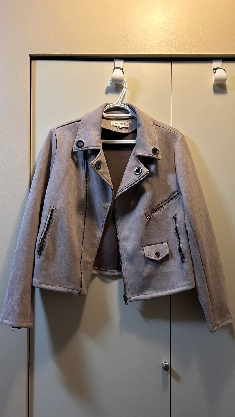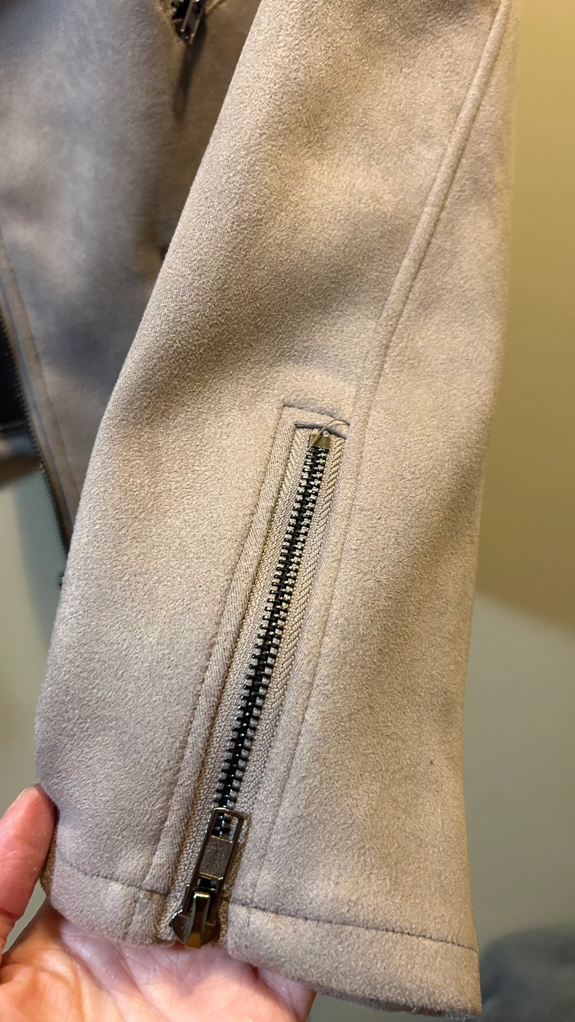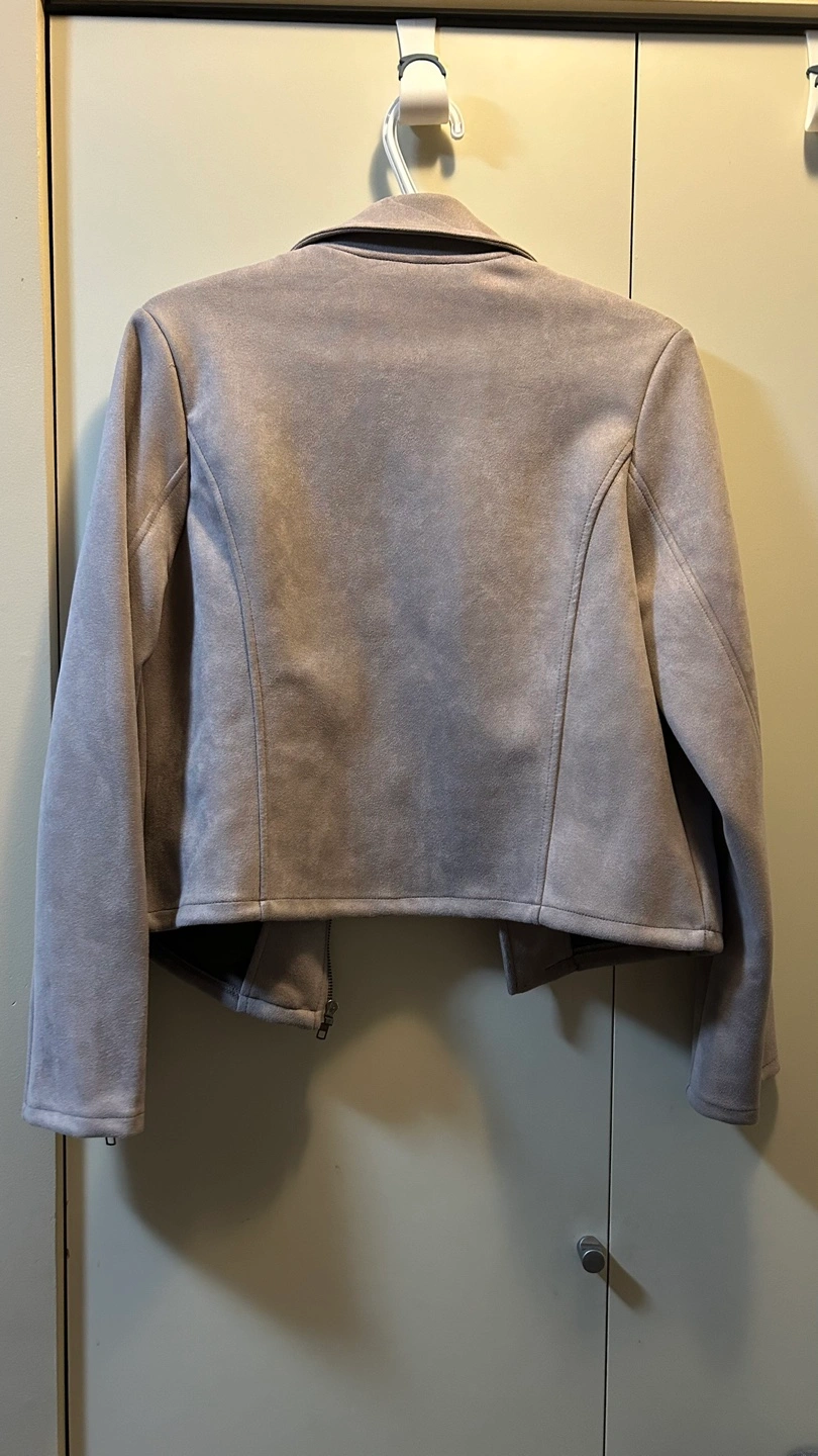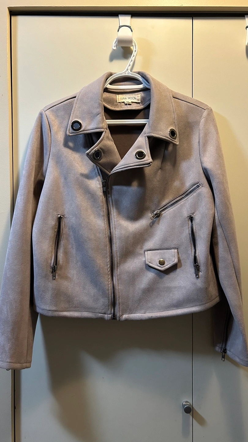 Grey suede moto jacket with zipper closure and two front pockets. Zipper detail along the sleeves. Pickup Richmond center or blundell area