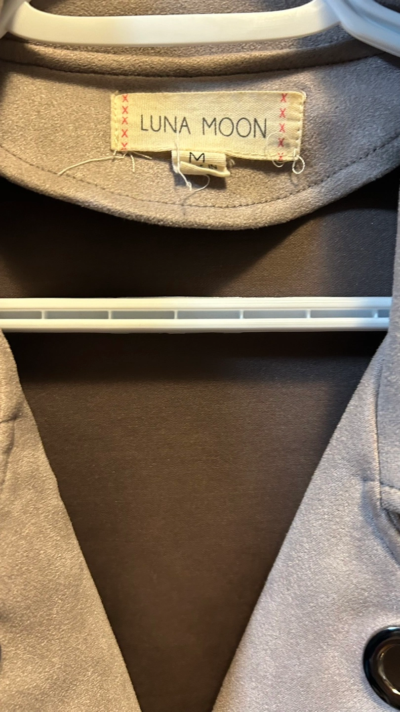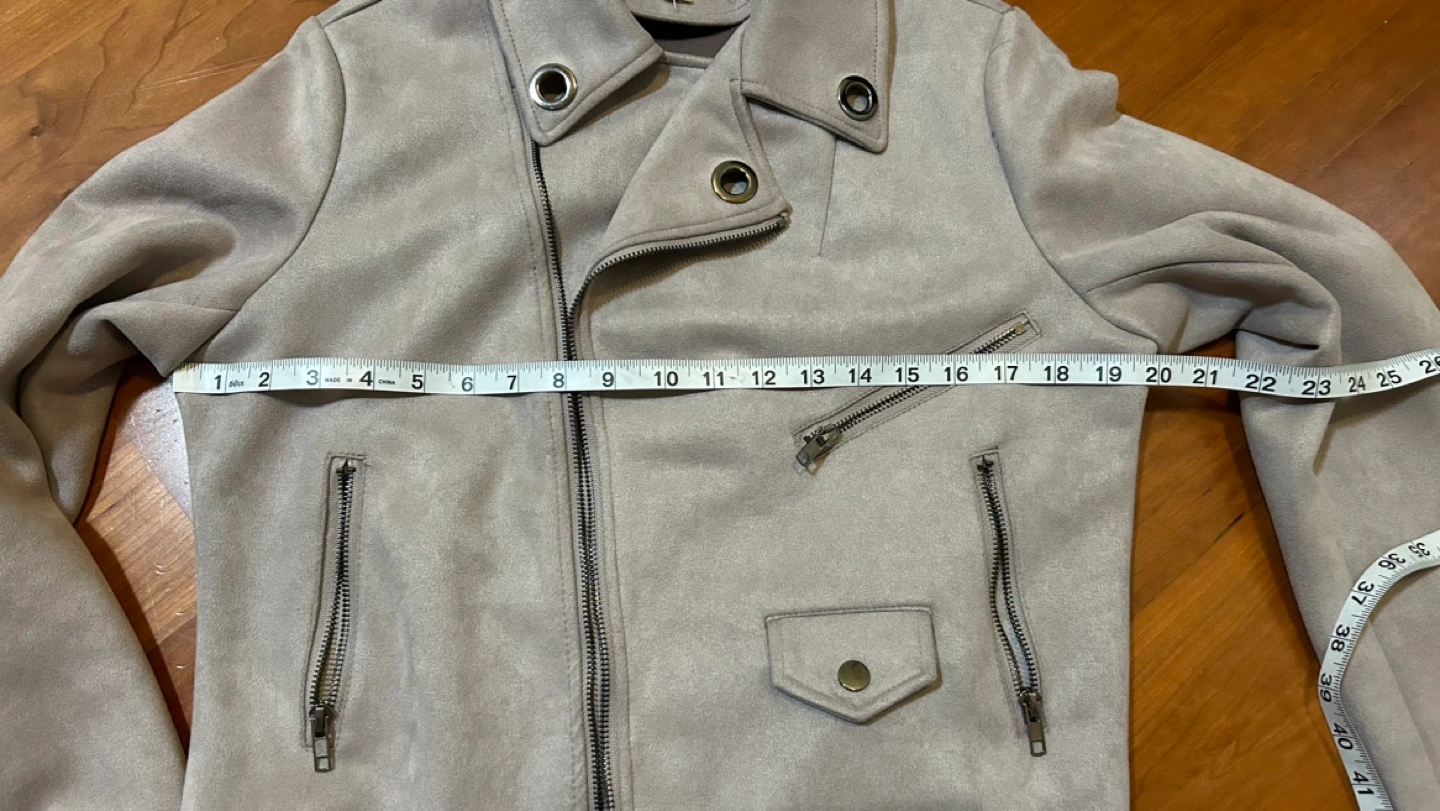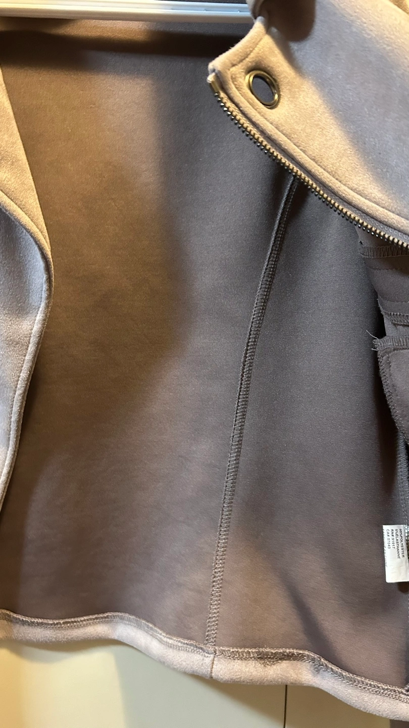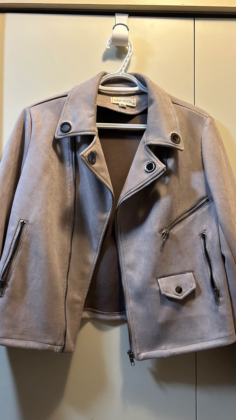 Grey suede moto jacket with zipper closure and two front pockets. Zipper detail along the sleeves. Pickup Richmond center or blundell area