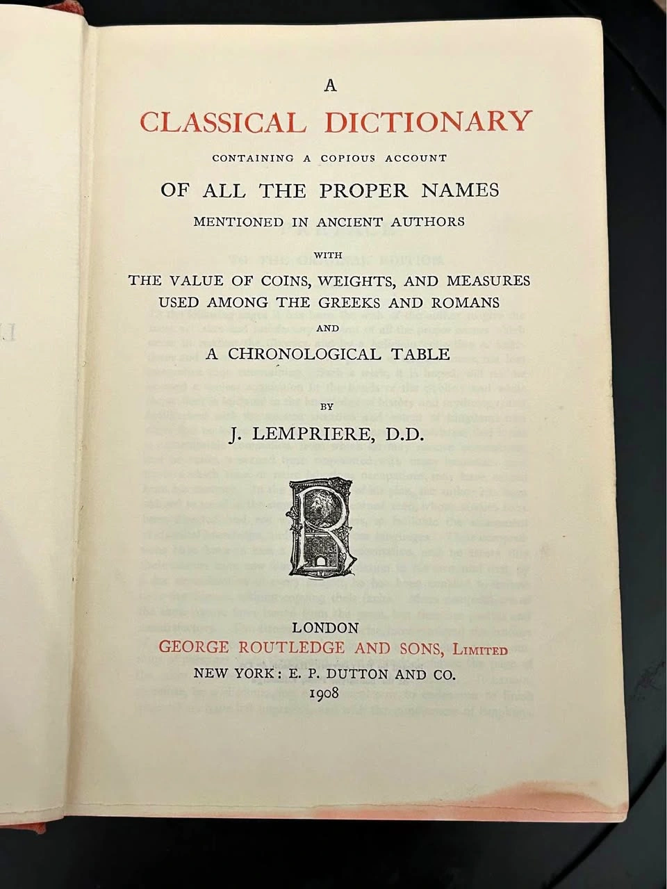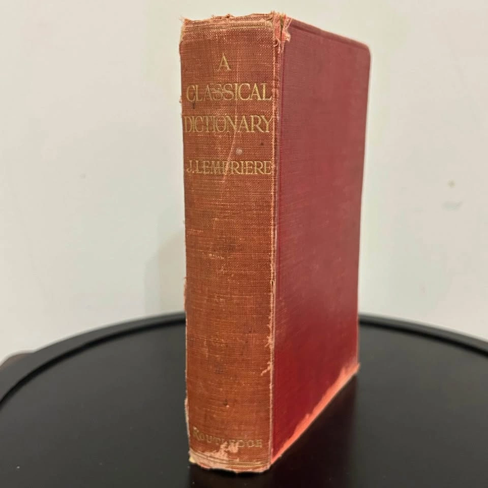 670Antique 1908 edition of “A Classical Dictionary Containing a Copious Account of All the Proper Names Mentioned in Ancient Authors” by J. Lempriere, D.D. Printed in London by George Routledge and Sons, Limited; distributed in New York by E. P. Dutton & Co., 1908. A valuable reference book on Greek and Roman mythology, history, and classical literature, including the value of coins, weights, and measures, plus a chronological table. This copy has a personal inscription (“Archibald R. Michie, Cedar Cottage”) and handwritten classical notes, adding historical character. Original red cloth hardcover shows visible wear, edge fraying, and water stains, but all pages remain intact and legible — a genuine piece of early 20th-century scholarship. • Publisher: George Routledge and Sons, Limited (London), 1908 • Language: English • Binding: Red cloth hardcover • Condition: Fair antique condition with age wear, stains, and spine wear (see photos) Pick up in the Seton area, Calgary. See also my other lots. Open to your questions and suggestions. If necessary, I provide additional photos. These are not new things, so please look carefully at the photos and videos. Sizes are submitted on request and also using a tape measure in the photo.