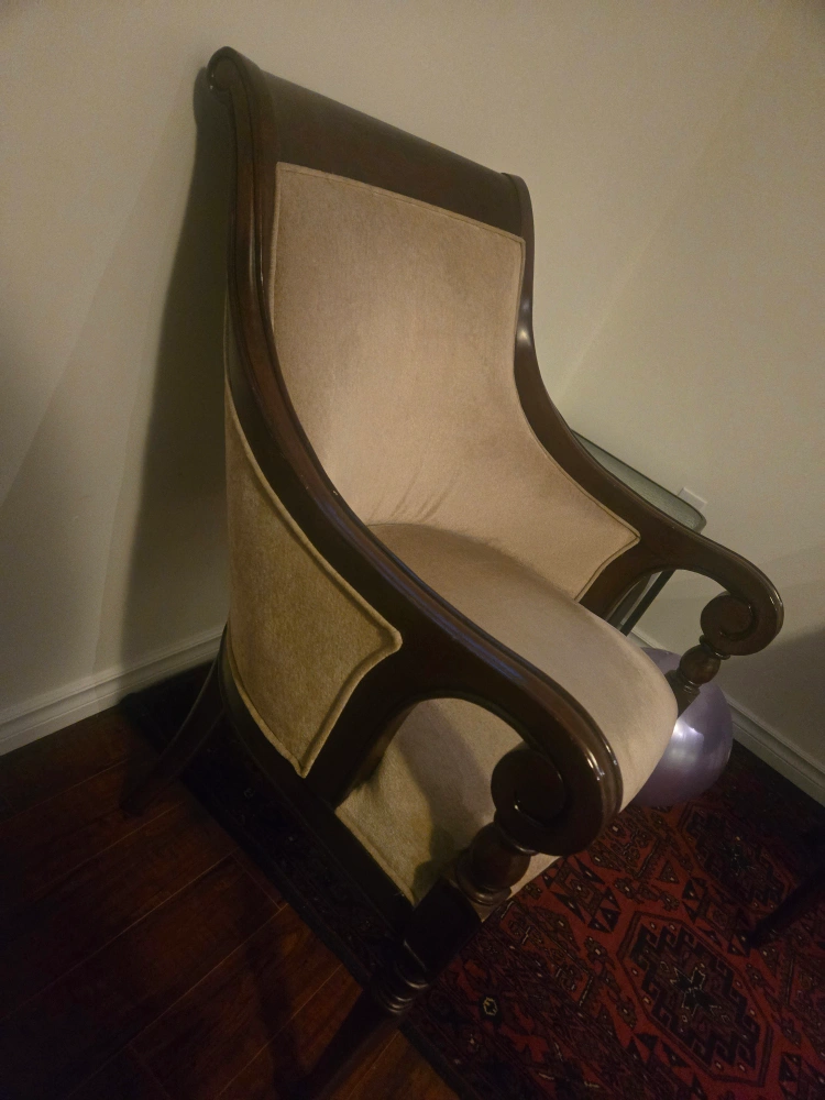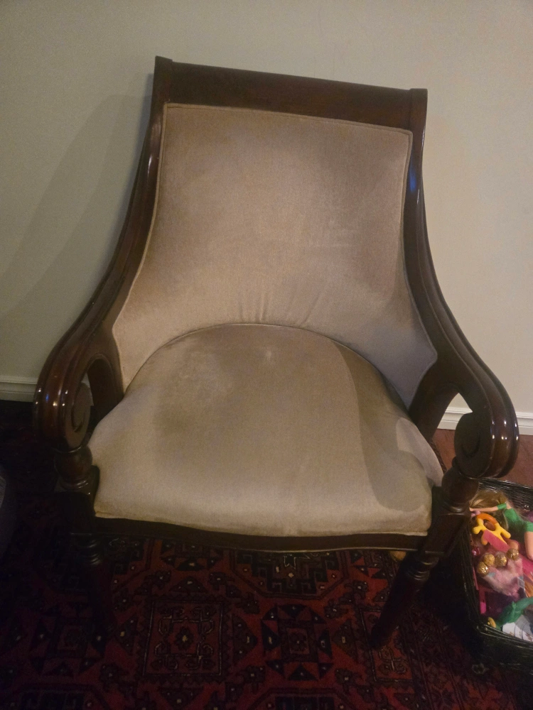 This is a beautiful antique armchair with a beige fabric seat and back. The frame is made of dark wood with elegant curved armrests. It would be a lovely addition to any living room or study!