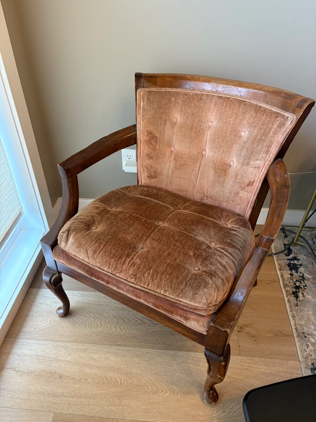 10Selling 2 x matching lovely antique armchair! It features a velvet seat and back, with a wooden frame. It's a charming accent piece for any room. There are some signs of wear and tear, as pictured, so perfect for a project.
