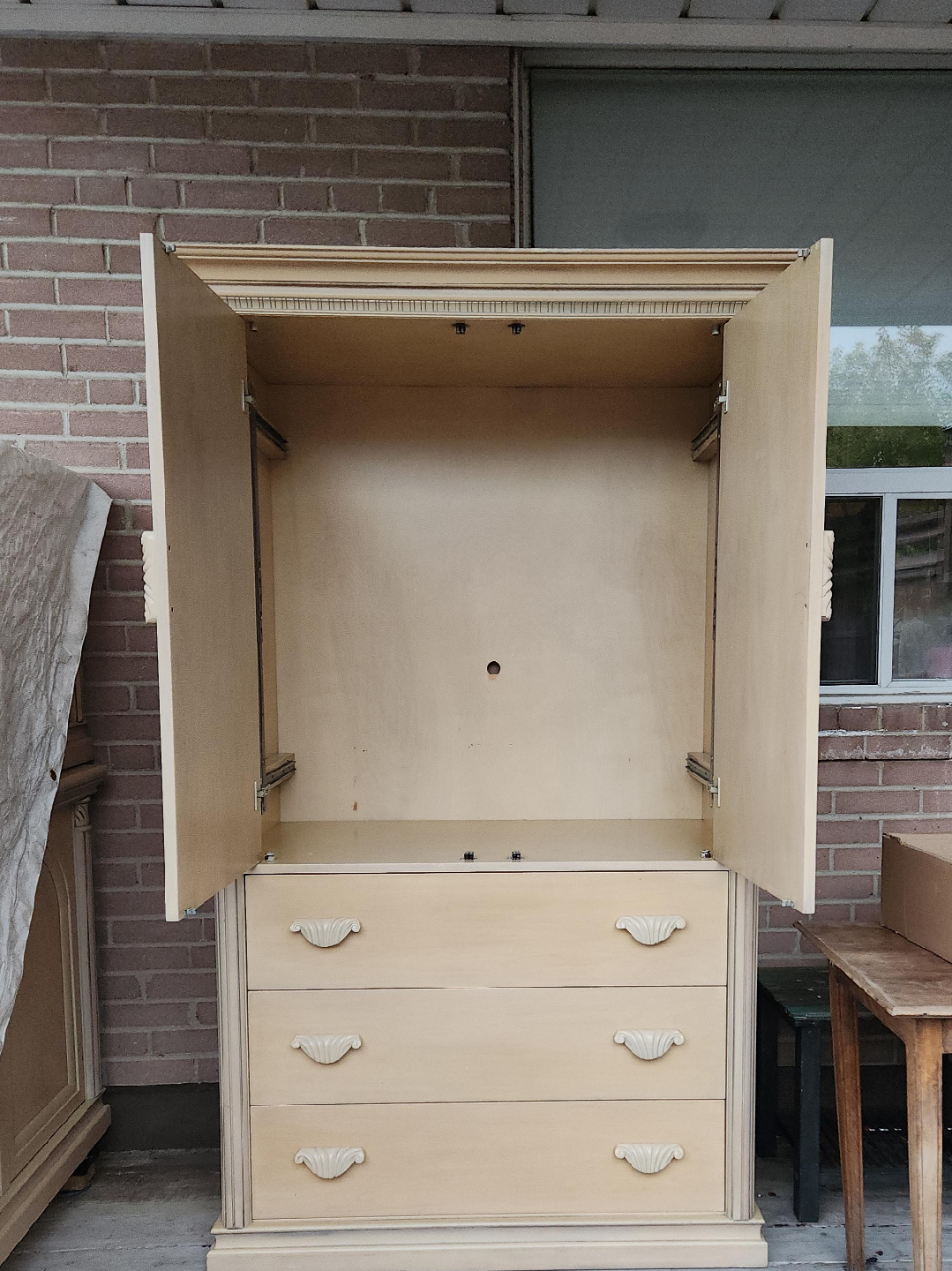 Here's a lovely antique armoire, perfect for adding some vintage charm to your space! It features a top cabinet area with doors and three drawers at the bottom for extra storage. The beige colour is neutral and will fit in with many decor styles Serious inquiries only! Make an offer! Pick up only !