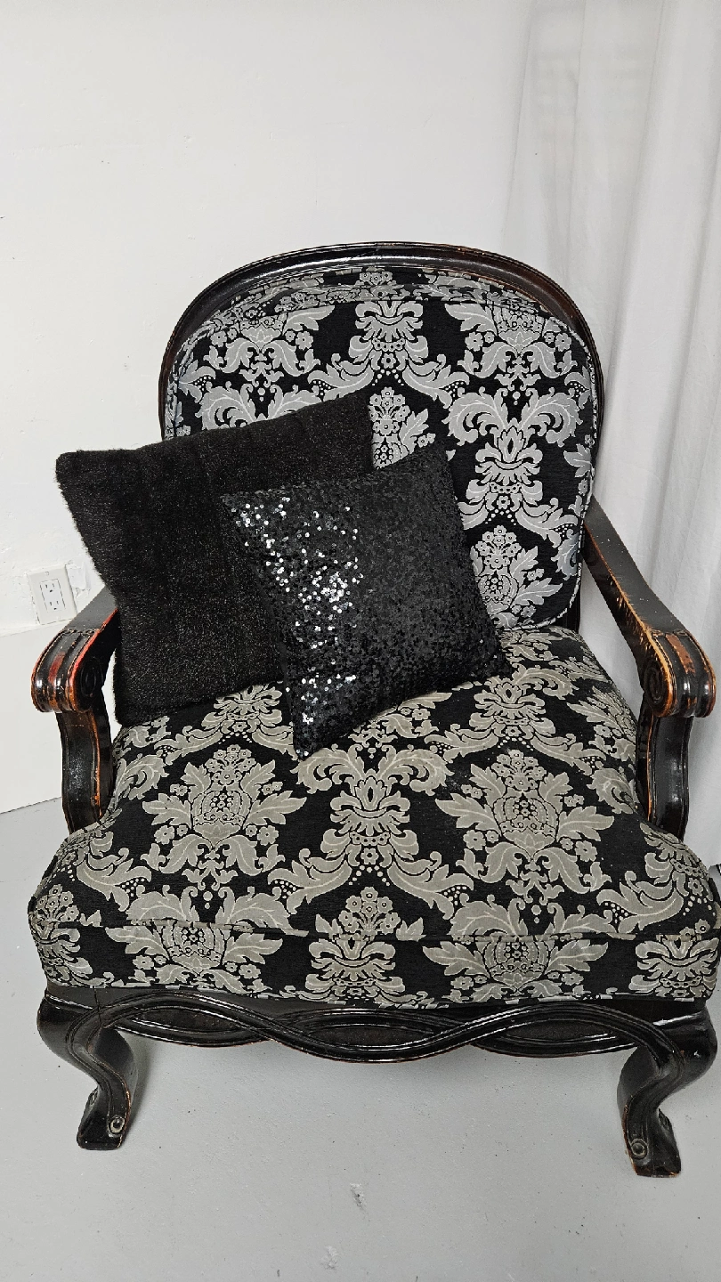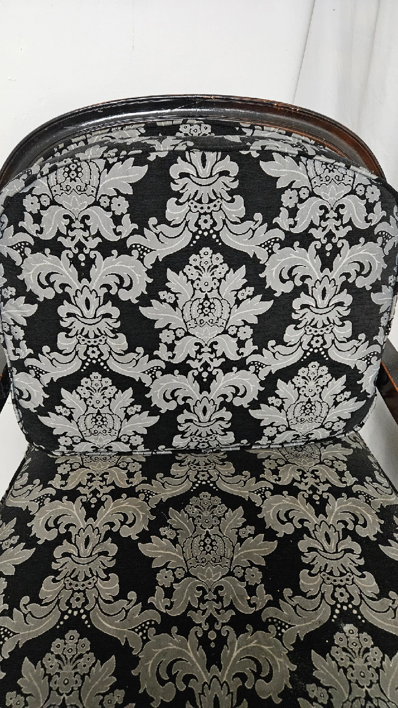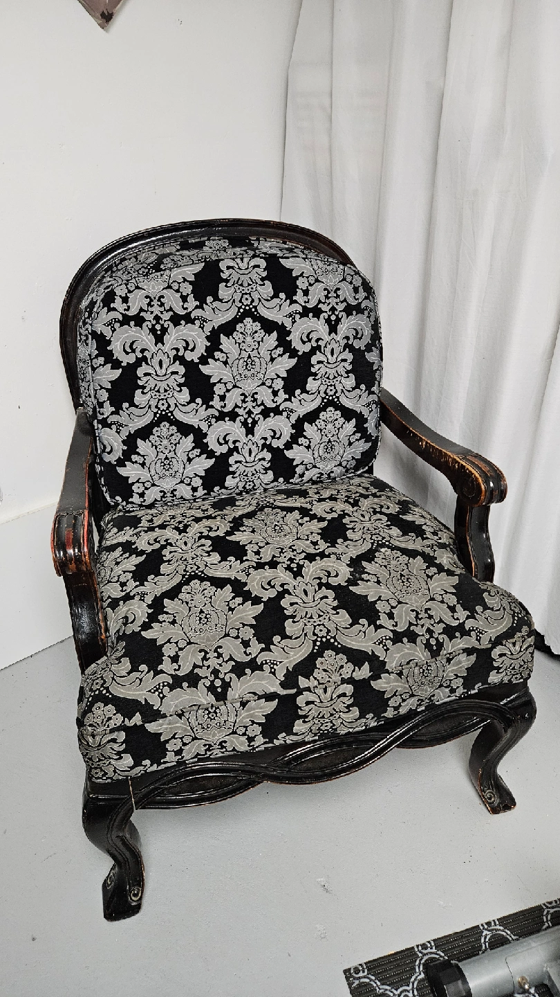 10Selling a charming antique armchair with a distinctive black and silver damask upholstery. It's a unique piece that would add character to any room. The chair shows some signs of wear consistent with its age, but it's still sturdy and comfortable. Perfect for adding a touch of vintage elegance to your home!