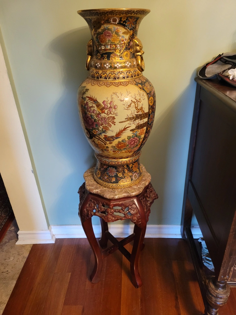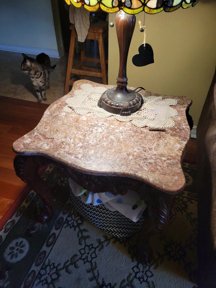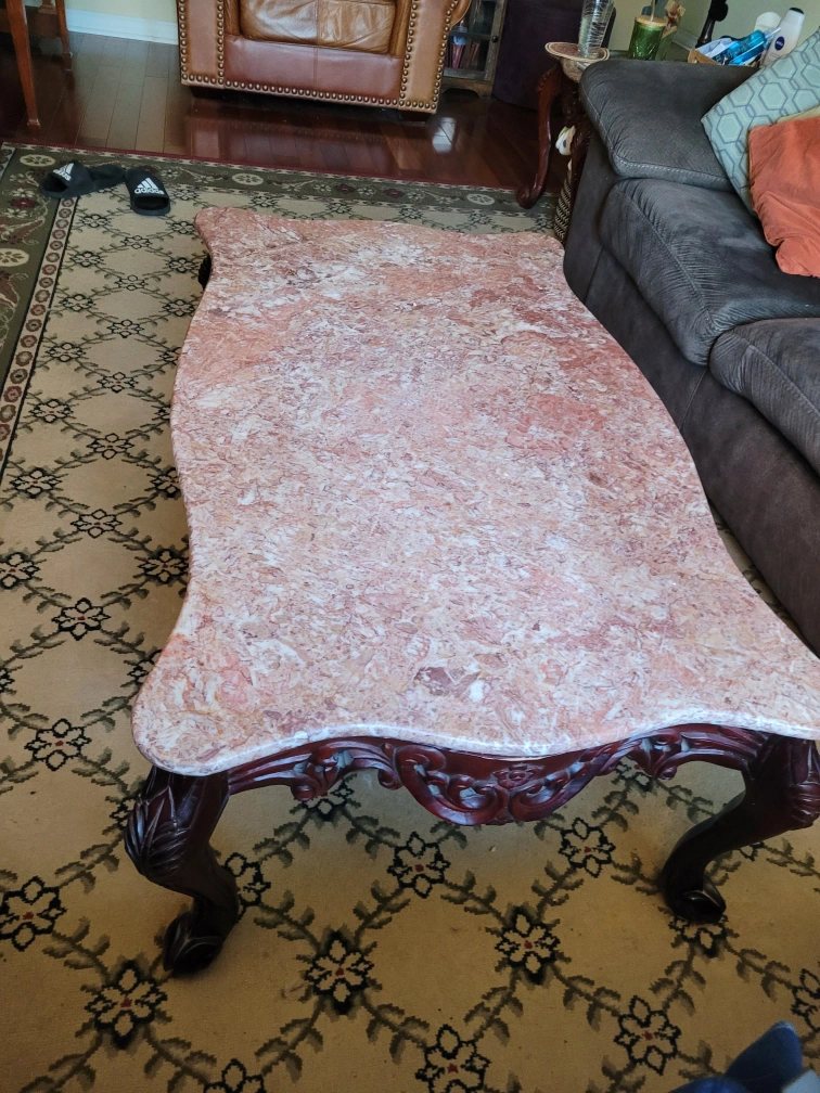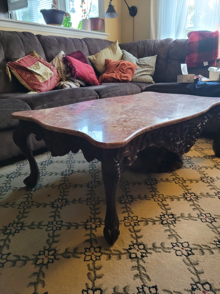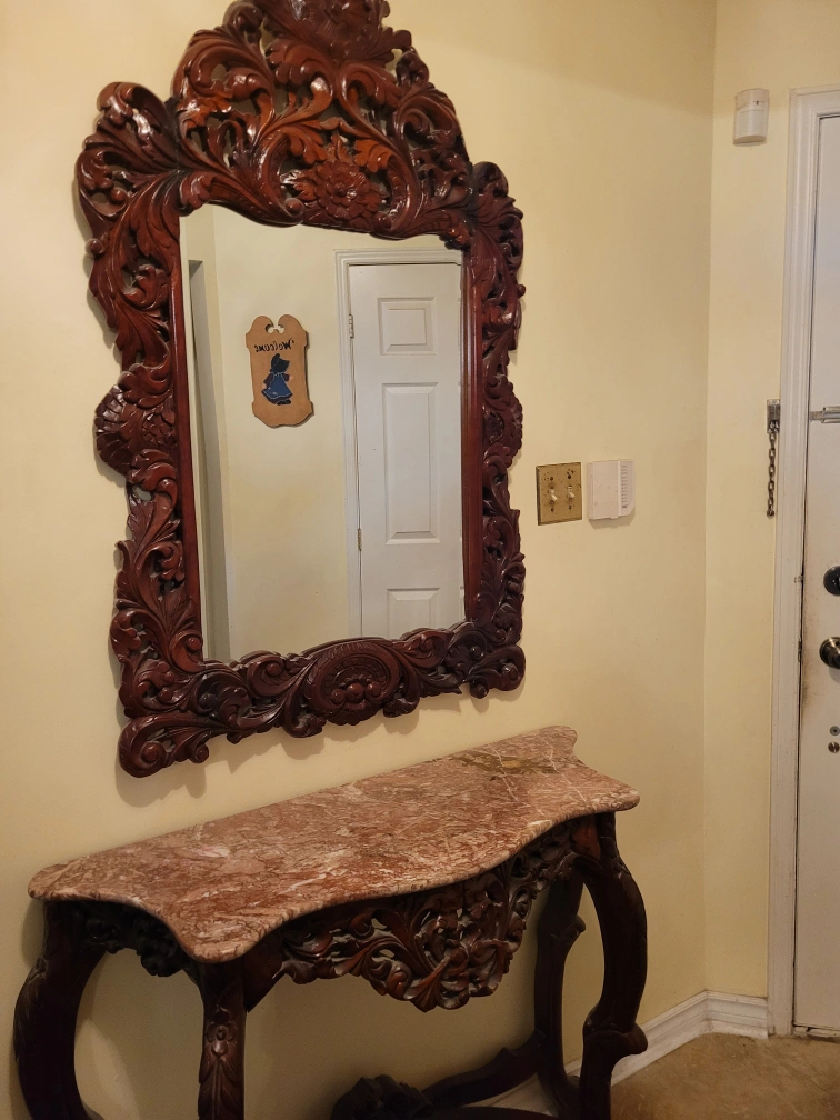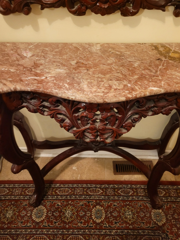 10Selling a collection of antique, carved wood furniture with marble tops. The set includes a mirror with a carved frame, a console table, two tall vase stand, and twoside tables. Each piece features intricate carvings and a unique marble top. Perfect for adding a touch of vintage elegance to your home! Will sell either together or separate. price will depend on each piece.