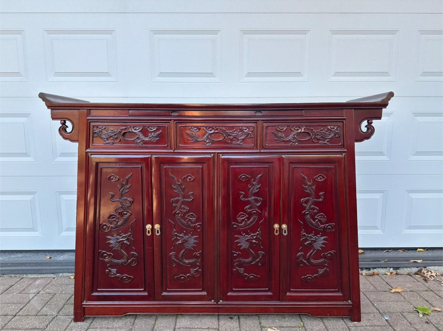 10Beautiful antique Chinese cabinet featuring intricate dragon carvings. This unique piece would add a touch of elegance to any home. It appears to be in good condition and ready for a new home!