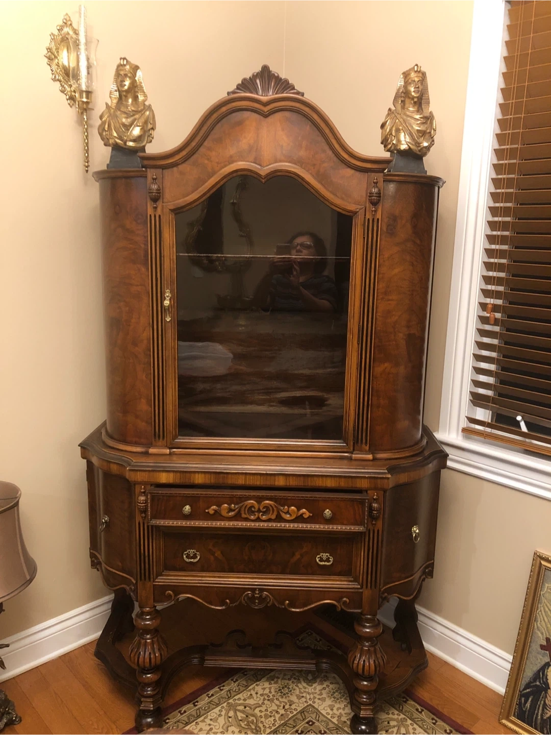 Stunning solid wood antique dining room set in excellent condition. Includes buffet/sideboard with drawers & cabinets, matching china cabinet with glass display, and large ornate mirror. Features carved details, brass hardware, and elegant craftsmanship. 📍 Pickup only – Serious inquiries only