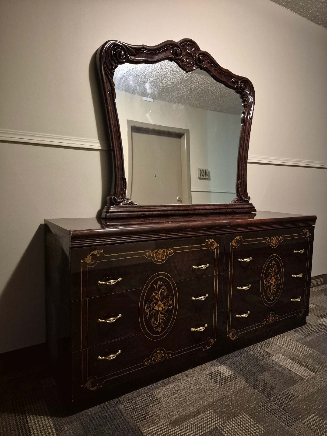 Beautiful antique dresser with a large ornate mirror. It features a dark wood finish with gold accents. The dresser has multiple drawers for ample storage. A unique piece to add character to any room!