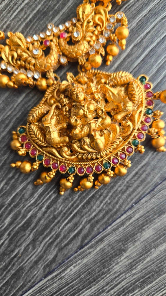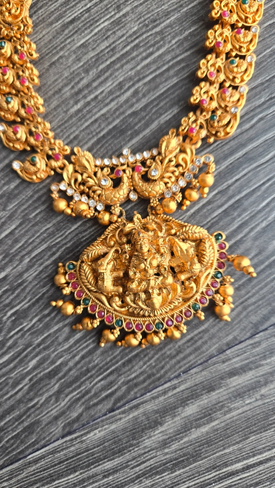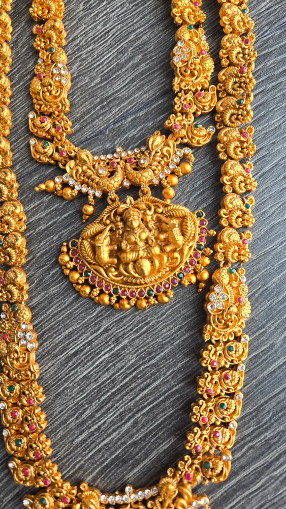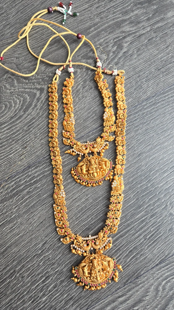 Beautiful gold-tone necklace set. Features two long strands and a detailed godess pendant. Adorned with colourful stones. Intricate craftsmanship. Perfect for special occasions, weddings, dance functions and bharathanatiyam. Artificial antique Indian jewelry for sale.