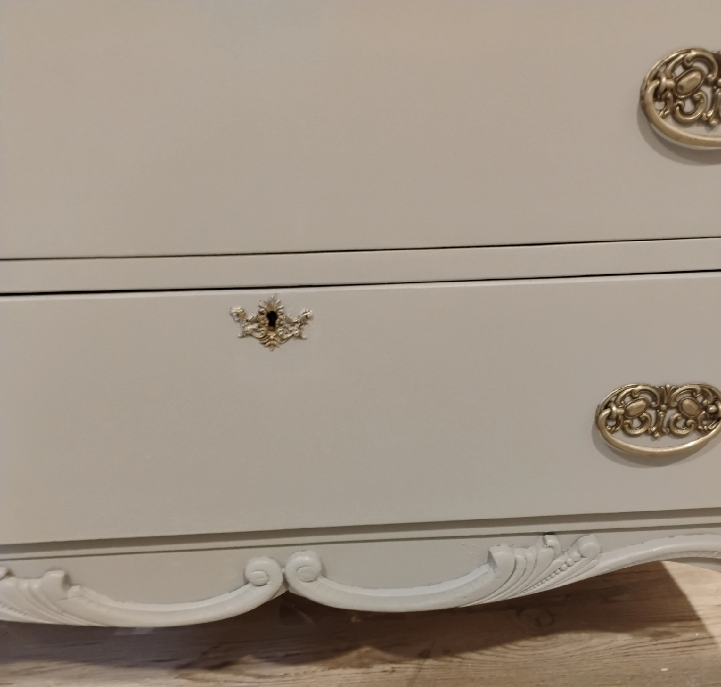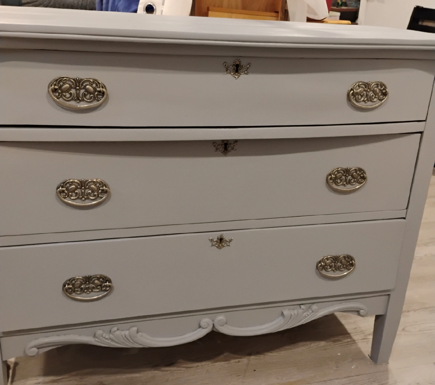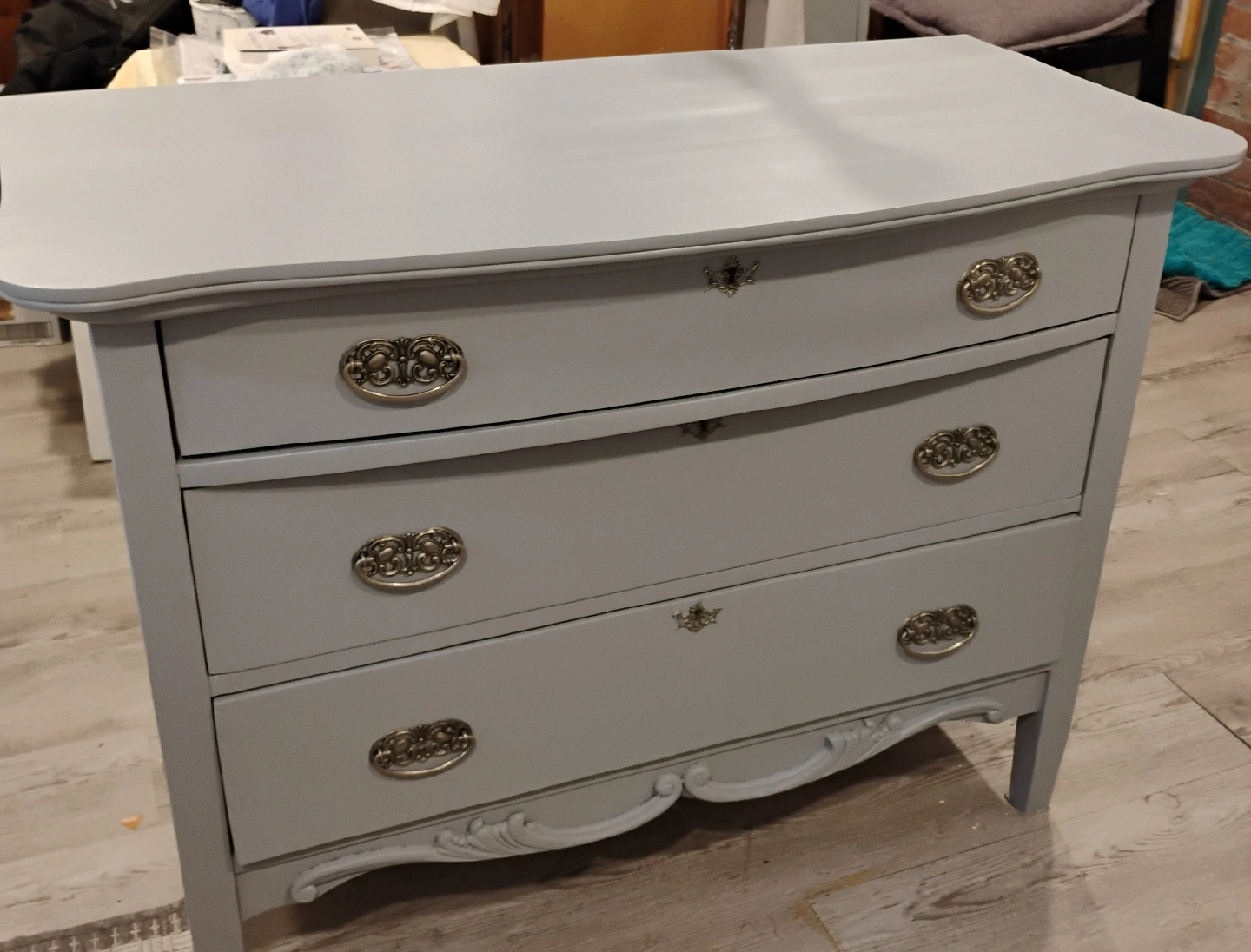 17Refinished 3 drawer dresser. Antique in solid pine with easy open drawers. Each drawer adorned with Victorian style keyholes and antique silver handles (original,). Drawers are lined in vintage design. Dresser is solid pine. Made in Canada.