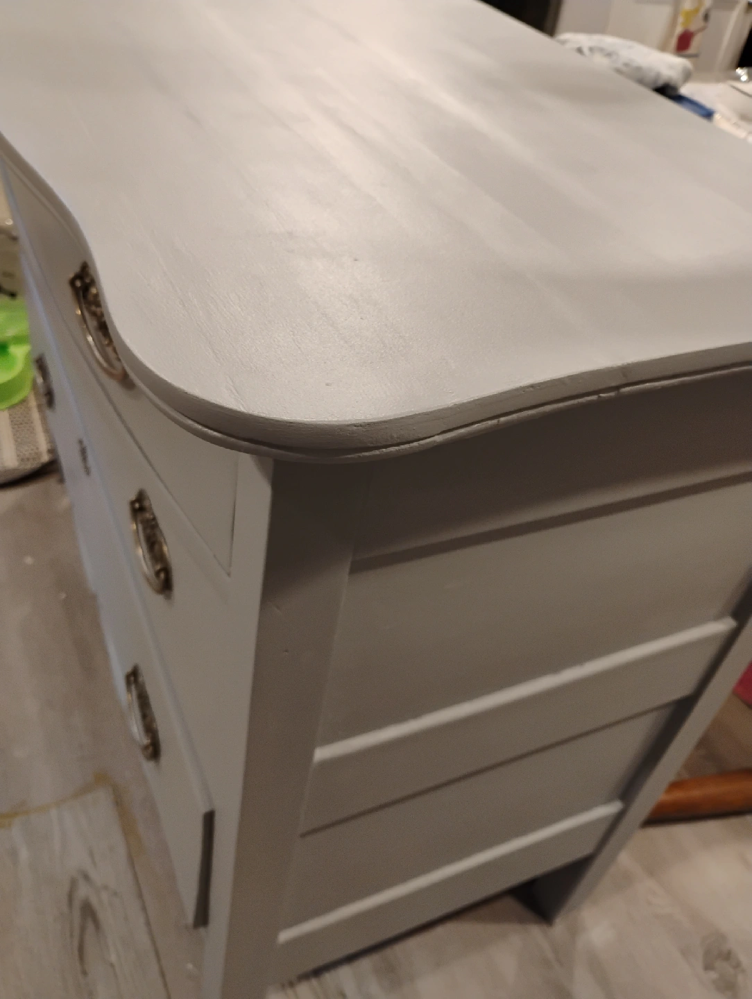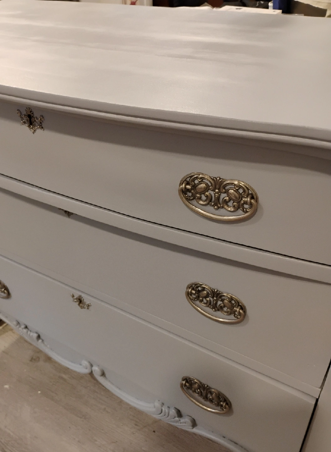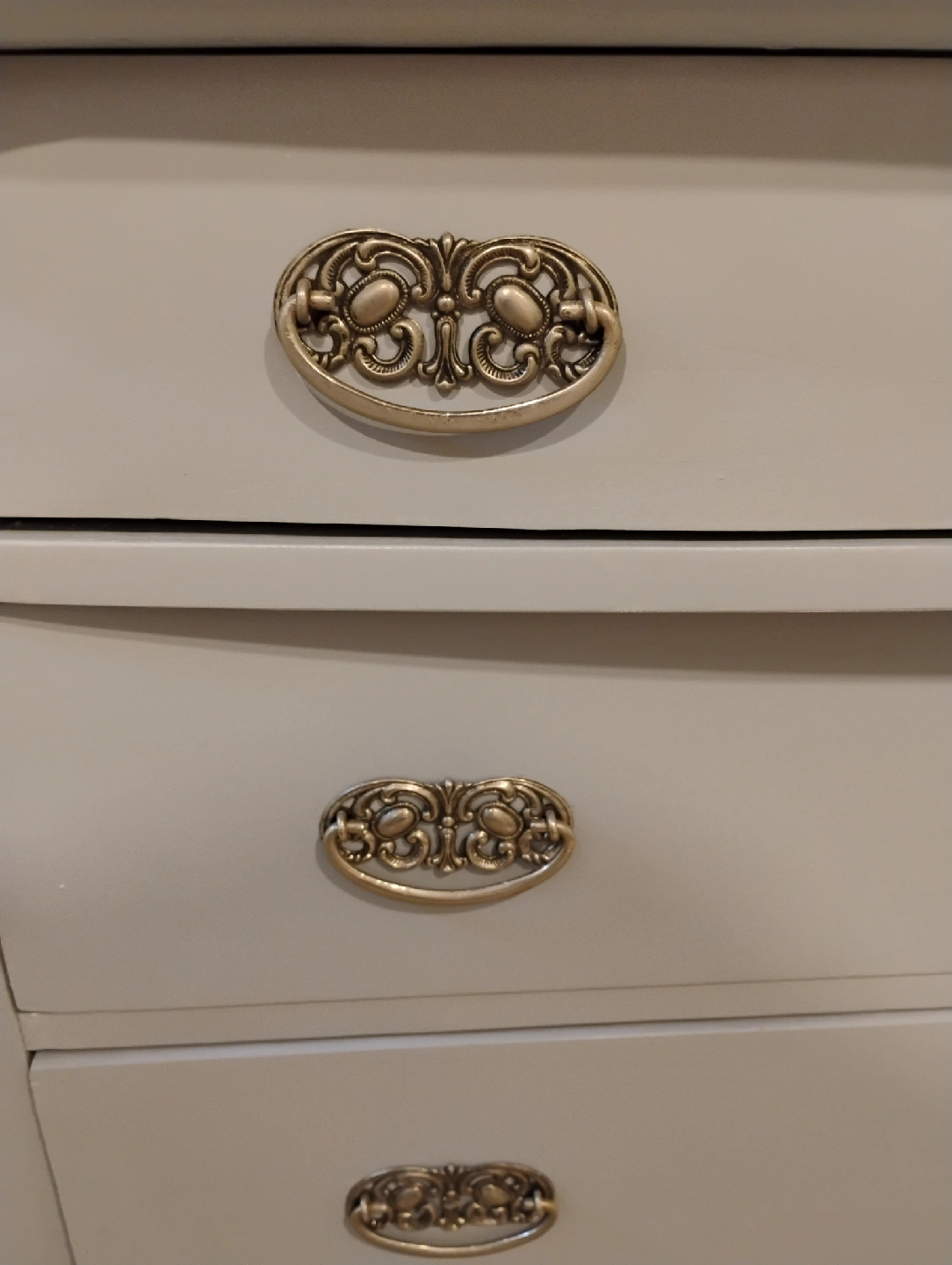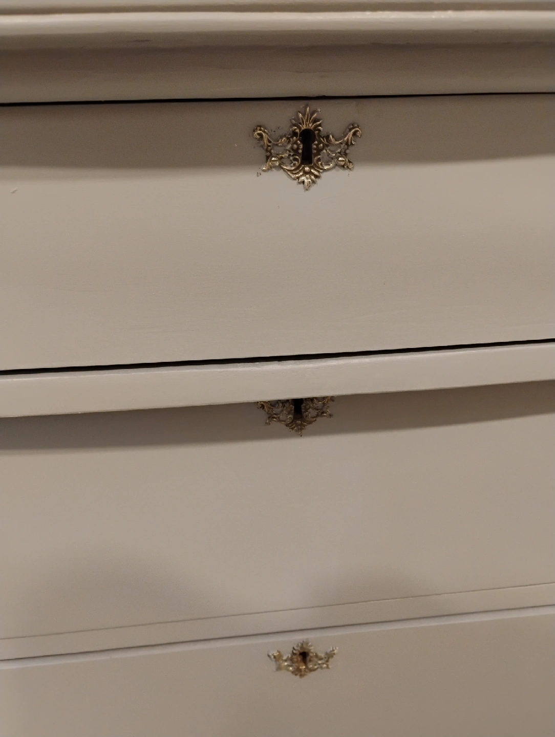 17Refinished 3 drawer dresser. Antique in solid pine with easy open drawers. Each drawer adorned with Victorian style keyholes and antique silver handles (original,). Drawers are lined in vintage design. Dresser is solid pine. Made in Canada.