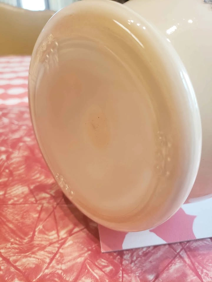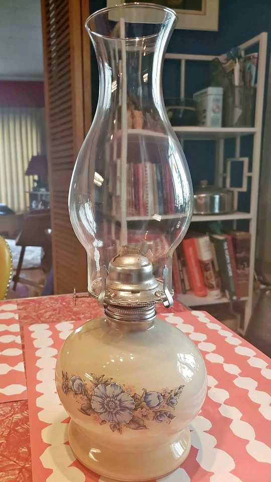 25Ivory glass oil lamp. Victoria Rose design. Very good condition for its age. No chips or cracks in glass base or in glass topper. Small glass bubbles on bottom that act as feet are all intact still. Works well. I have used this during power outages before. Bit of wick left in this one. Raise and lower wick (brighten or dim the flame) using dial on the side. Pick up in Upper Lonsdale North Vancouver. Cross posted on Marketplace