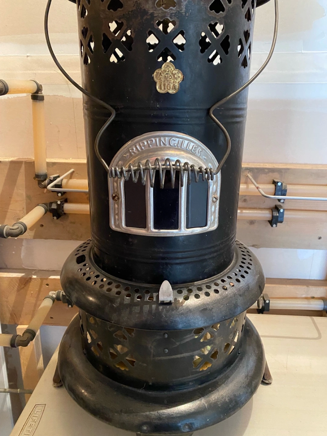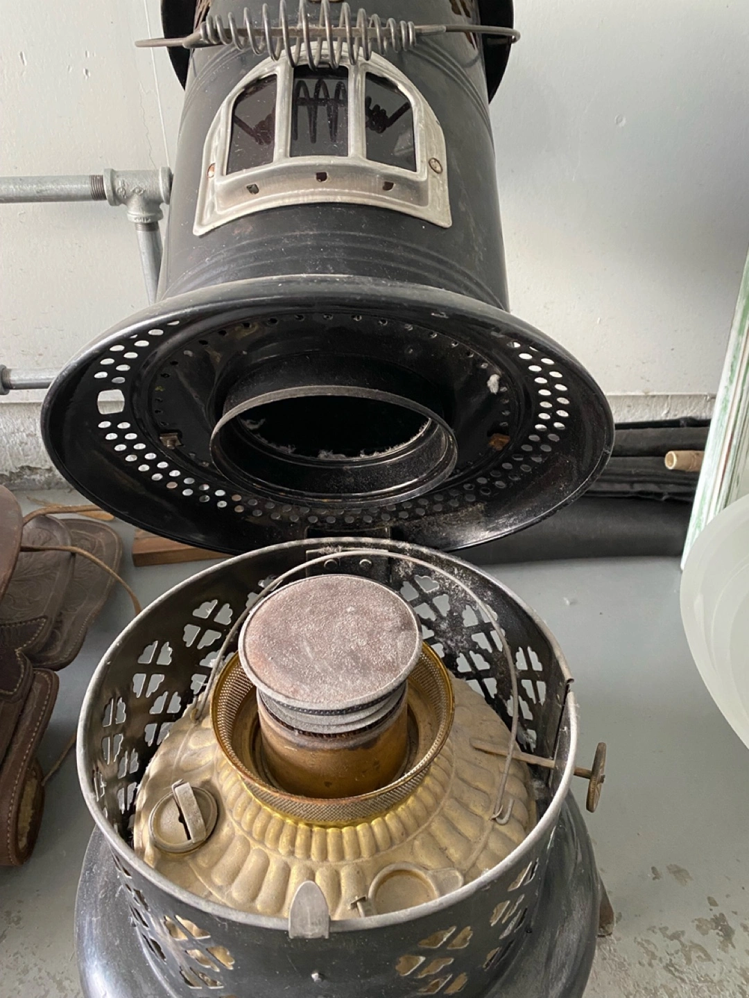 A black antique oil heater. Features a decorative top with a handle. The front has a window. Was used to warm tractor in the winter. Used recently as decorative item.