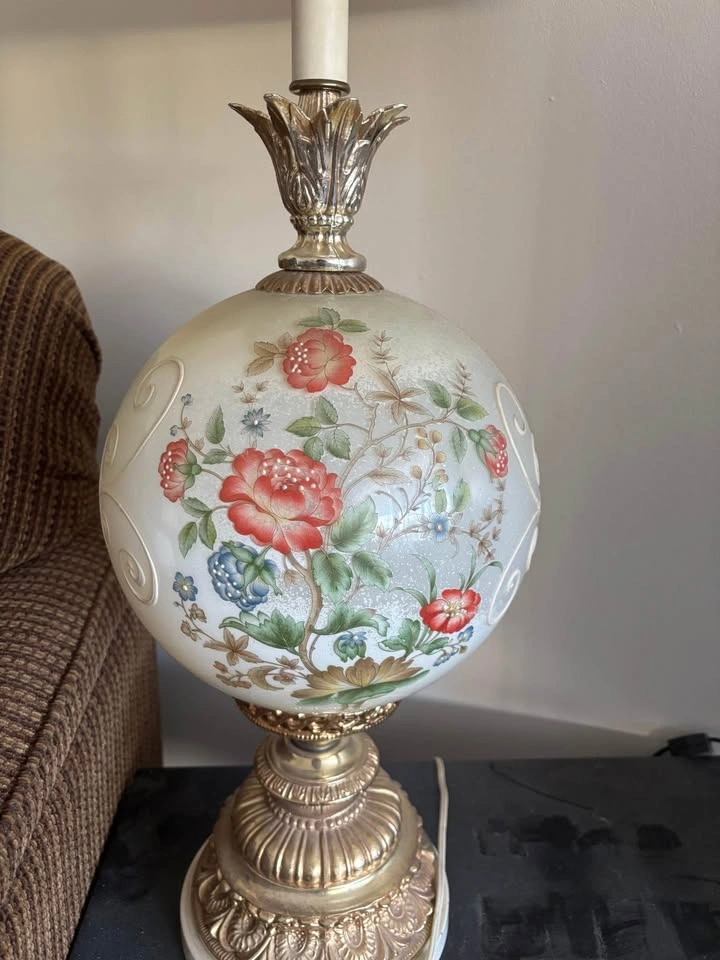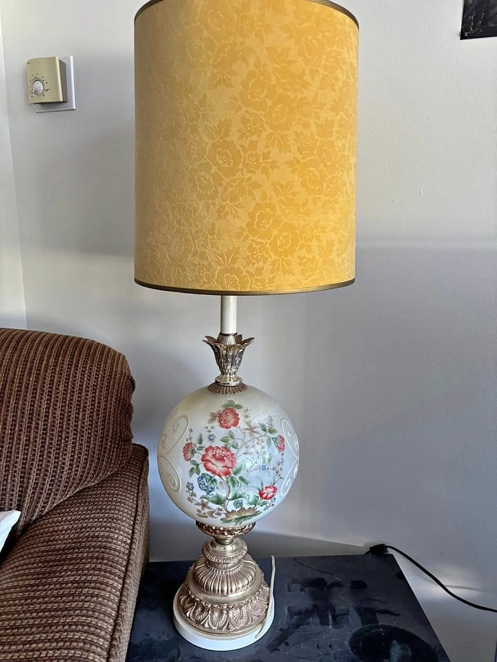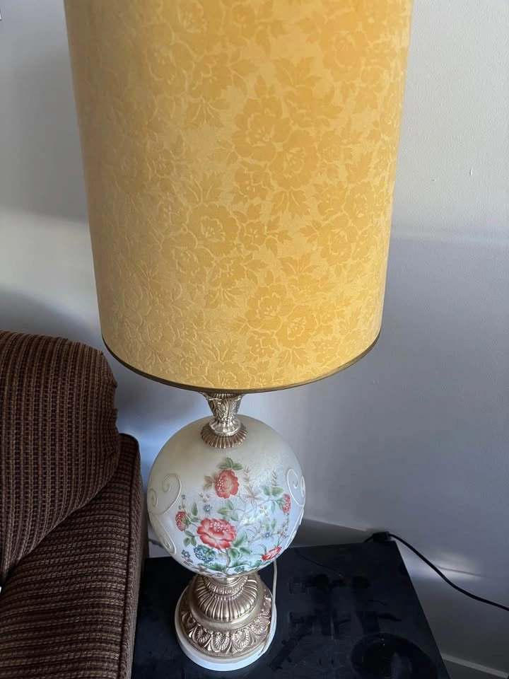 10An antique lamp barely used, with original lamp shade and a still working bulb.
