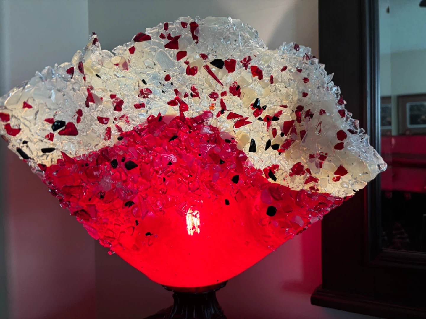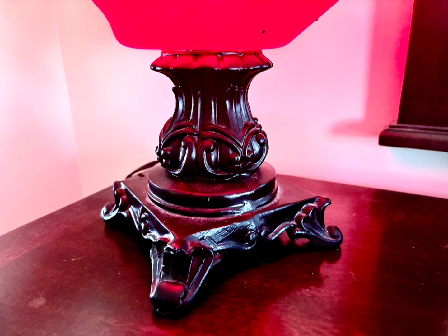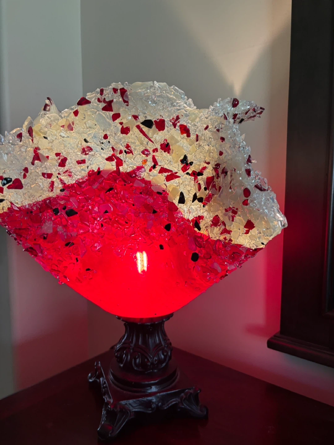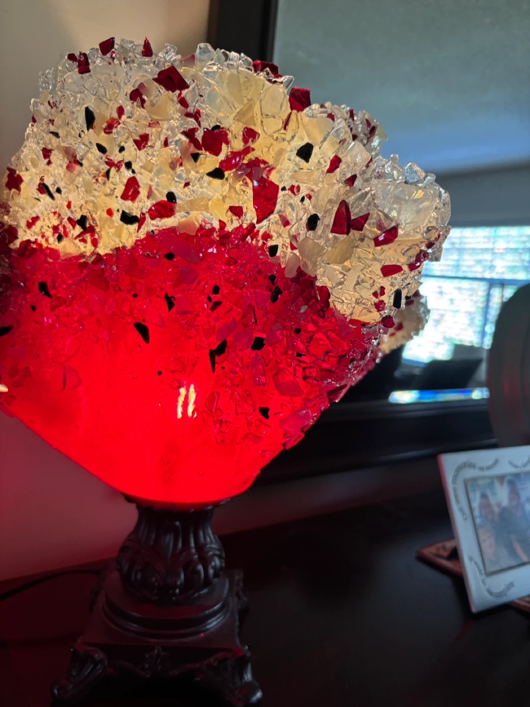 25This unique accent lamp features a striking red and white glass design. It would be a beautiful addition to any room, providing a warm and inviting glow. The base has an ornate design that adds to its charm. It's in great condition and ready to brighten up your space