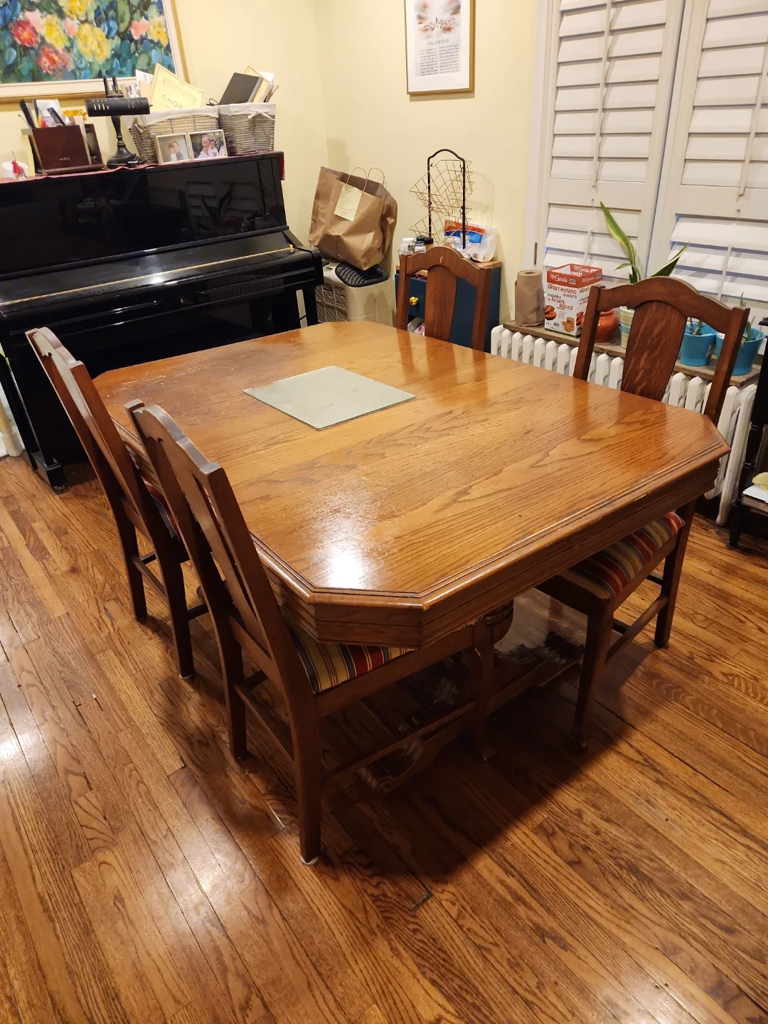 145Selling a wooden dining table that comes with four matching chairs. The table has a unique octagonal shape with a square glass insert in the centre. The chairs have striped fabric seats. It's a sturdy set and would be great for a family dining room! Some tlc required for the table and the chair covers to restore beauty. Super solid table with real wood . Serious buyer only please Pickup only millwood and Forman