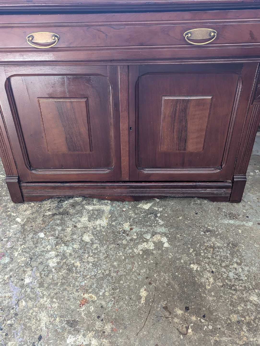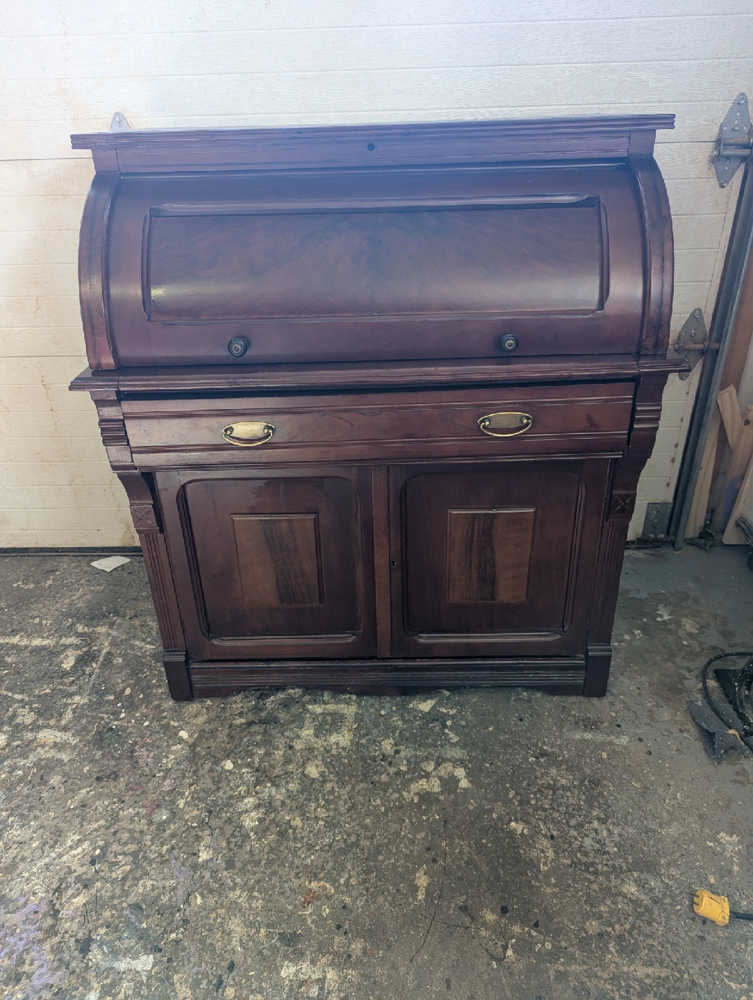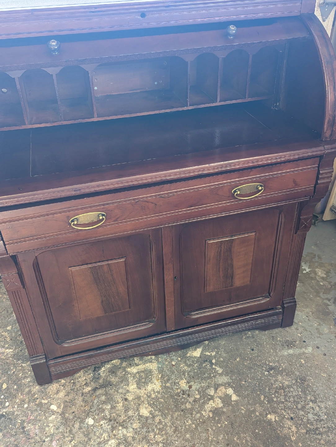 38Selling a beautiful Victorian antique roll top secretary desk. It's made of wood and features a rich, dark brown finish. The desk has a roll top that opens to reveal cubbies and a writing surface, along with drawers and cabinet space for storage. Perfect for adding a touch of vintage charm to your home office or living space