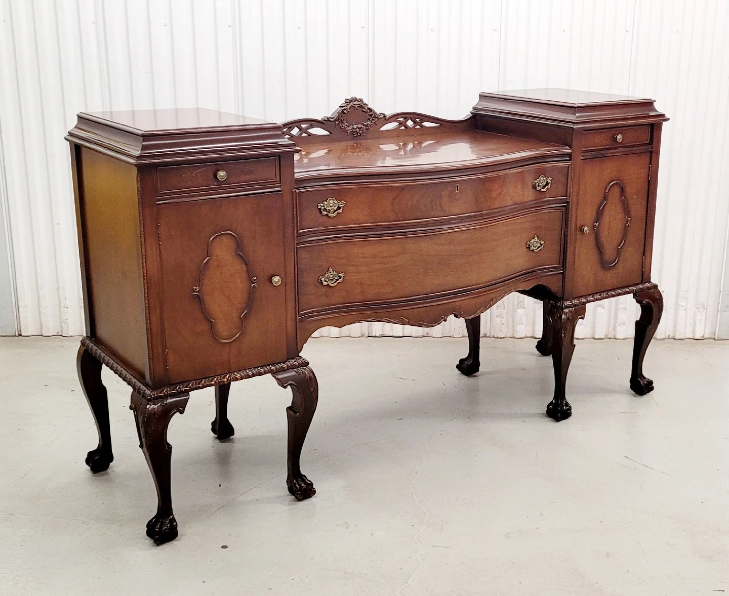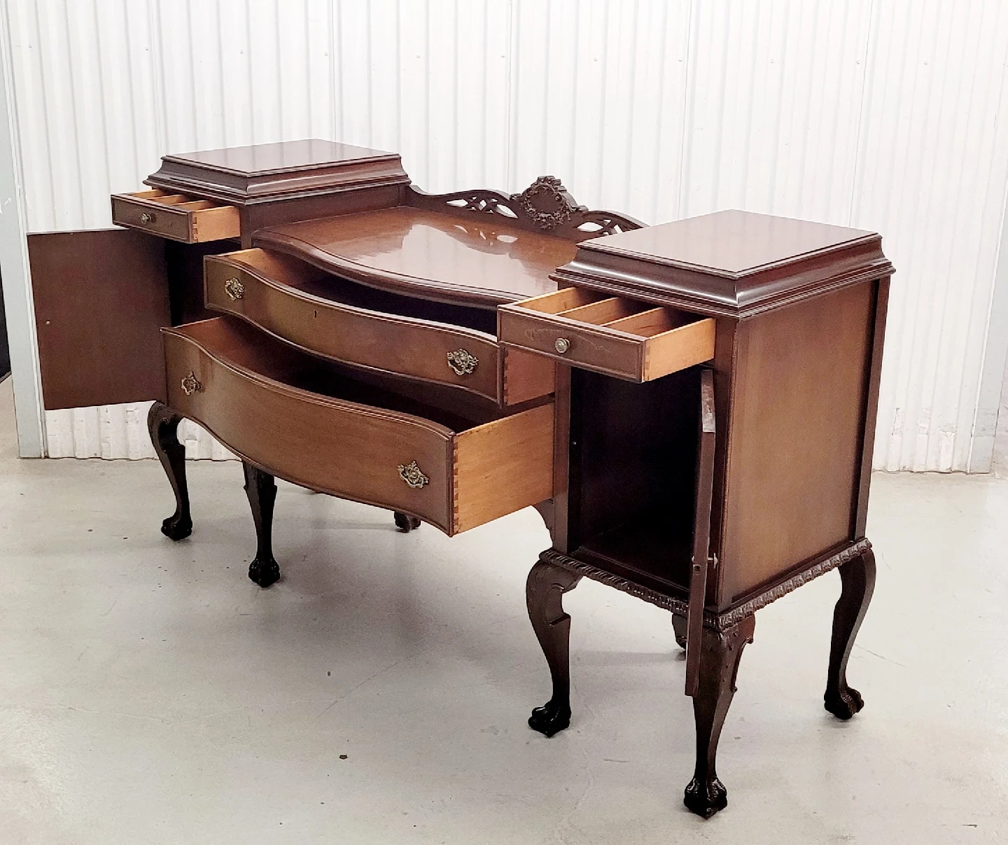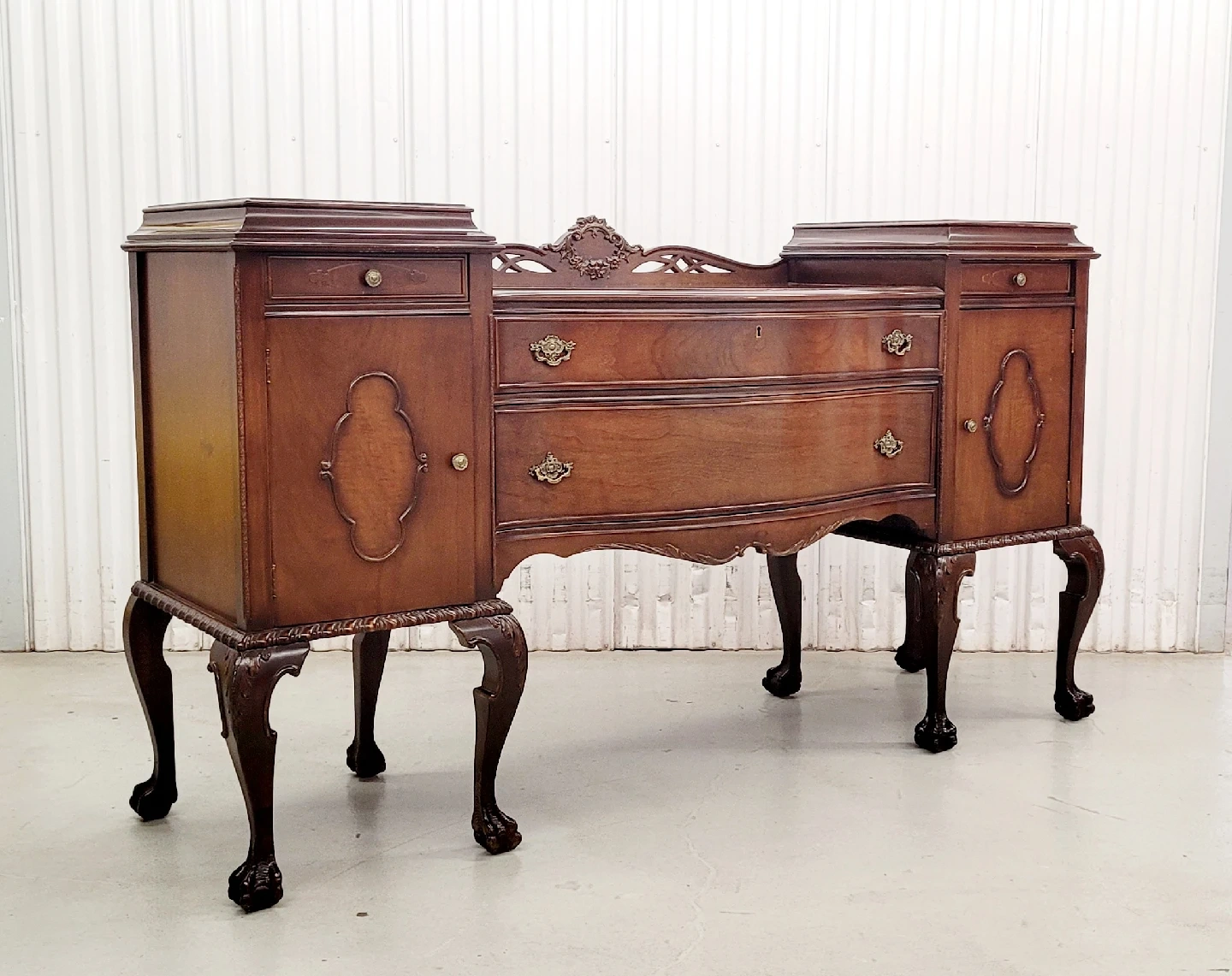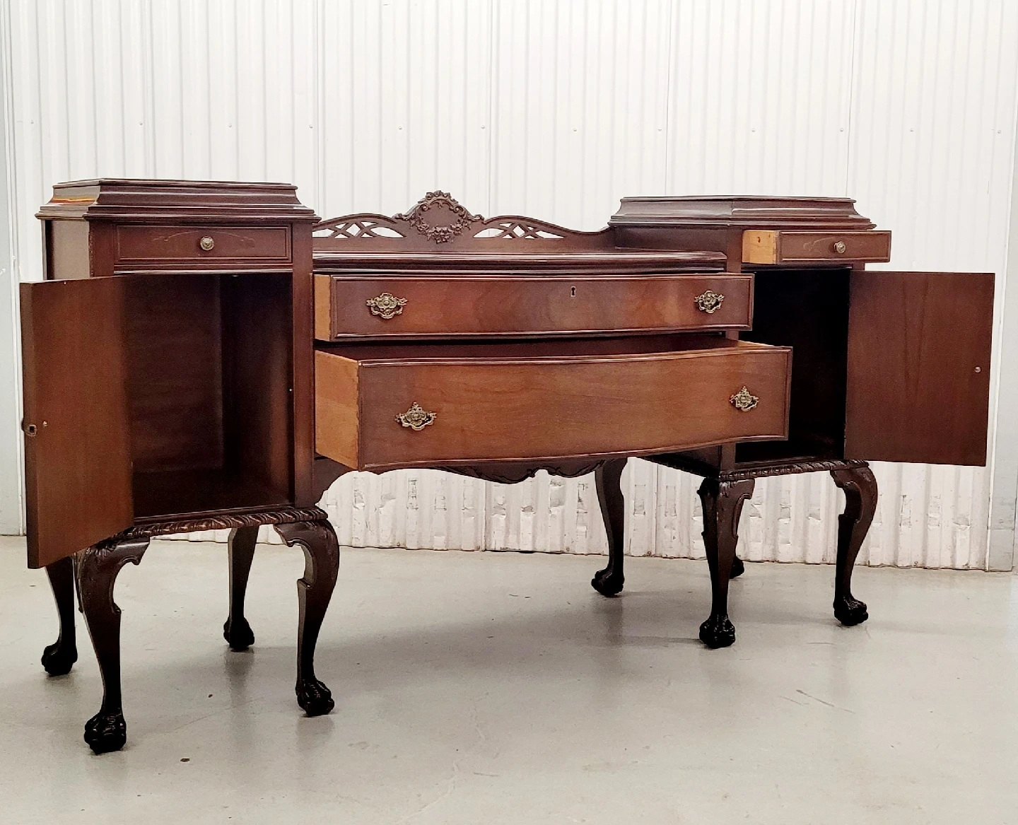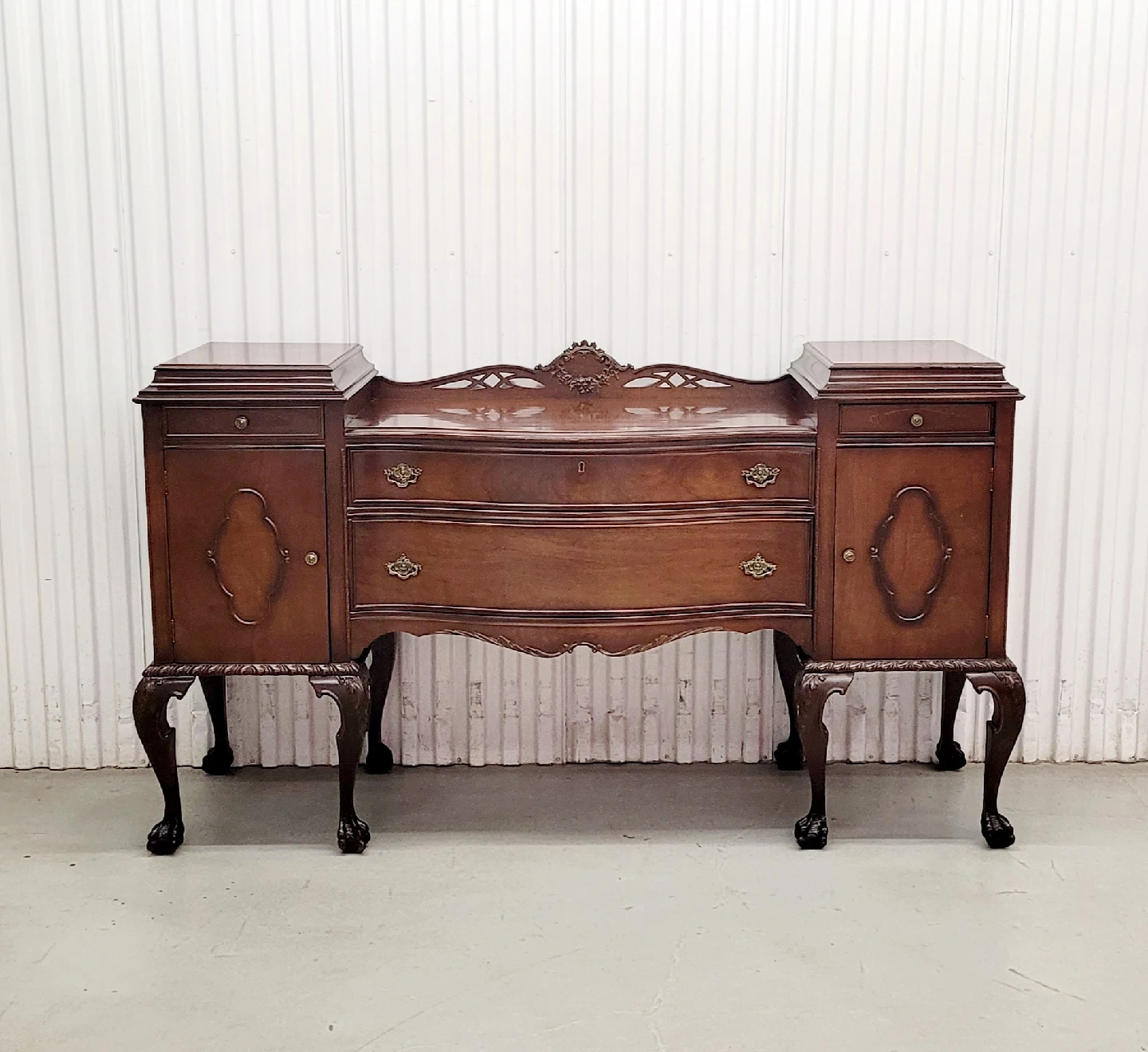 26Very beautiful and grand antique Chippendale queen Anne claw legs buffet sideboard.The piece is very detailed with brass hardware and has 4 drawers and 2 side cabinet storage with doors. This traditional buffet sideboard is in great condition for its age with lots of storage and charm. π Measurements in inches Height: 41.5" Length: 72" Depth: 21"
