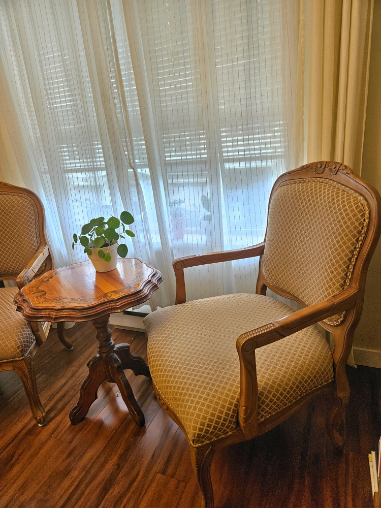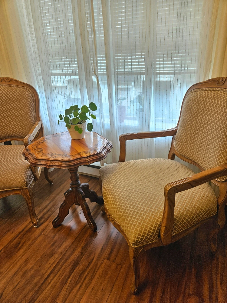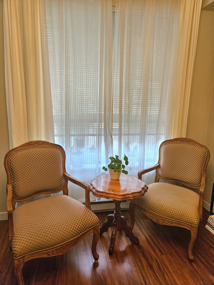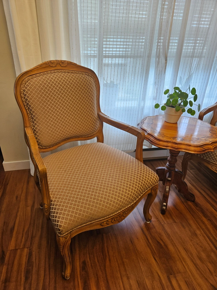 10Selling a set of two antique-style accent chairs and a matching side table. The chairs have a beautiful patterned upholstery and carved wooden frames. The side table is also carved and has a unique design. Perfect for adding a touch of elegance to any room!
