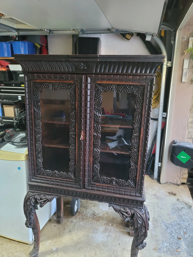 Selling a beautiful display cabinet with intricate carved wood detailing! It features glass doors and a classic antique style. Perfect for displaying your favourite items in your home Pick up is Upper Stoney Creek L8J1J2 Text 416-565-2581 for quick reply