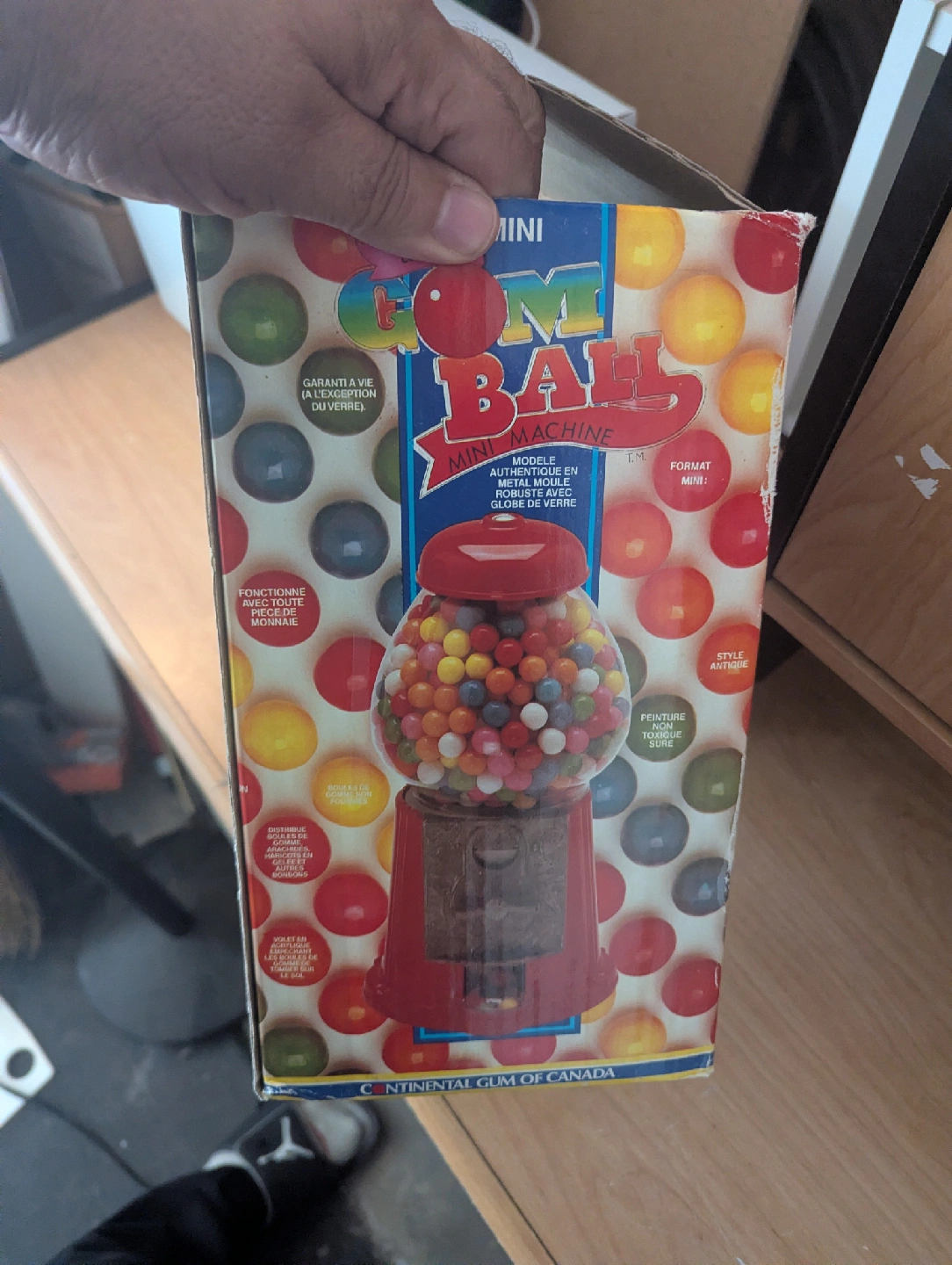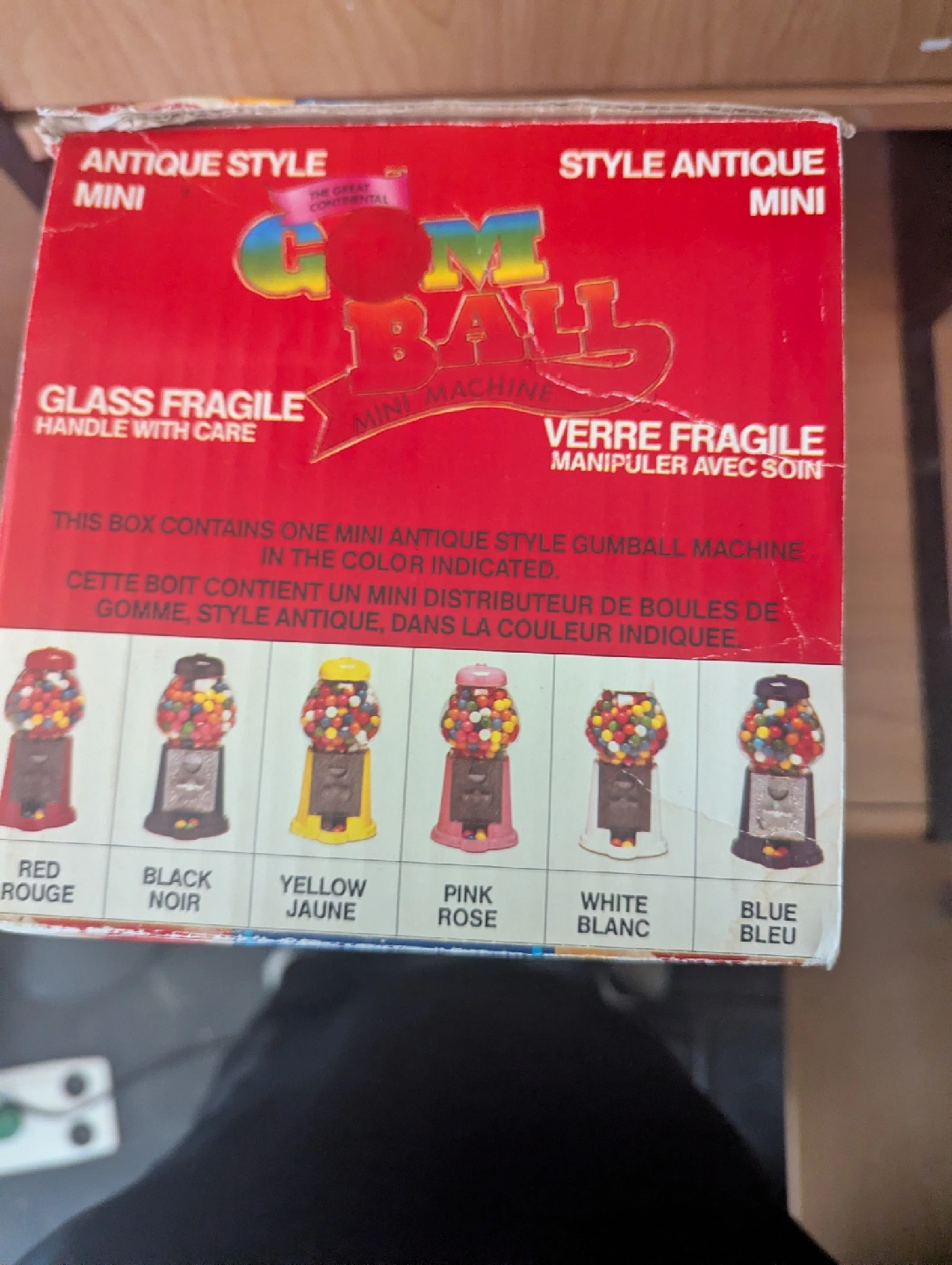 20Selling an antique style mini gumball machine! It's red, as shown on the box. This box contains one mini antique style gumball machine in the color indicated. Glass fragile, handle with care