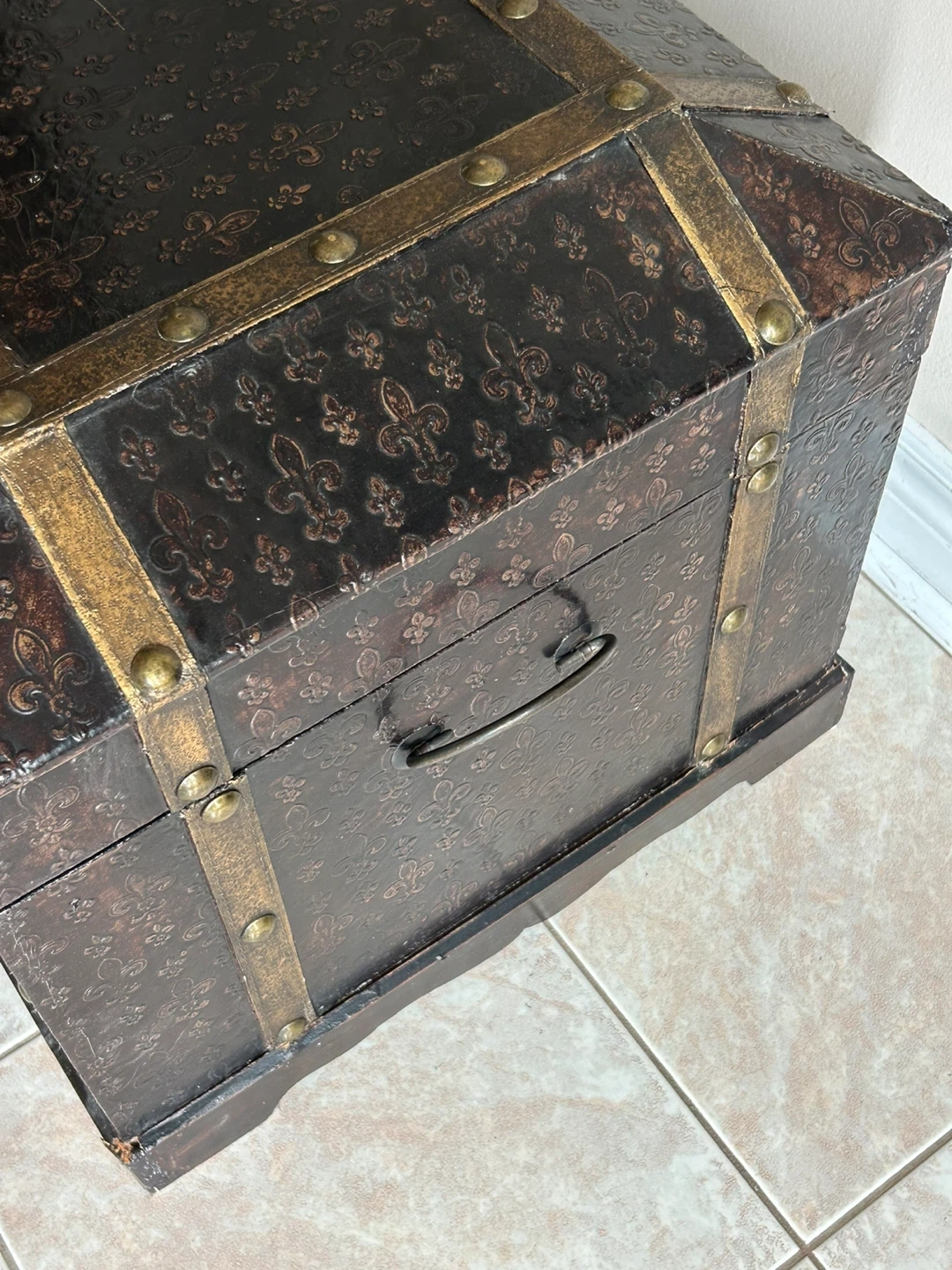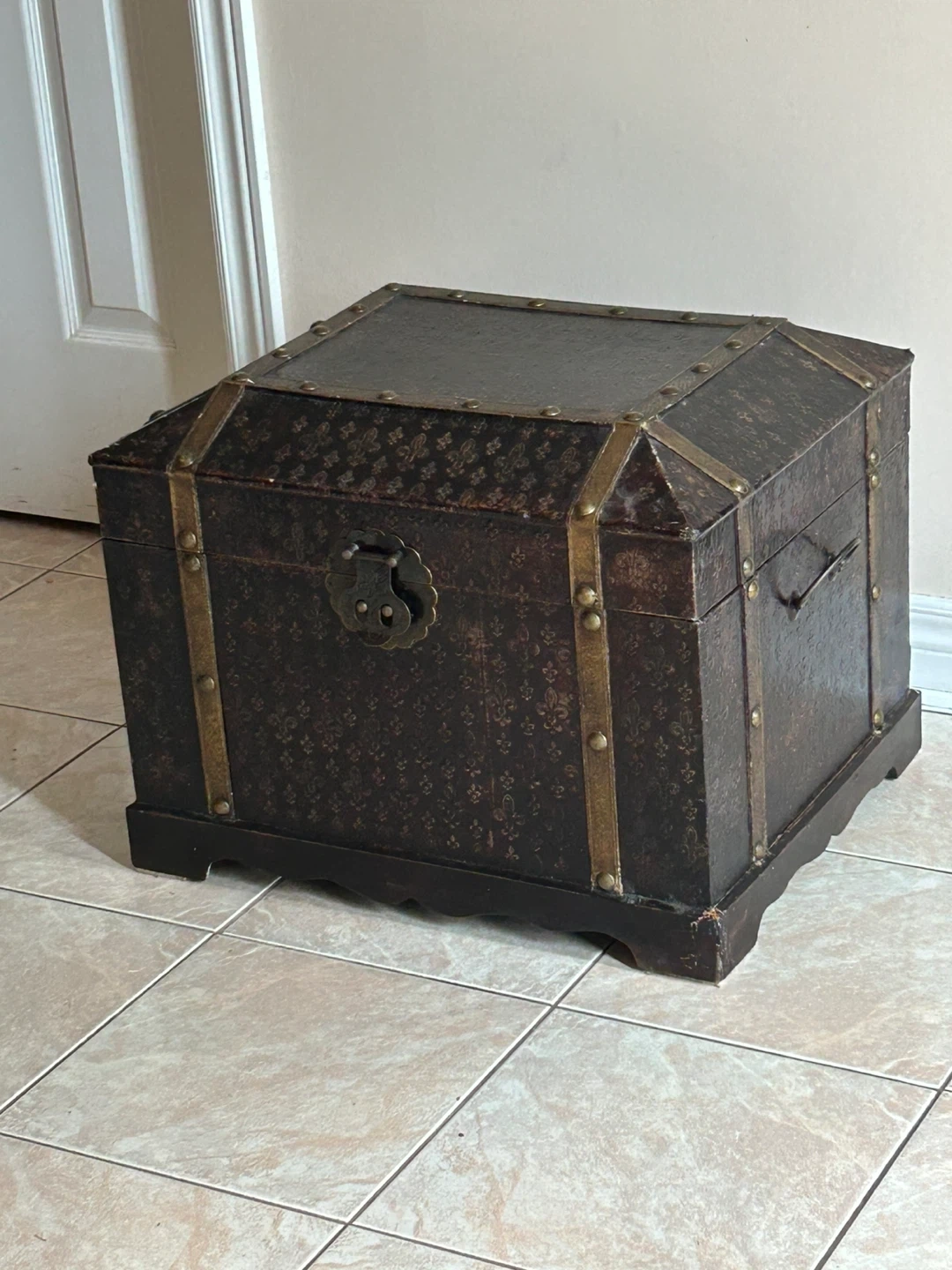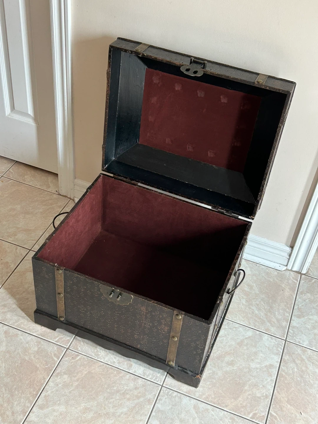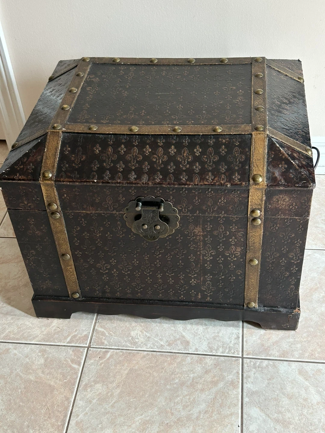 53Selling a lovely antique-style storage trunk. It features a dark brown exterior with gold-tone accents and a fleur-de-lis pattern. The interior is lined with a burgundy fabric. Perfect for adding a touch of vintage charm to your home while providing extra storage