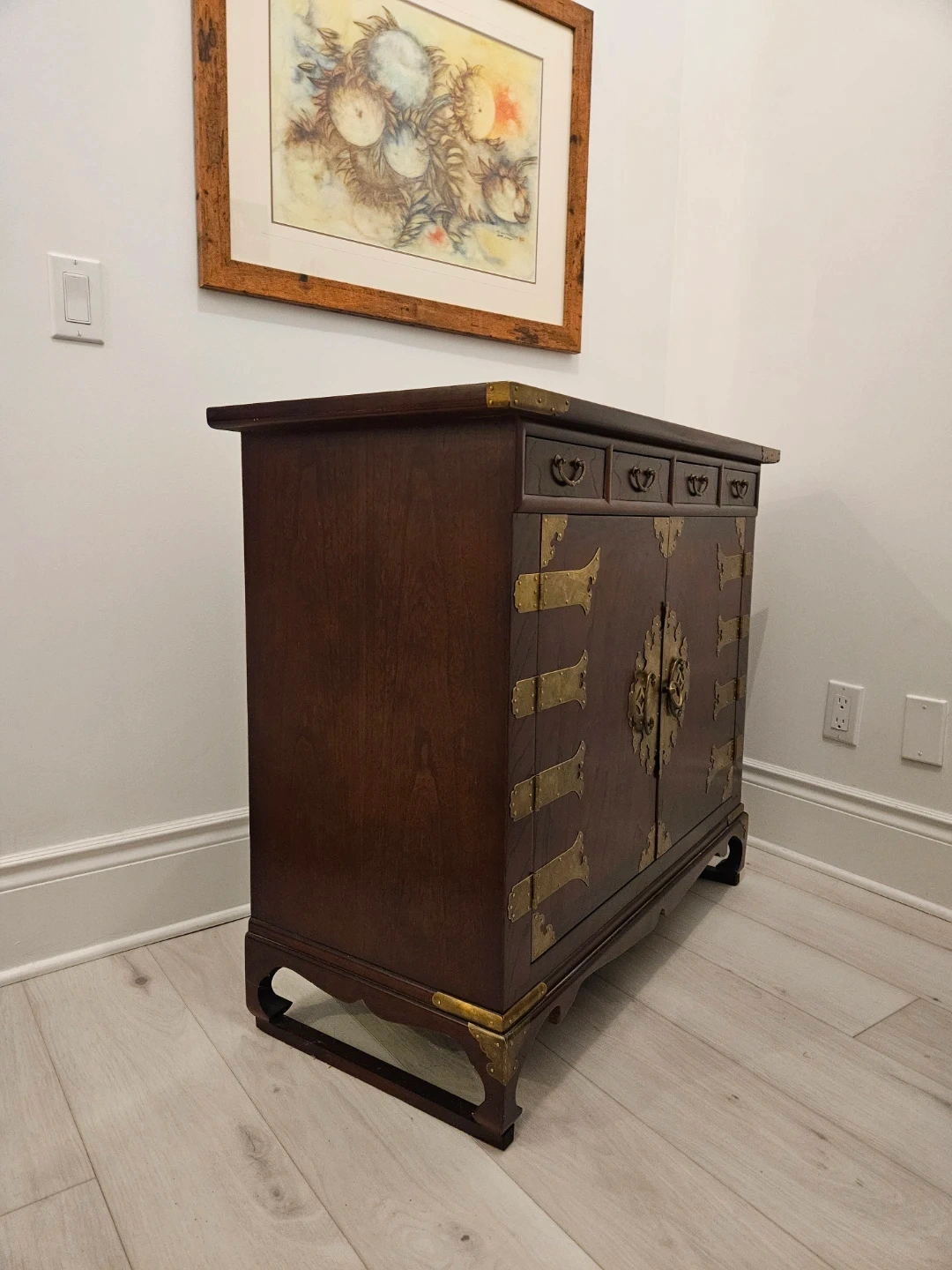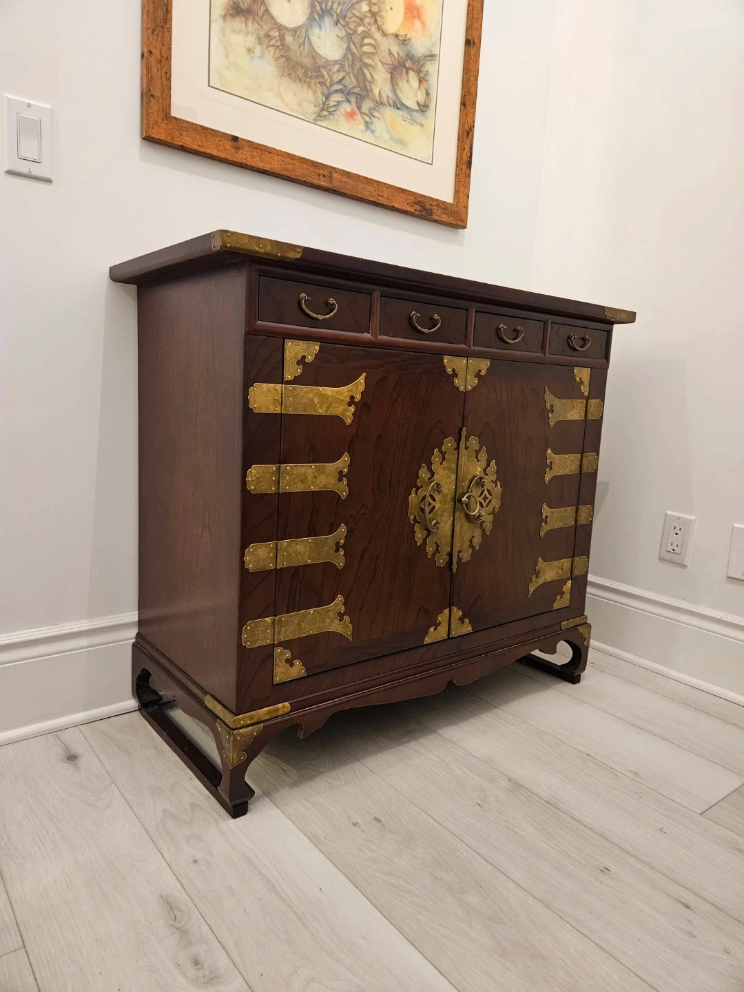 82Selling a beautiful antique-style wooden cabinet! It features a rich, dark wood finish and ornate brass-coloured accents. The cabinet has a unique design with drawers and doors, perfect for adding a touch of elegance to any room