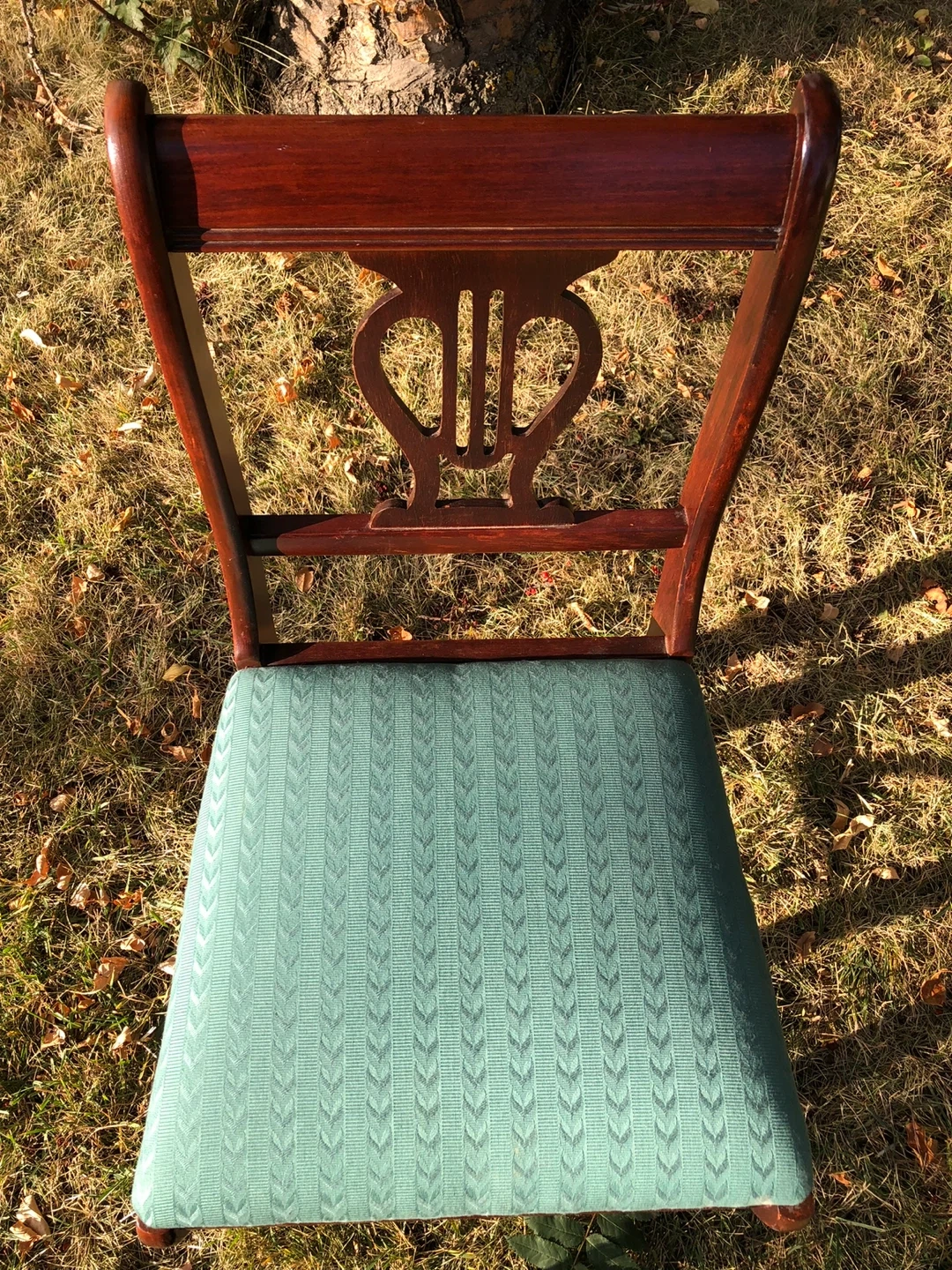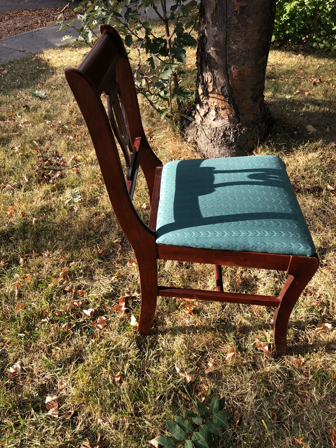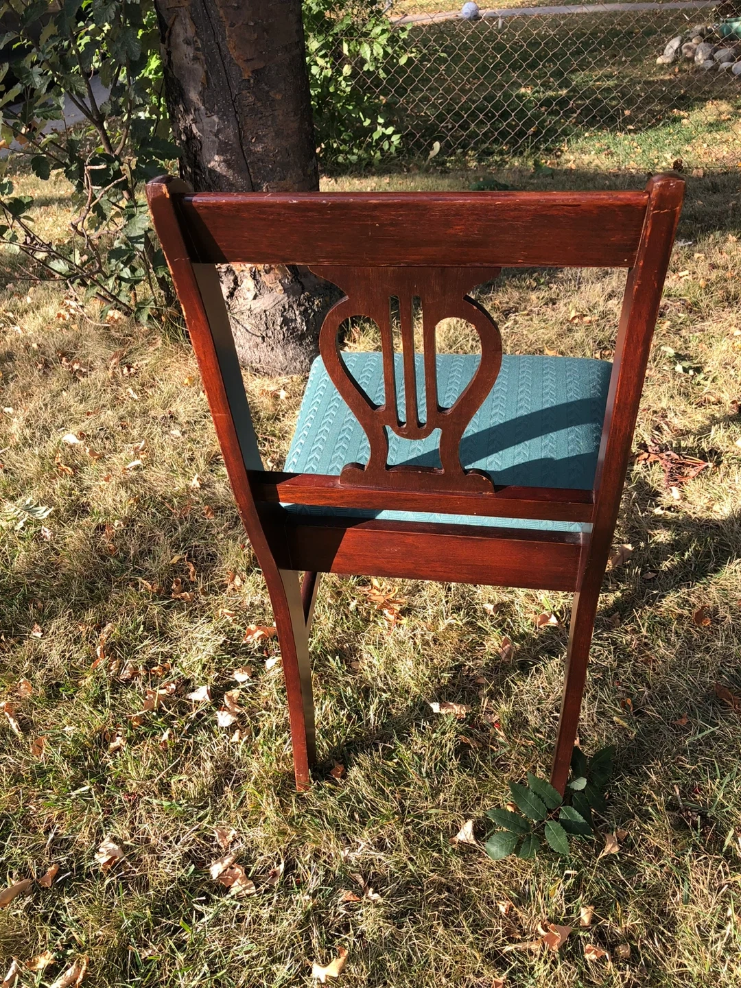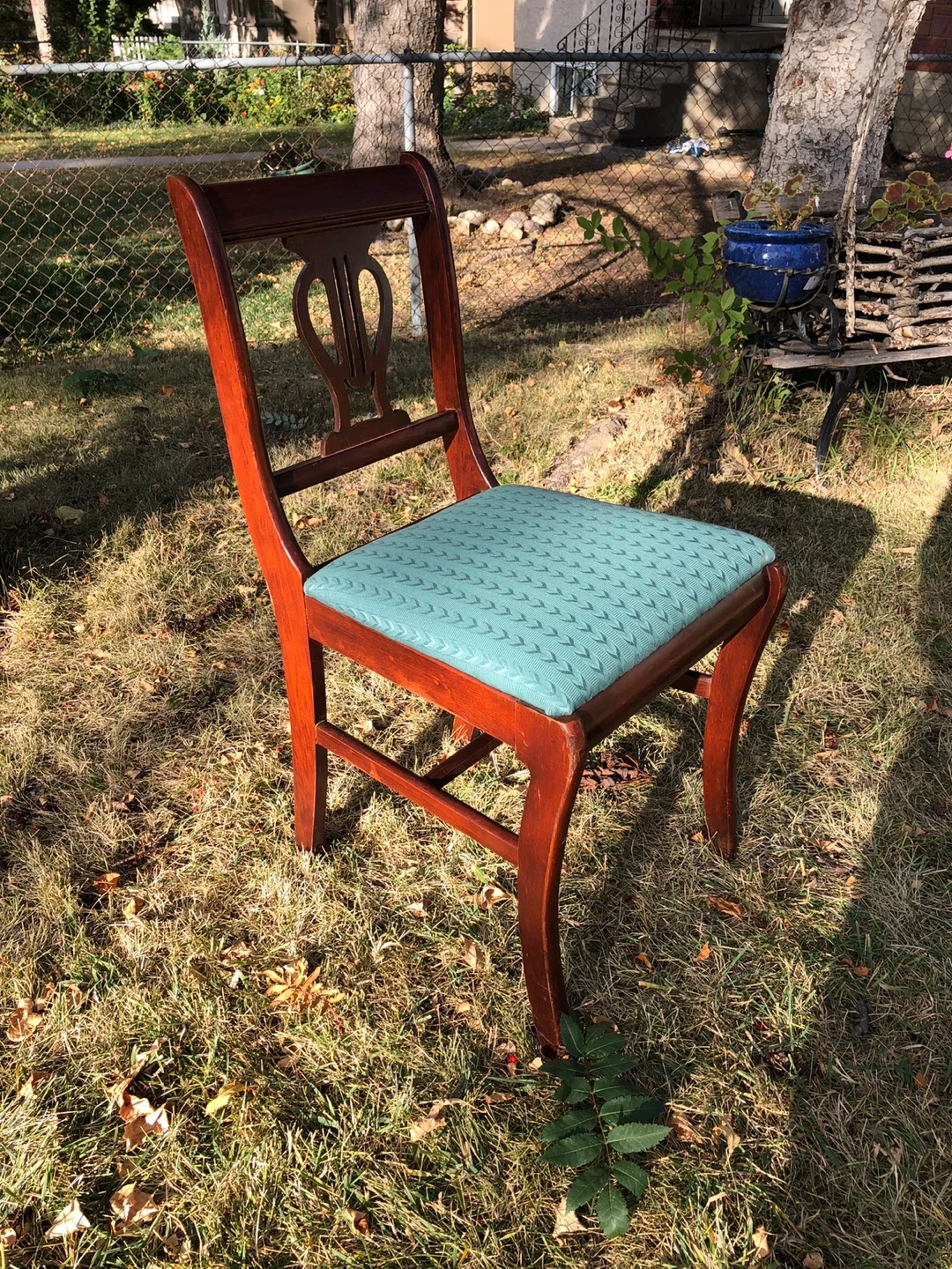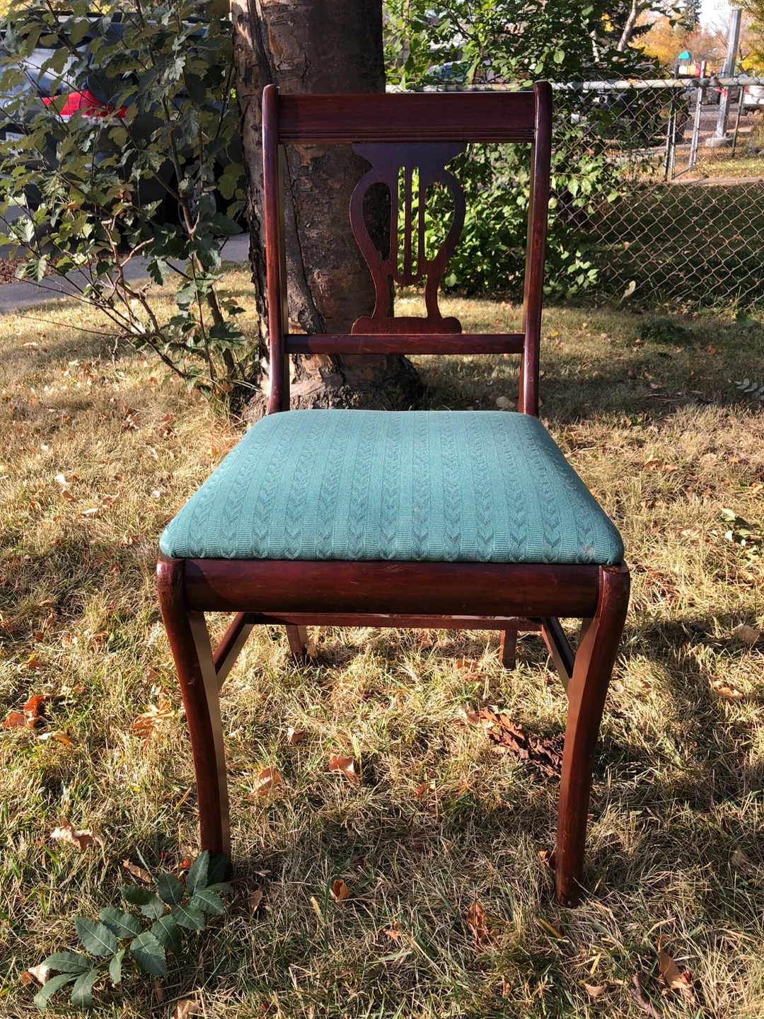 107Selling a lovely, dainty antique-style chair! It features a wooden frame in a rich, dark finish and a patterned, light blue/green (or teal) fabric seat. (It shows some wear consistent with age) Perfect as an accent piece or dining chair!