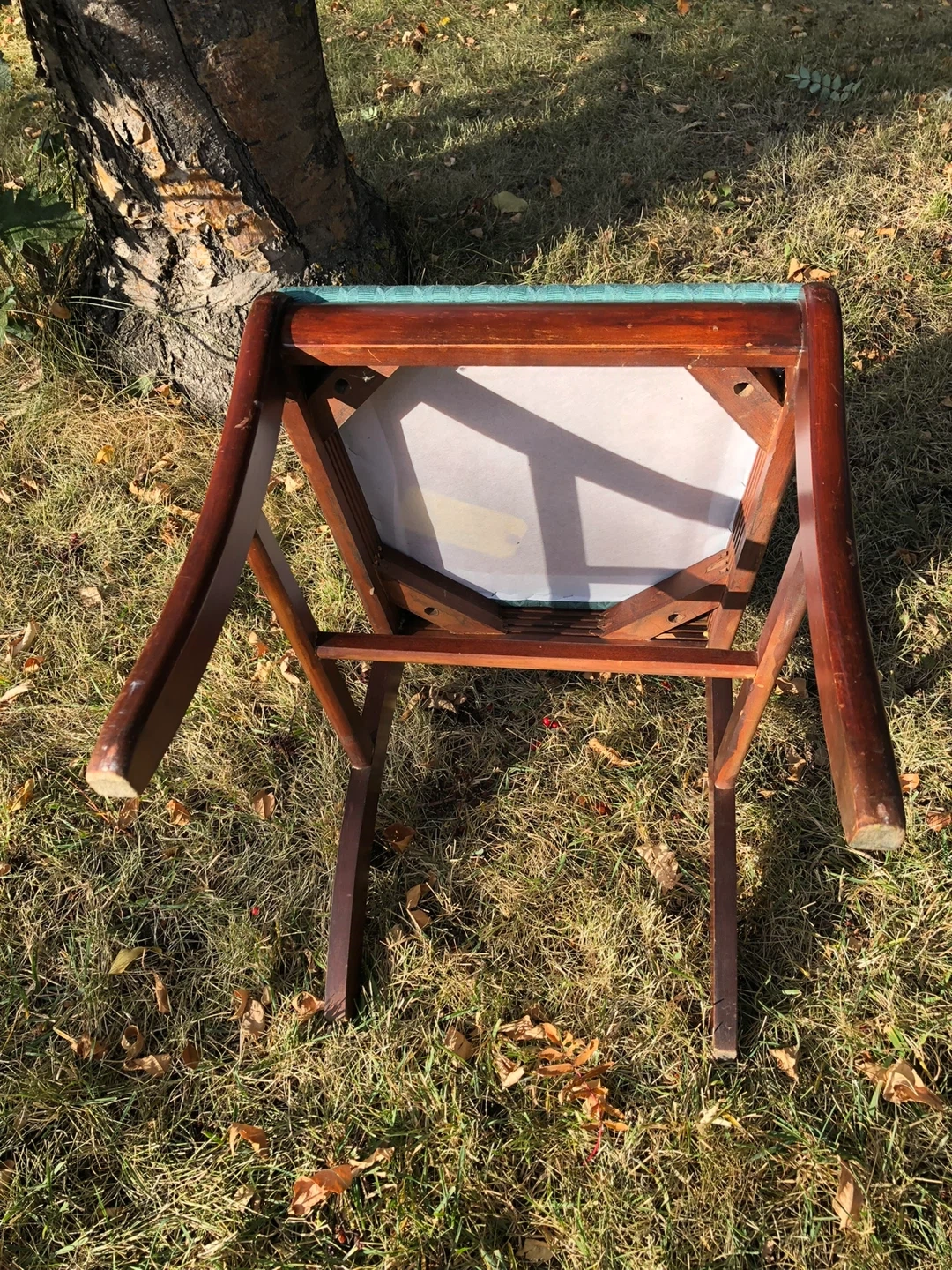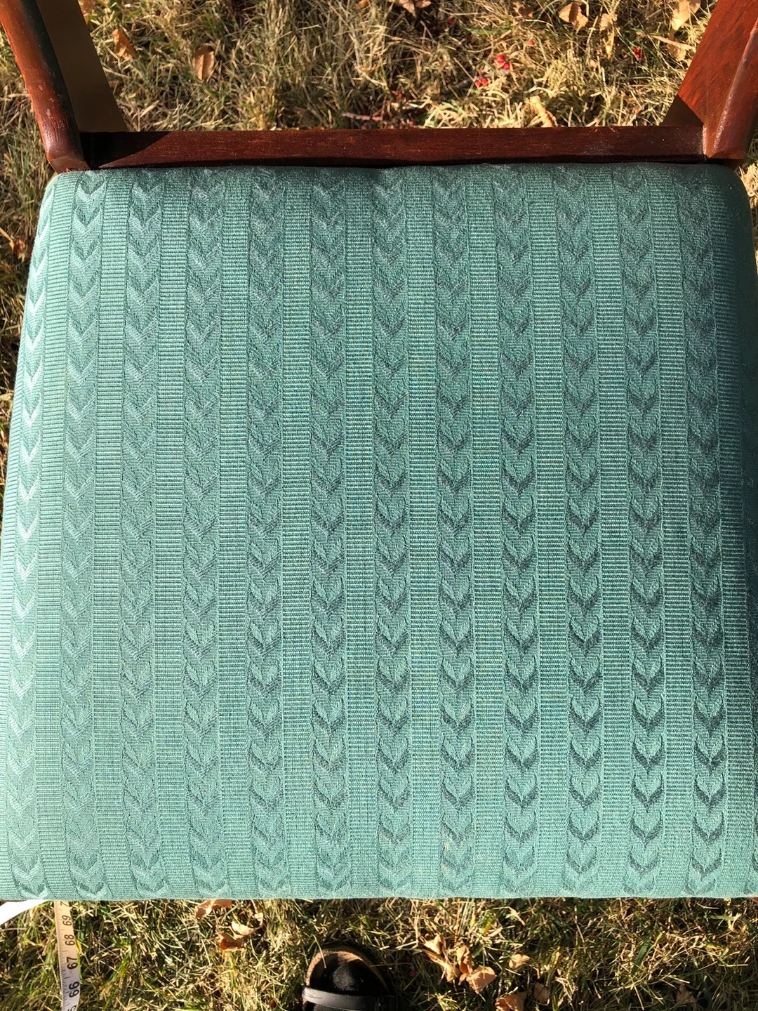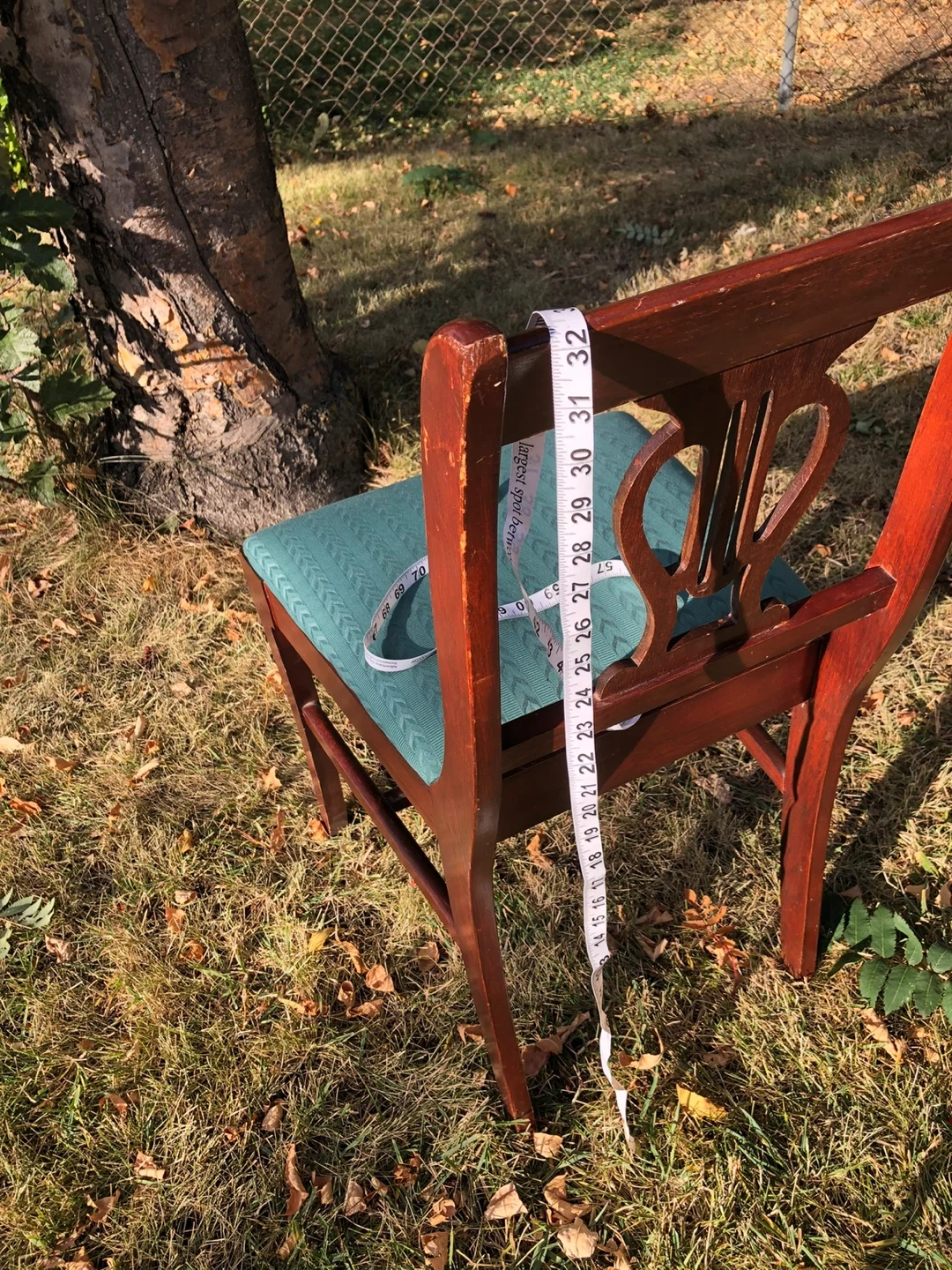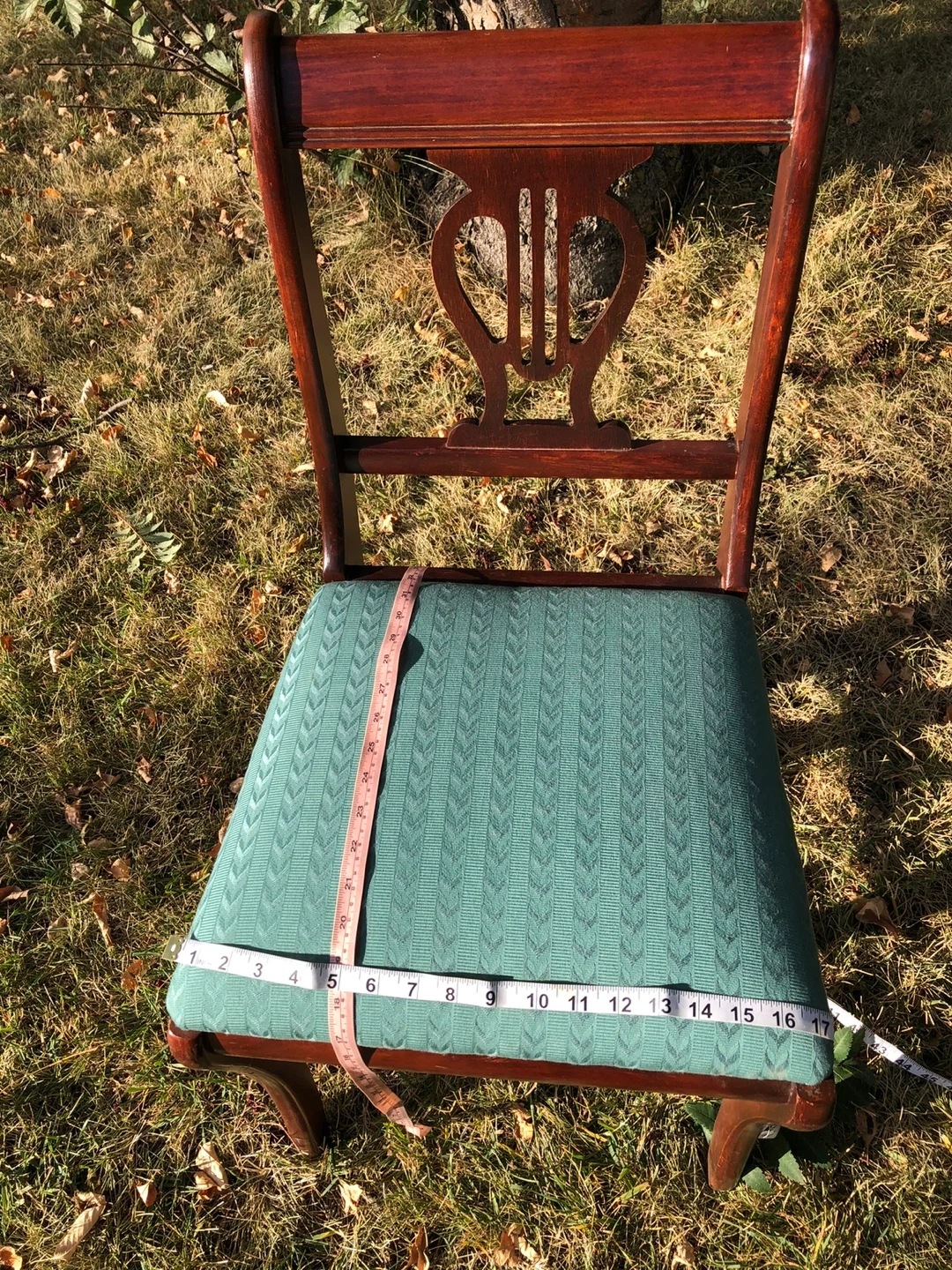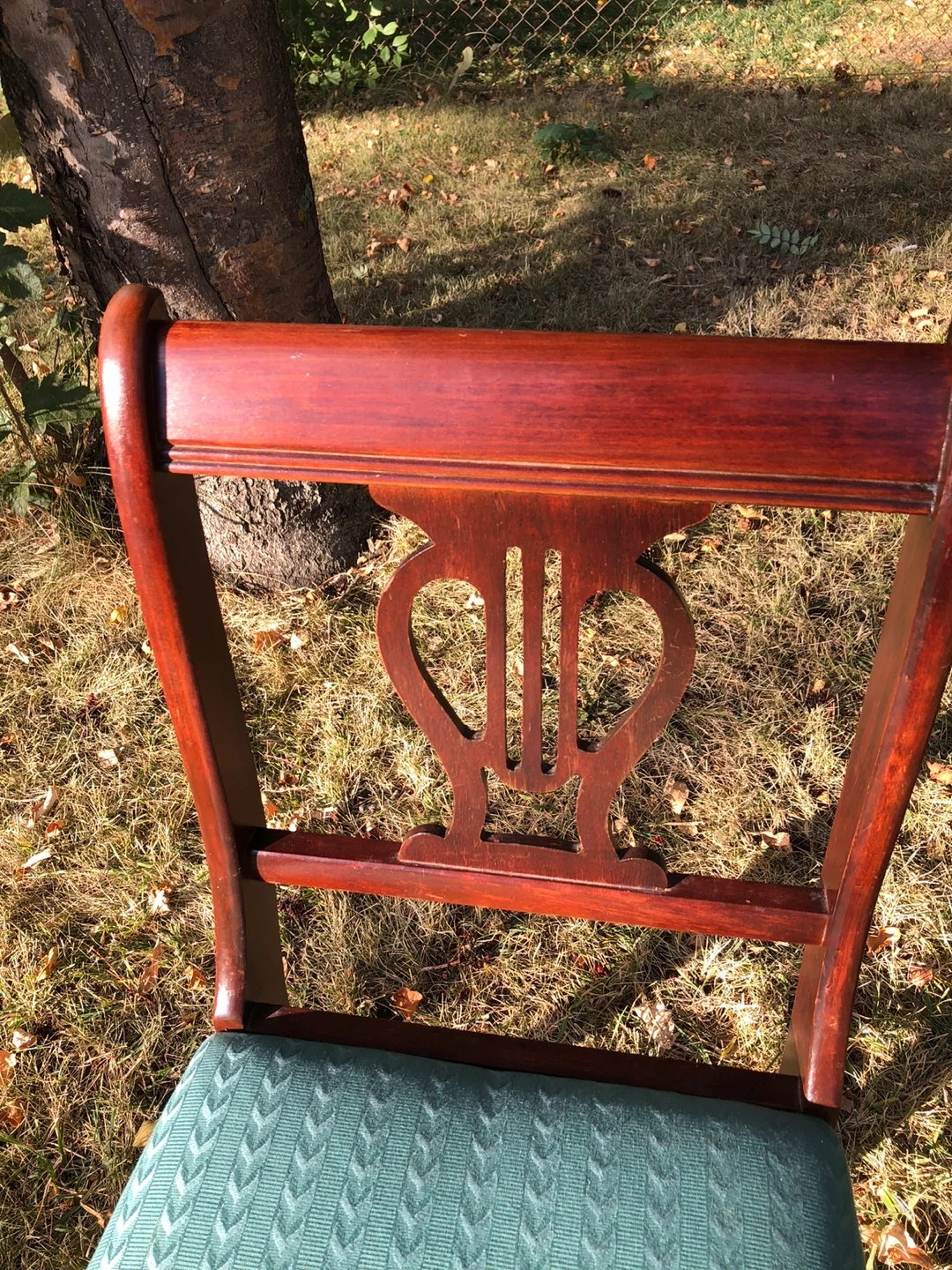 107Selling a lovely, dainty antique-style chair! It features a wooden frame in a rich, dark finish and a patterned, light blue/green (or teal) fabric seat. (It shows some wear consistent with age) Perfect as an accent piece or dining chair!
