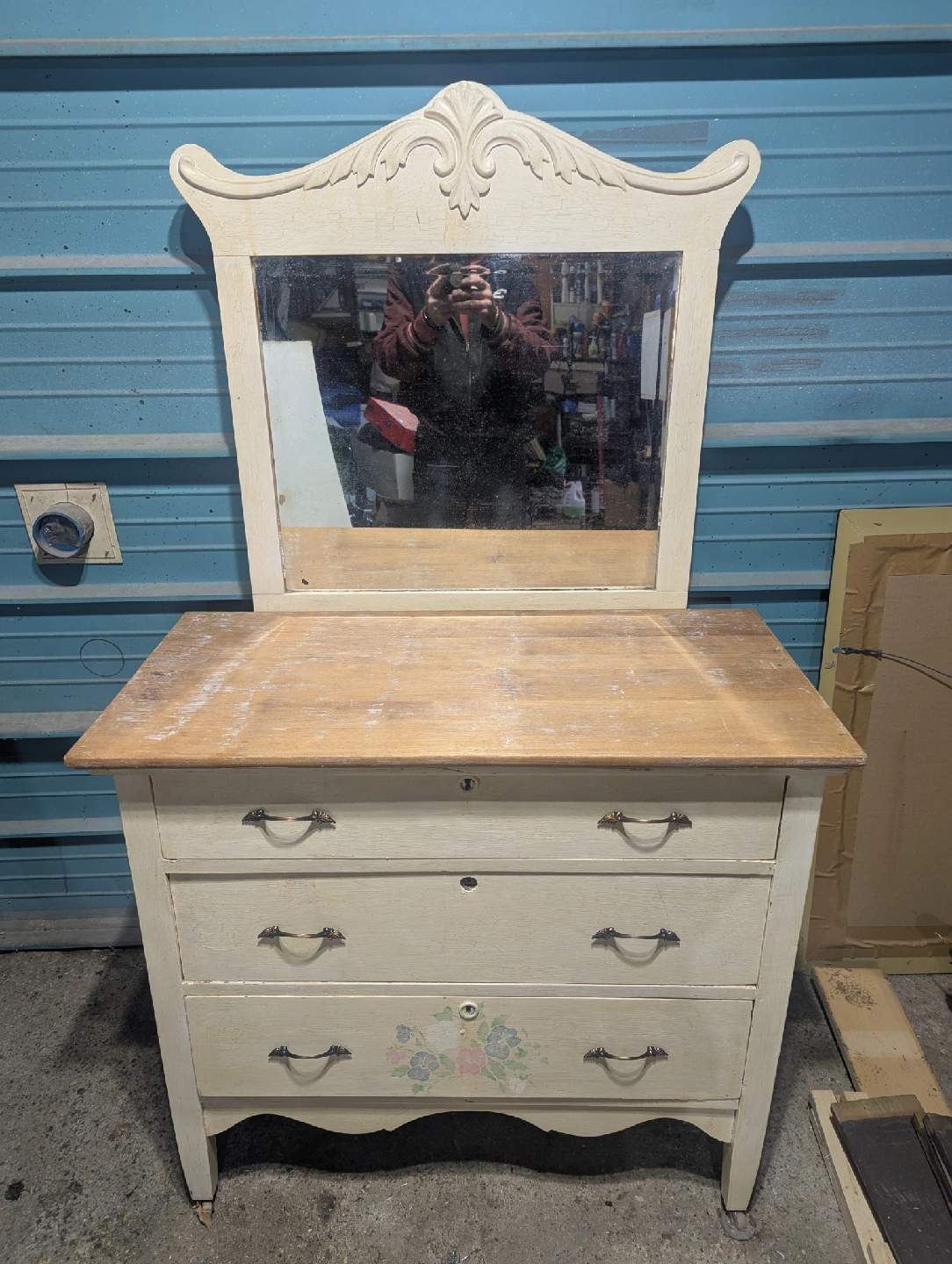 10Selling an antique vanity dresser with a mirror. It features three drawers and a unique design. Started to restore. Measures 18" Deep x 36" Wide x 33" High. With Mirror 61 1/2" High.