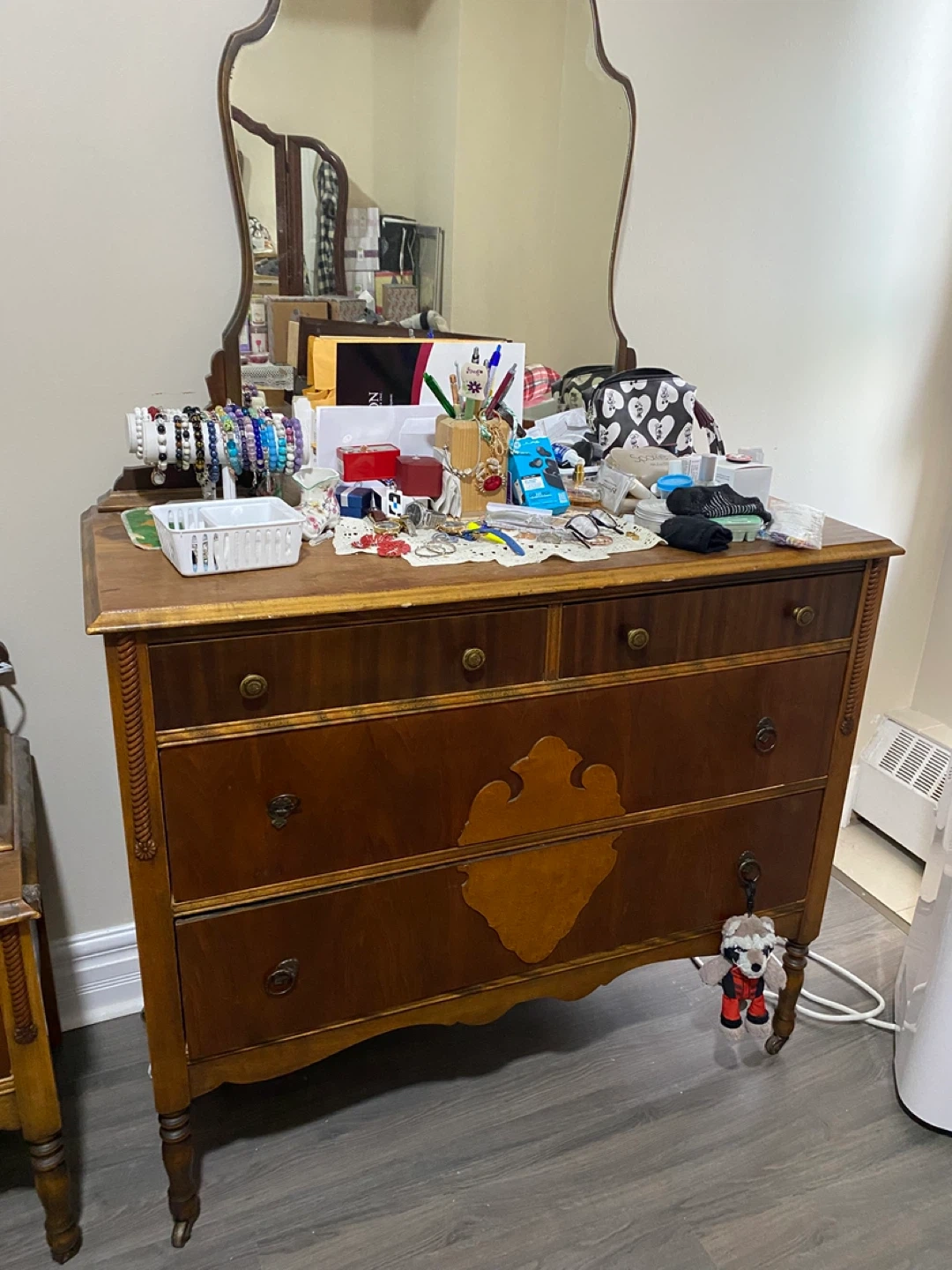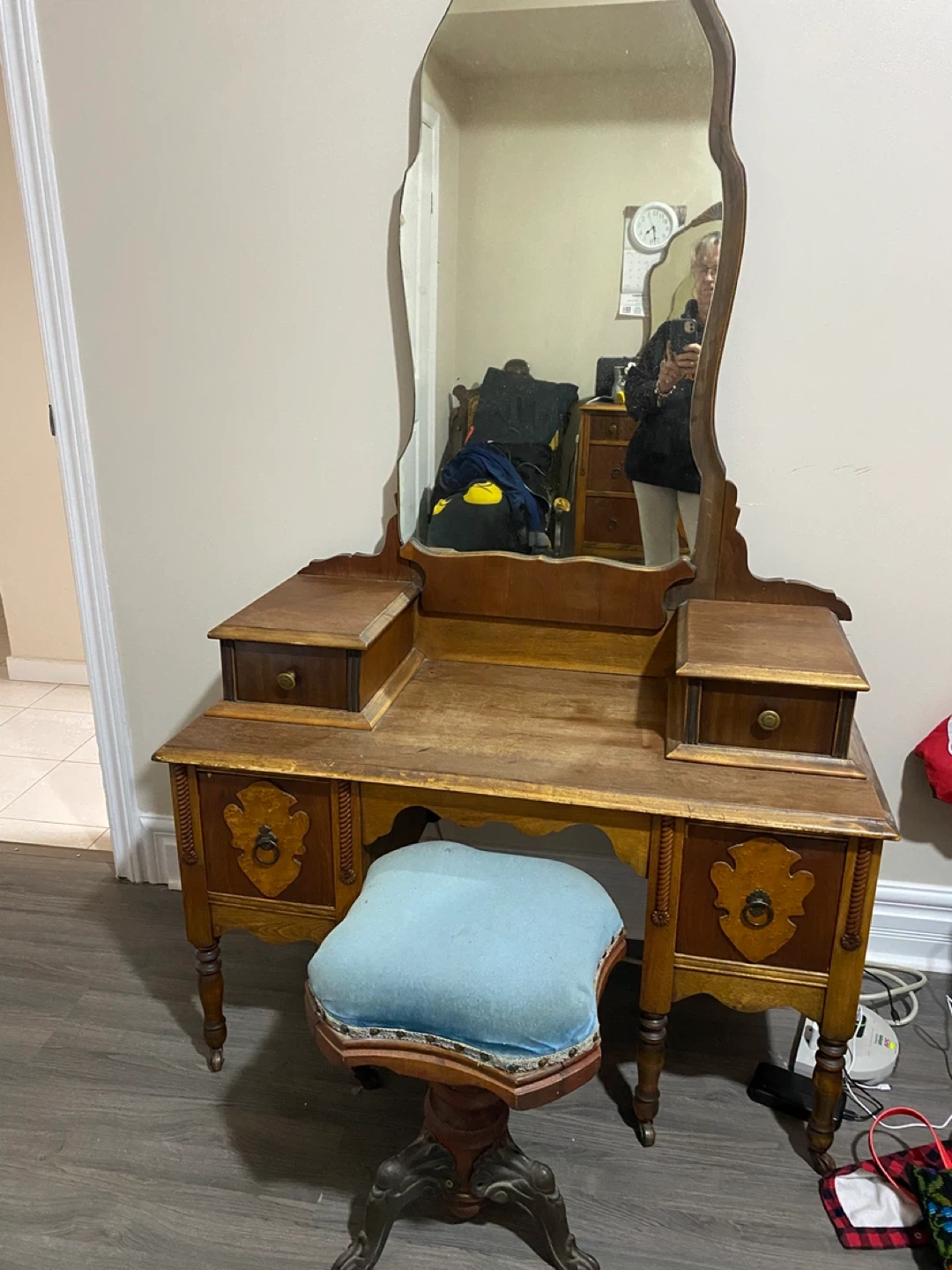 10Selling an antique vanity with a mirror and stool. It features a beautiful, classic design with detailed carvings. The vanity has drawers for storage and the stool has a cushioned seat. Perfect for adding a vintage touch to your bedroom or dressing area
