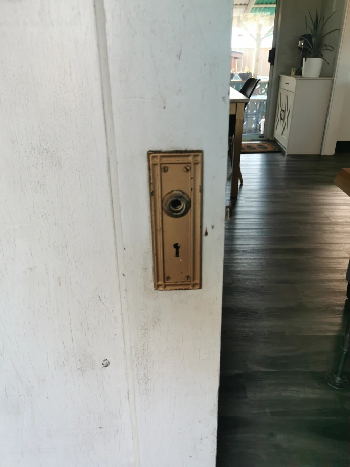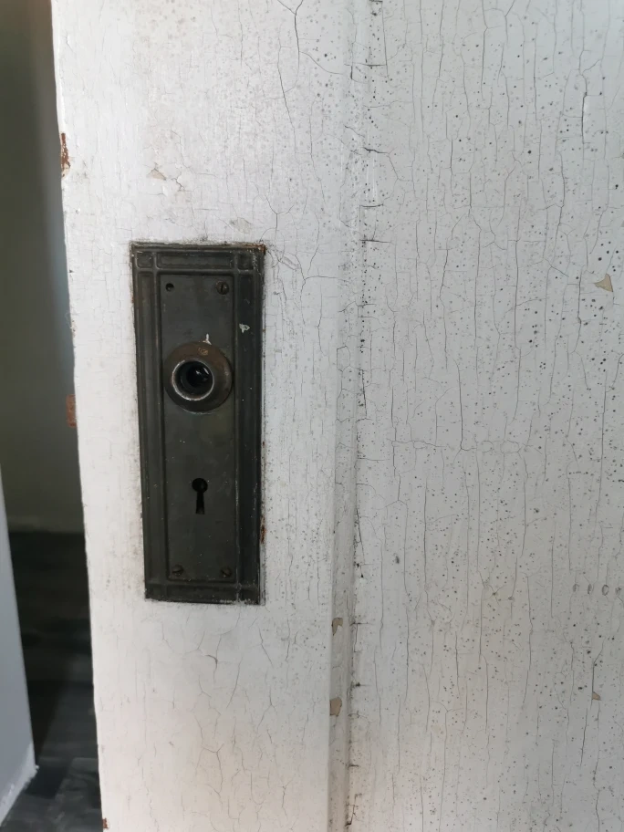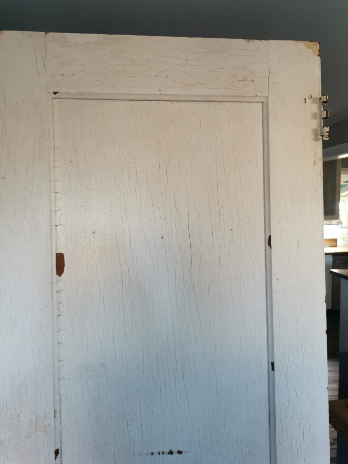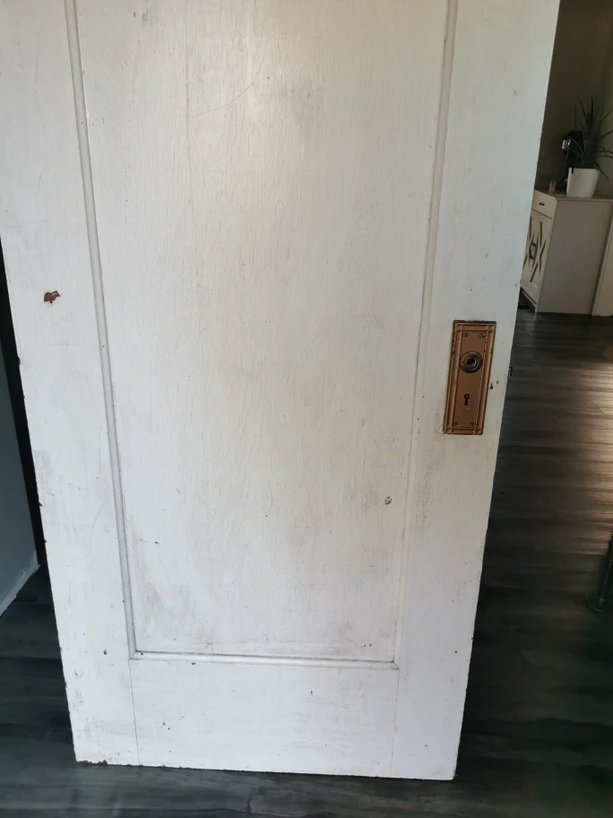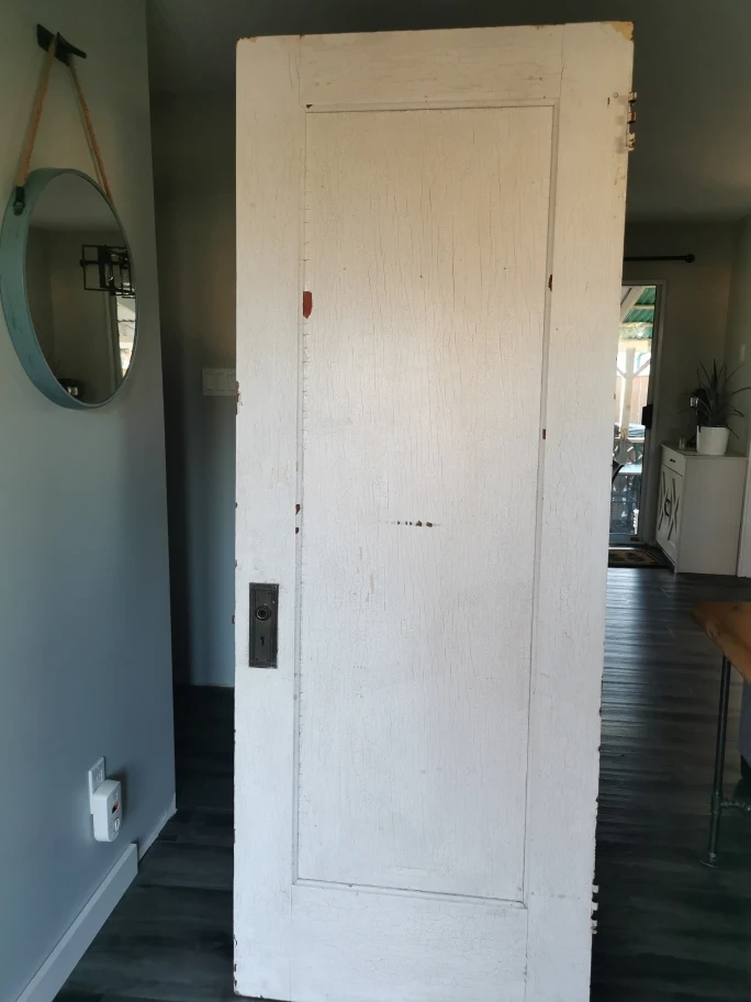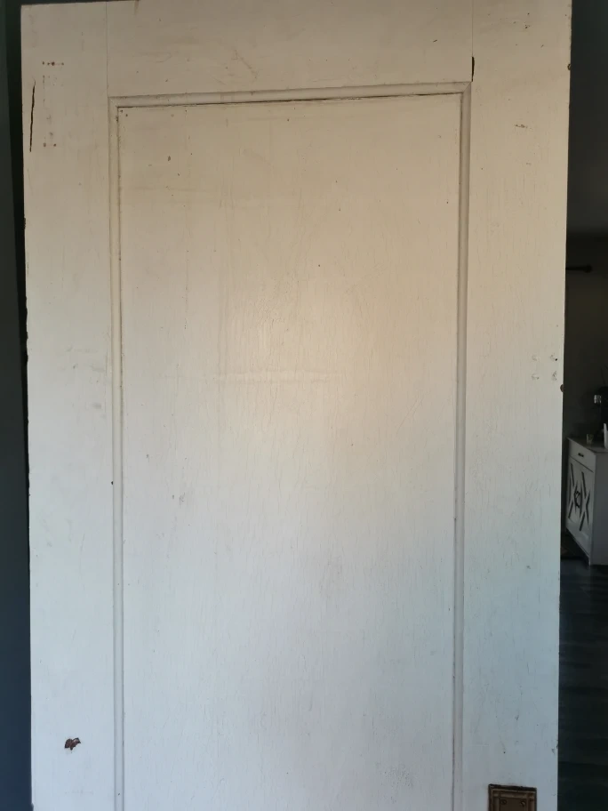 10Vintage pocket door, white paint, distressed finish. Includes original hardware. Some paint chipping and scratches. Great for restoration project or rustic charm.