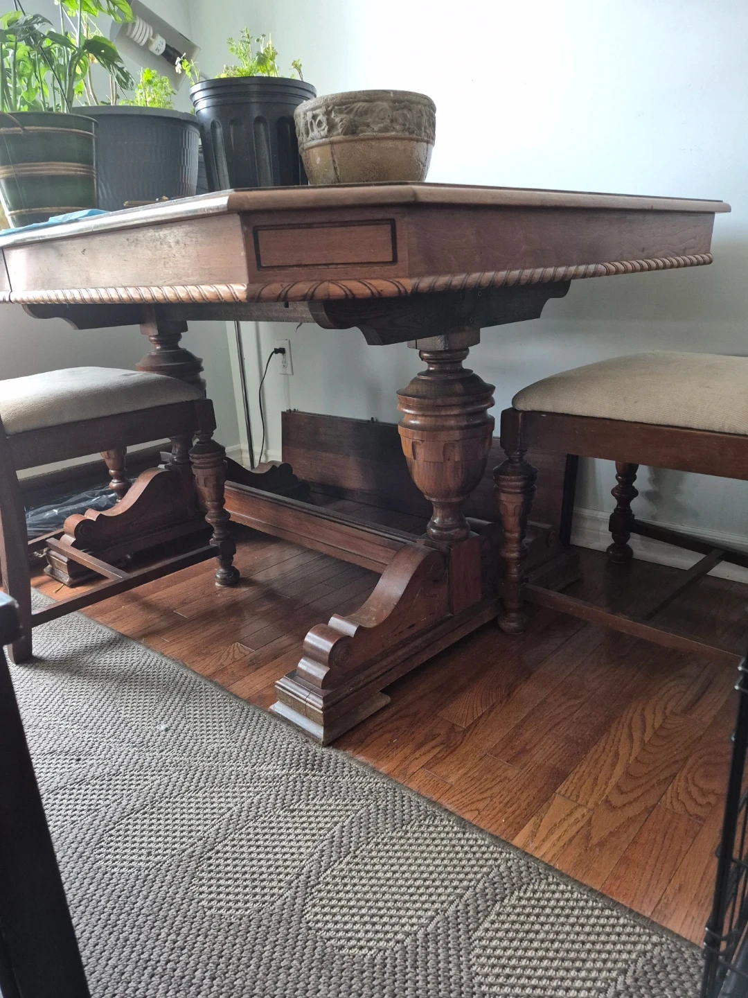 10Selling a beautiful antique wooden dining table that comes with three matching stools! The table has a unique, classic design with detailed carvings on the base. It would be a great addition to any dining room or kitchen, adding a touch of vintage charm