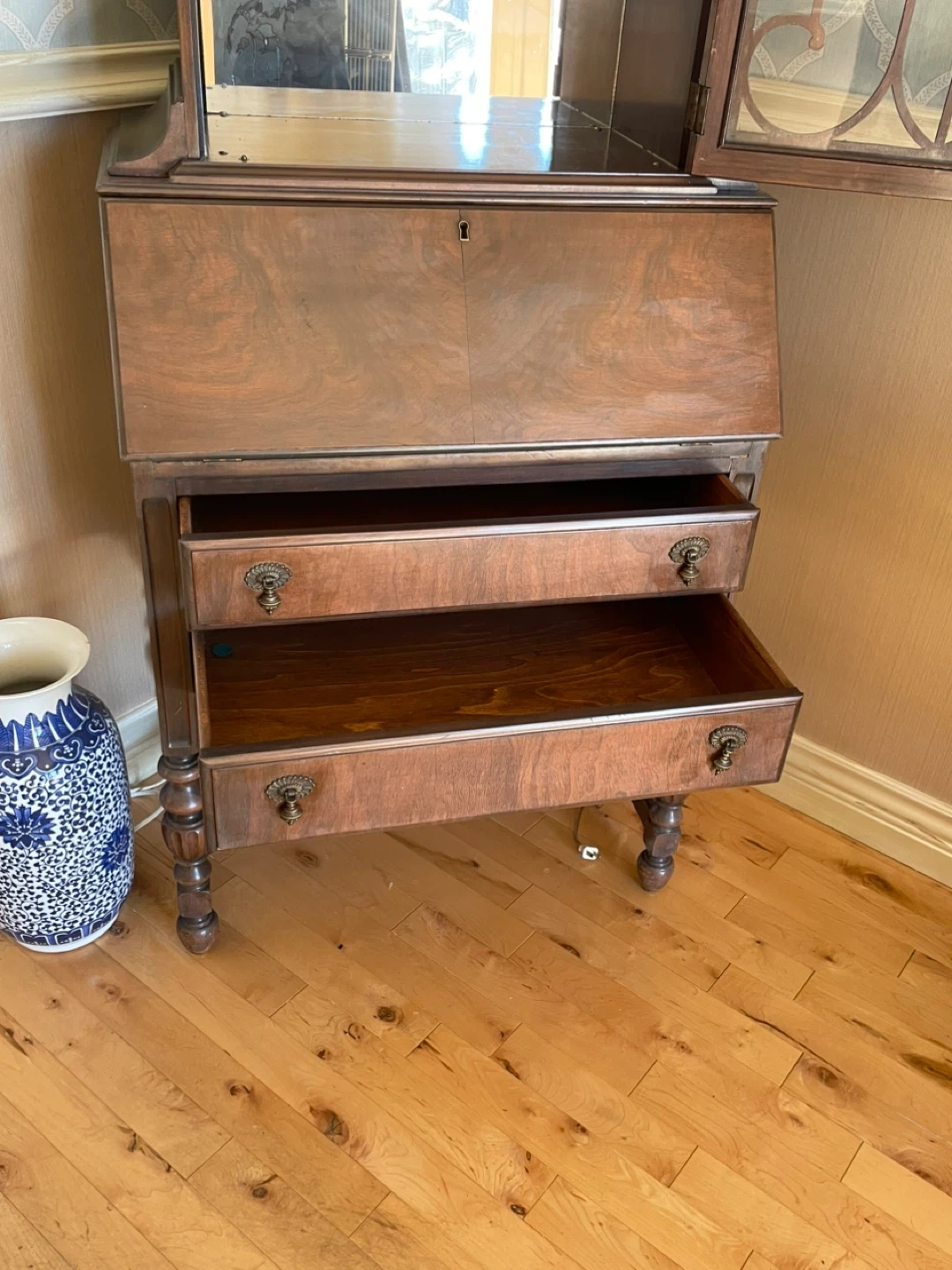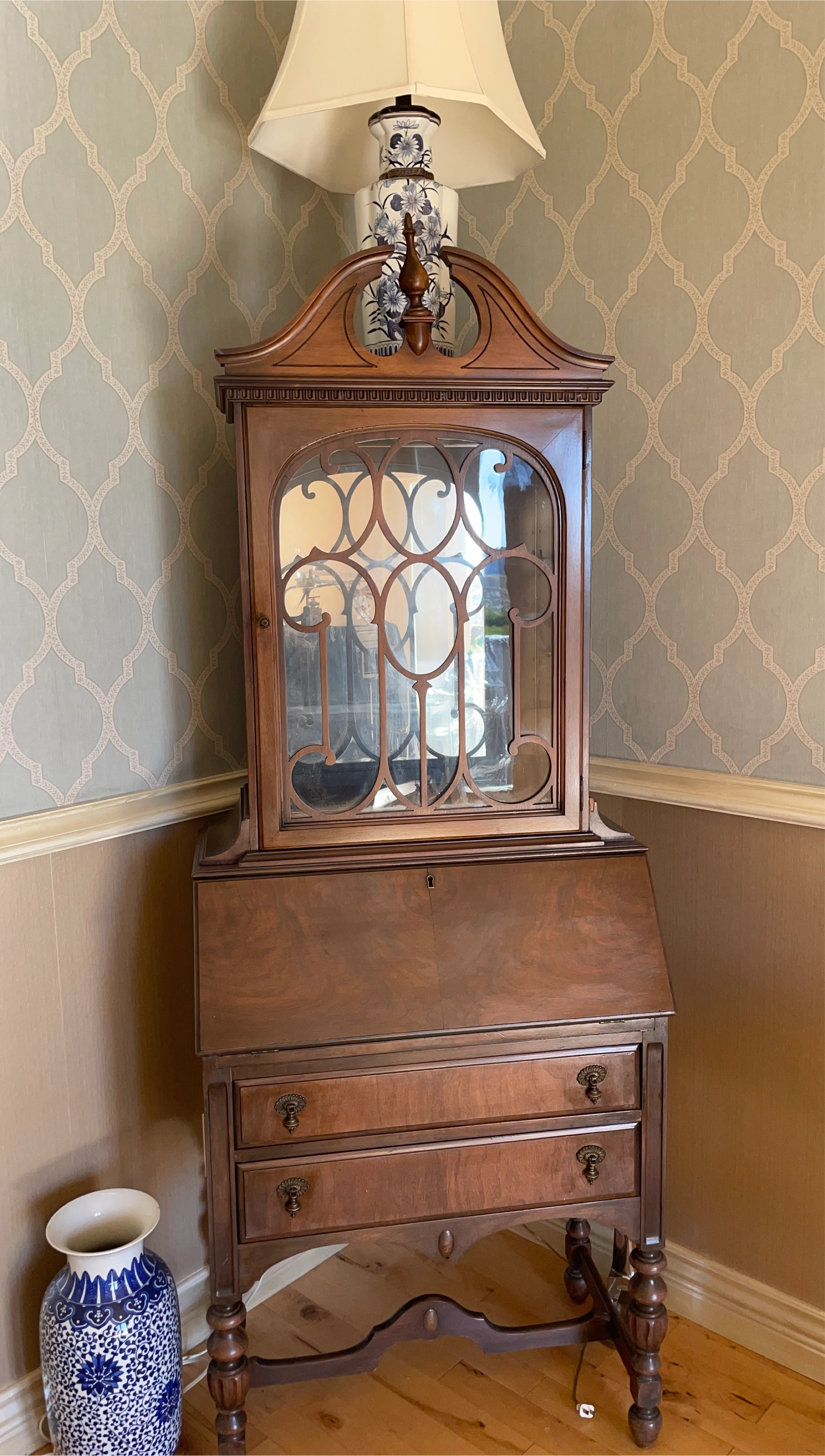Here's a lovely antique wooden secretary desk! It features a glass display cabinet on top and a fold-down writing surface. The piece also includes drawers for extra storage. It's a beautiful addition to any home!