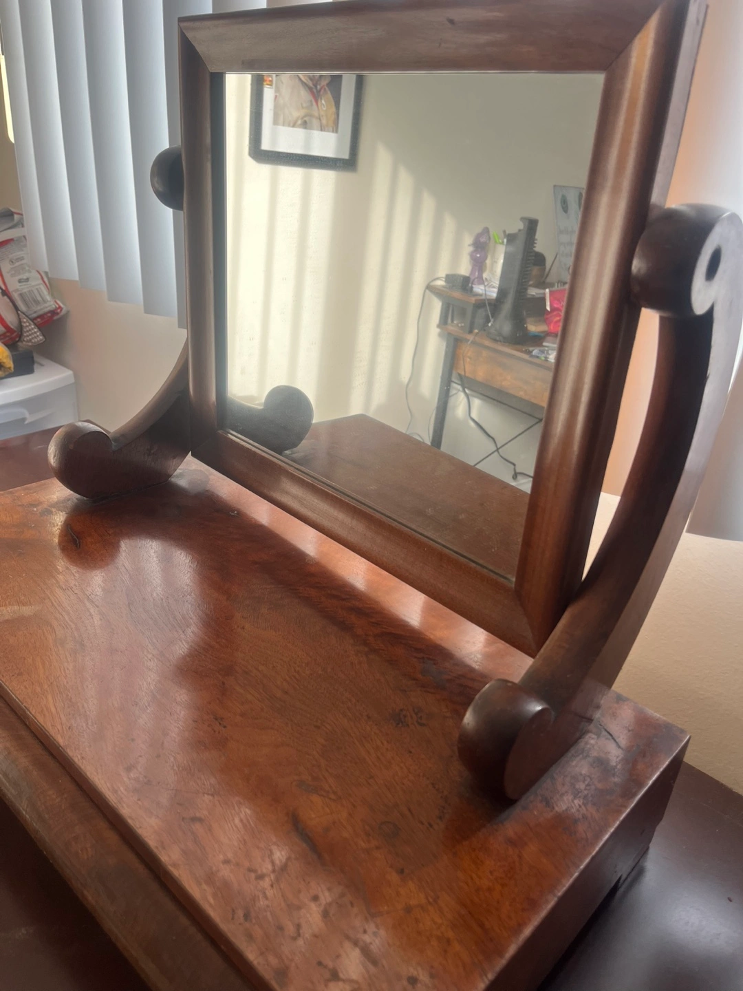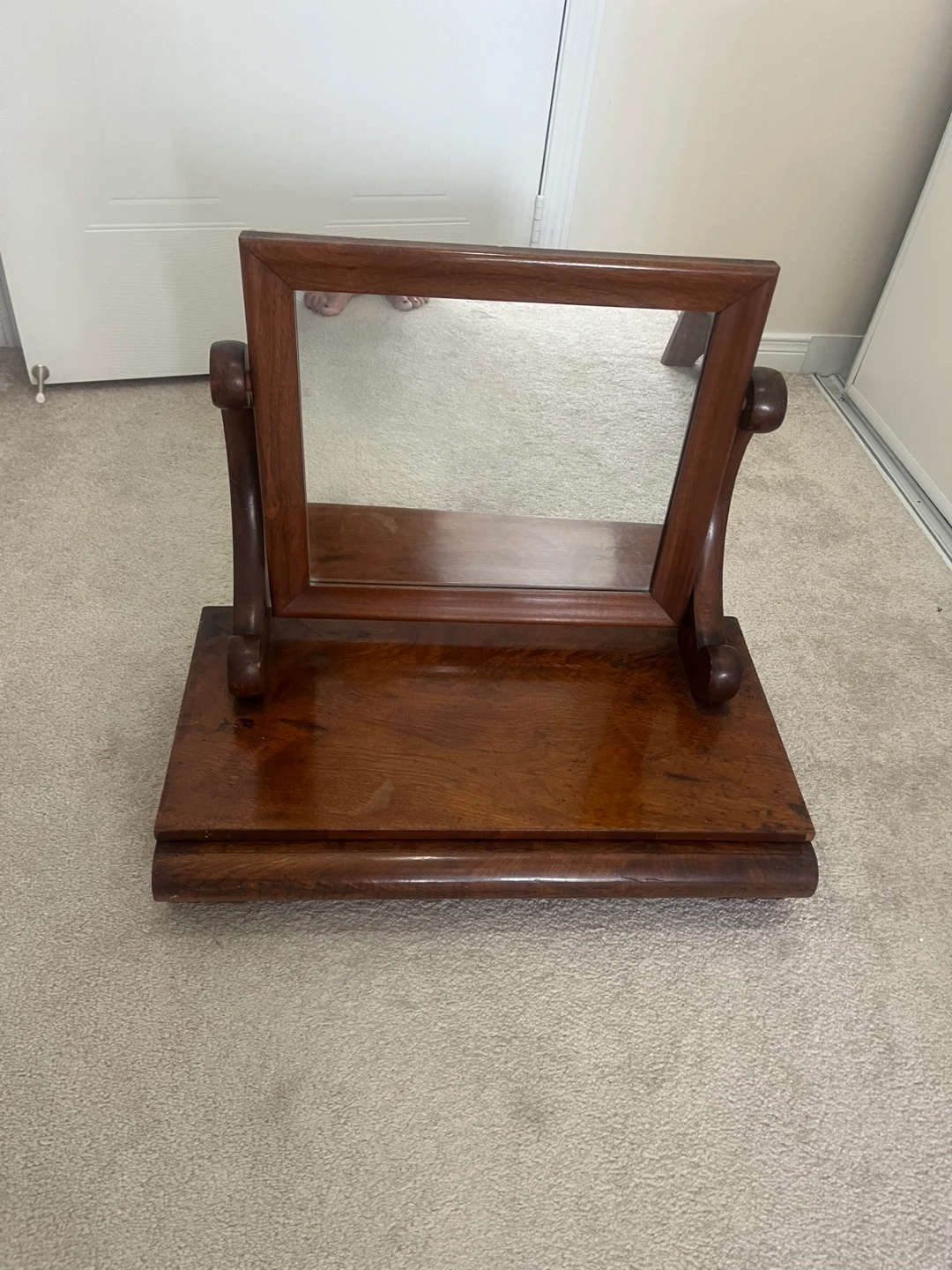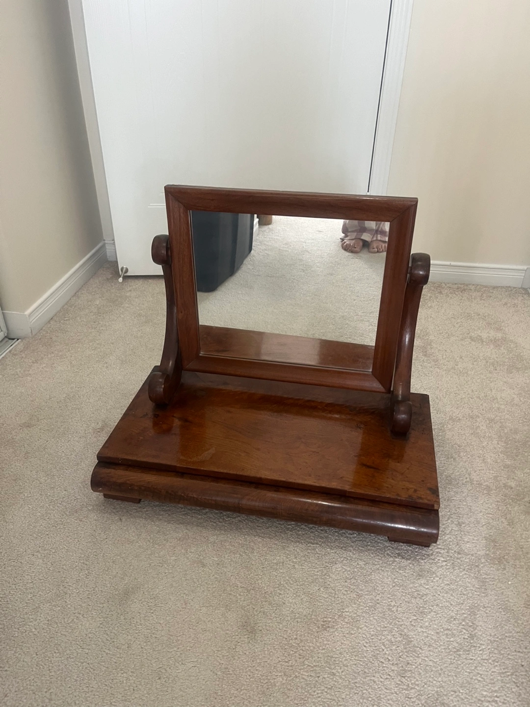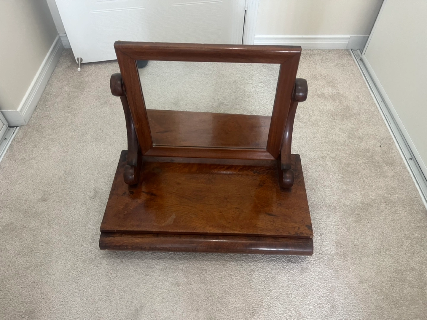 Dark wood antique vanity mirror. Features a tilting mirror and a small drawer. Excellent for a vintage or antique setting. Shows some signs of age and wear. Would be a great refinishing project!