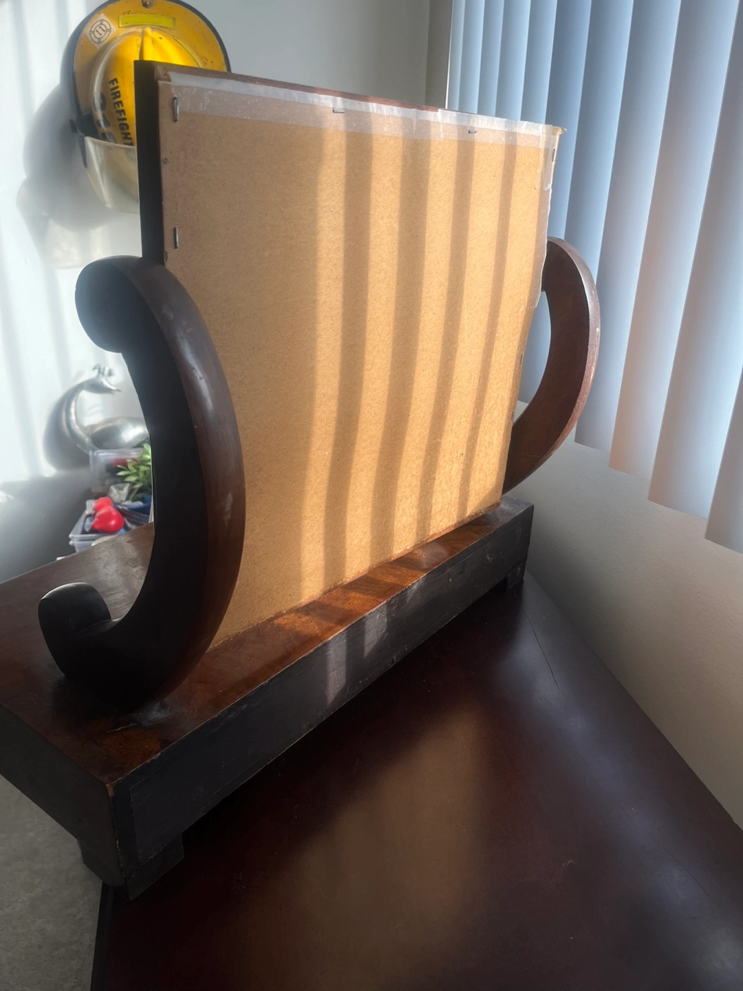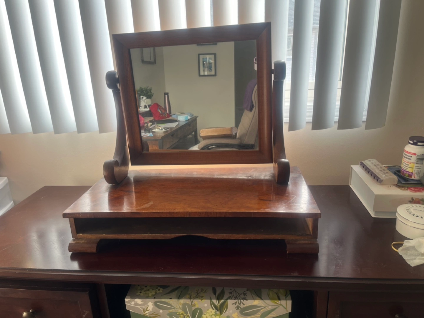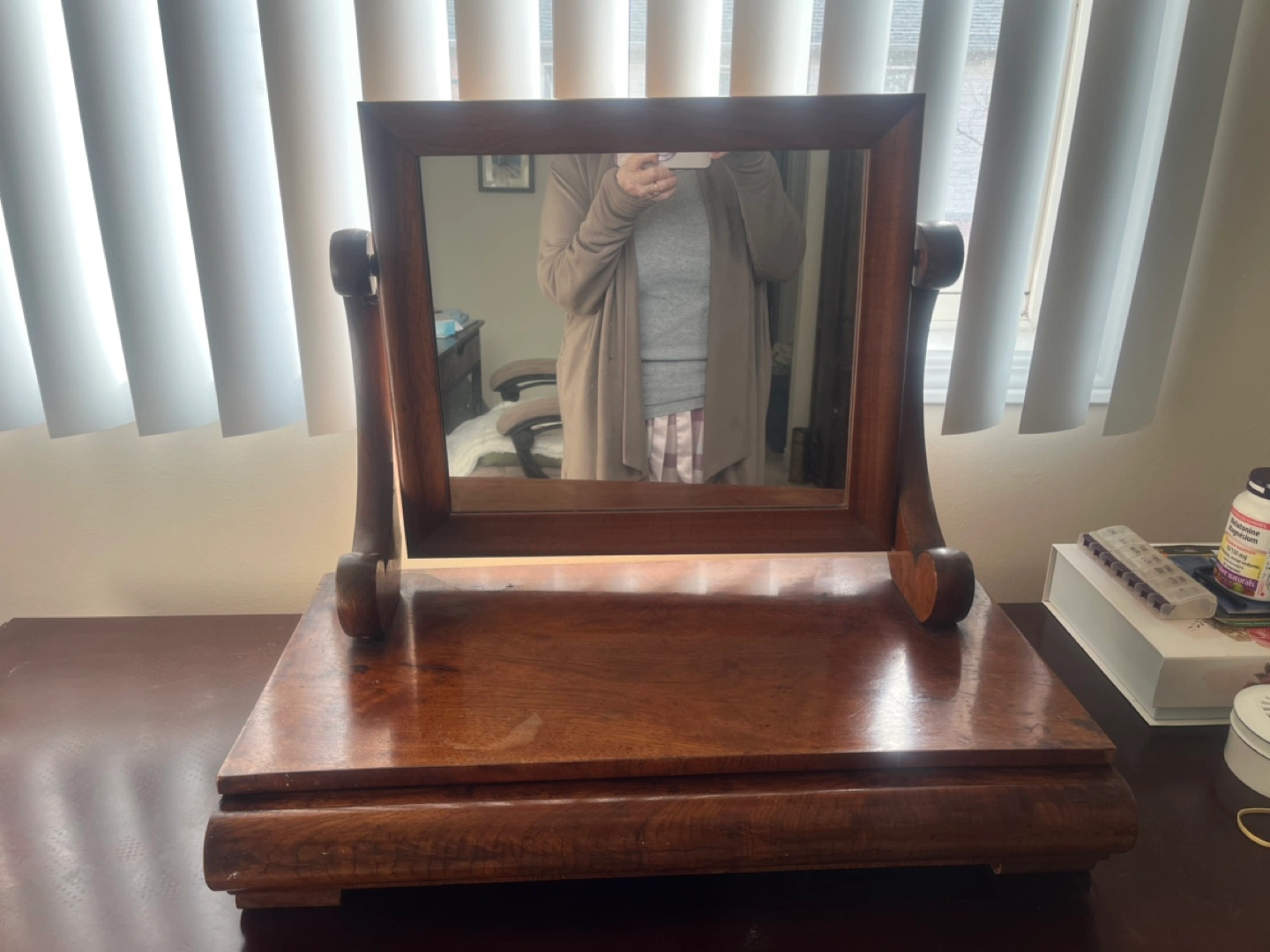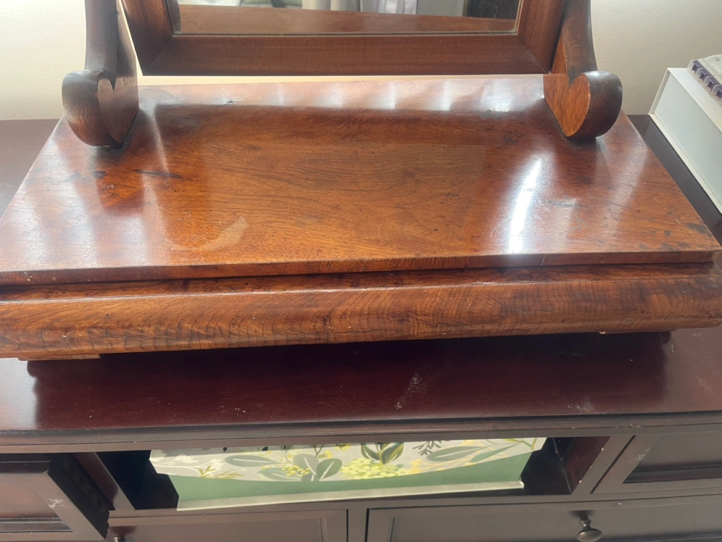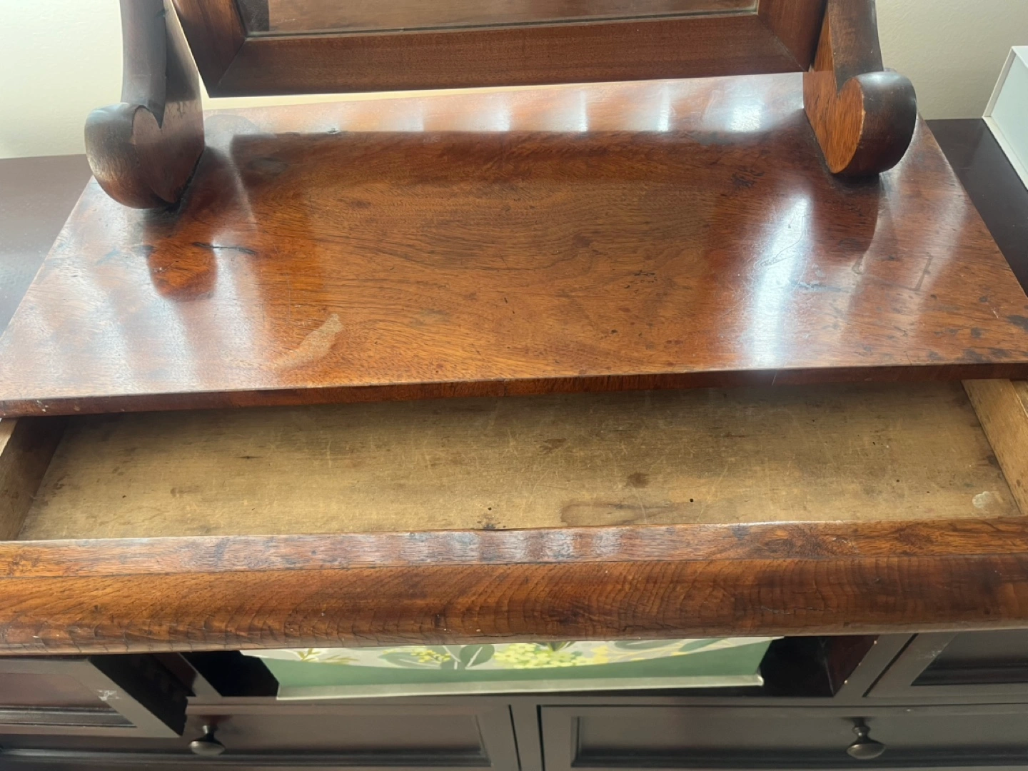 Dark wood antique vanity mirror. Features a tilting mirror and a small drawer. Excellent for a vintage or antique setting. Shows some signs of age and wear. Would be a great refinishing project!