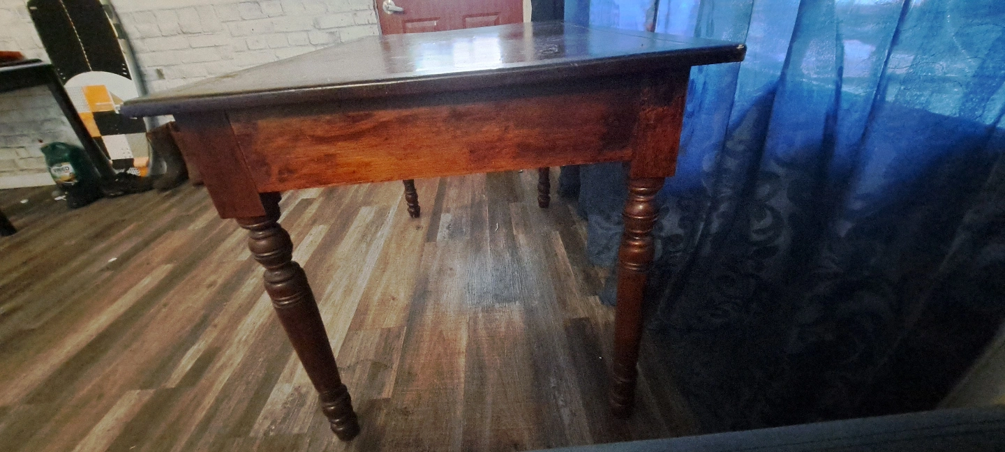Dark brown wood writing desk. One drawer. Turned legs. Perfect for a vintage or rustic space. If interested, send me a message. -David